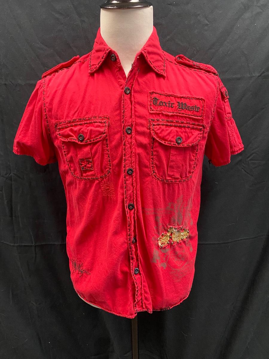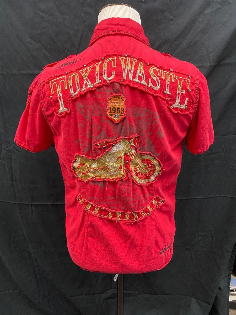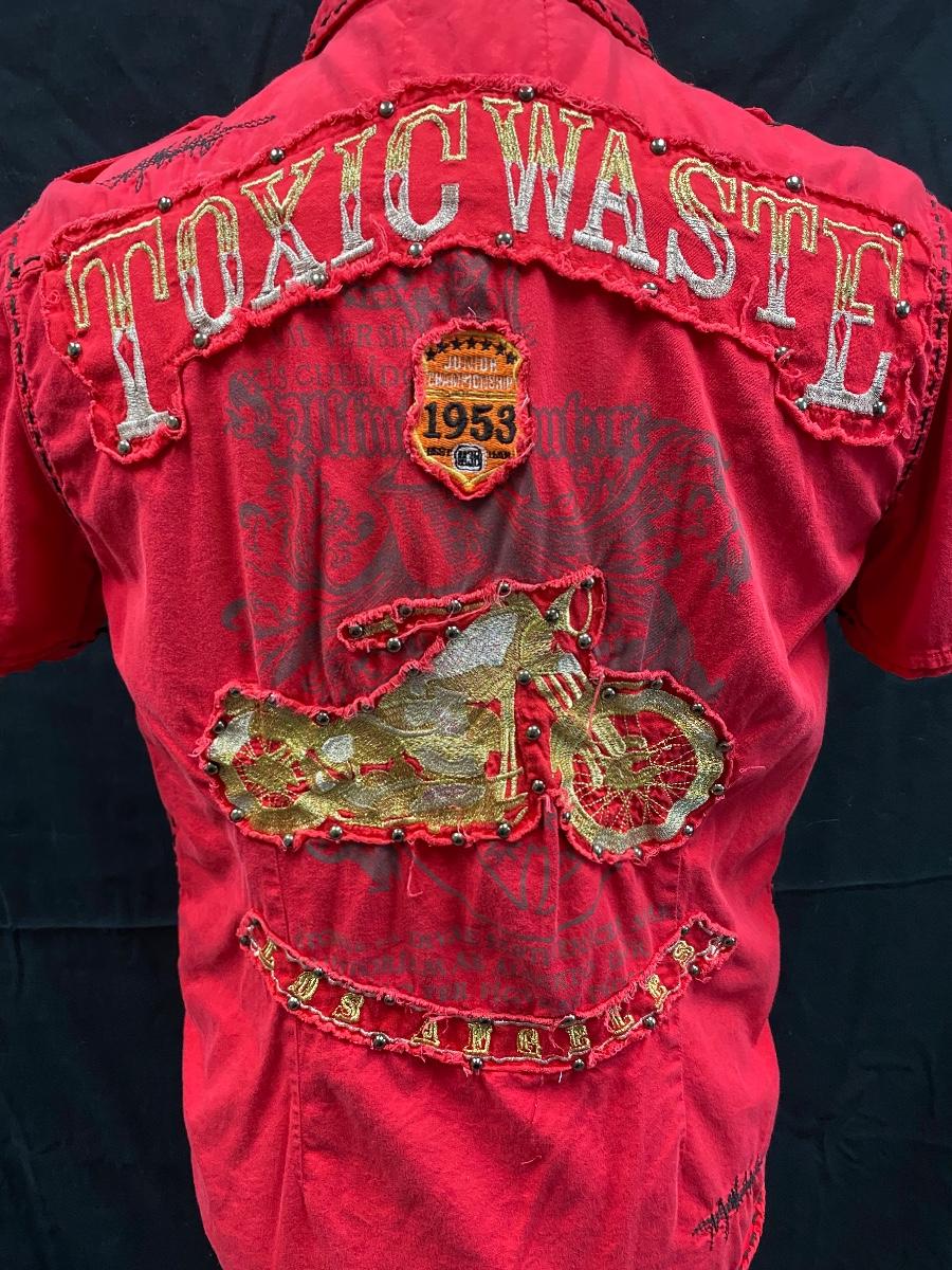 Men's Toxic Waste Los Angeles Distressed Motorcycle Red Button Front Shirt Medium