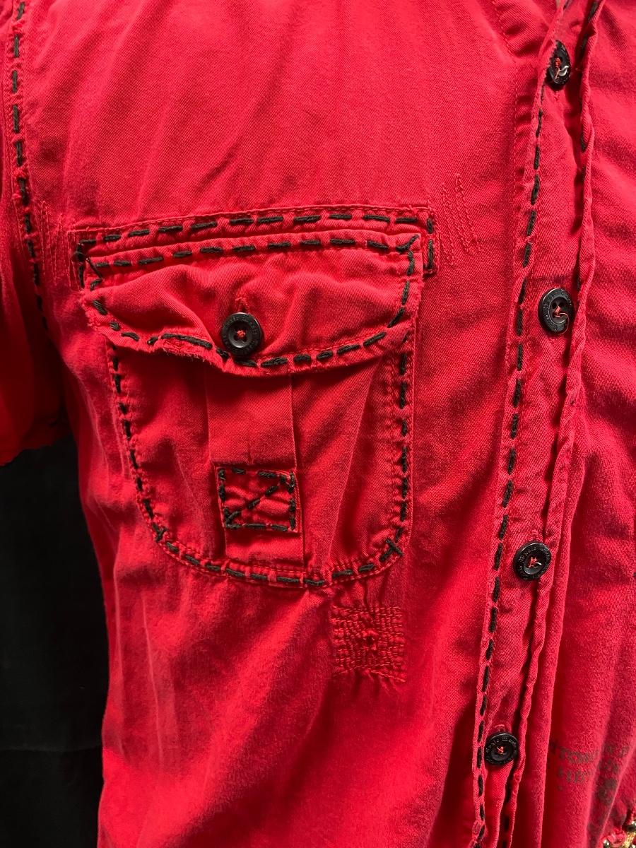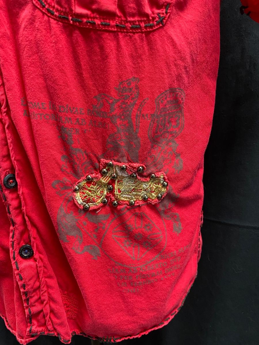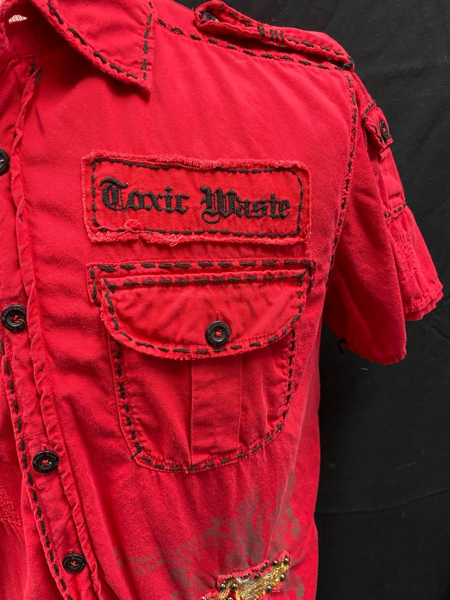 Men's red button front distressed shirt from Toxic Waste Los Angeles. Distressed and embroidered, black stitching. Size medium. Good condition.