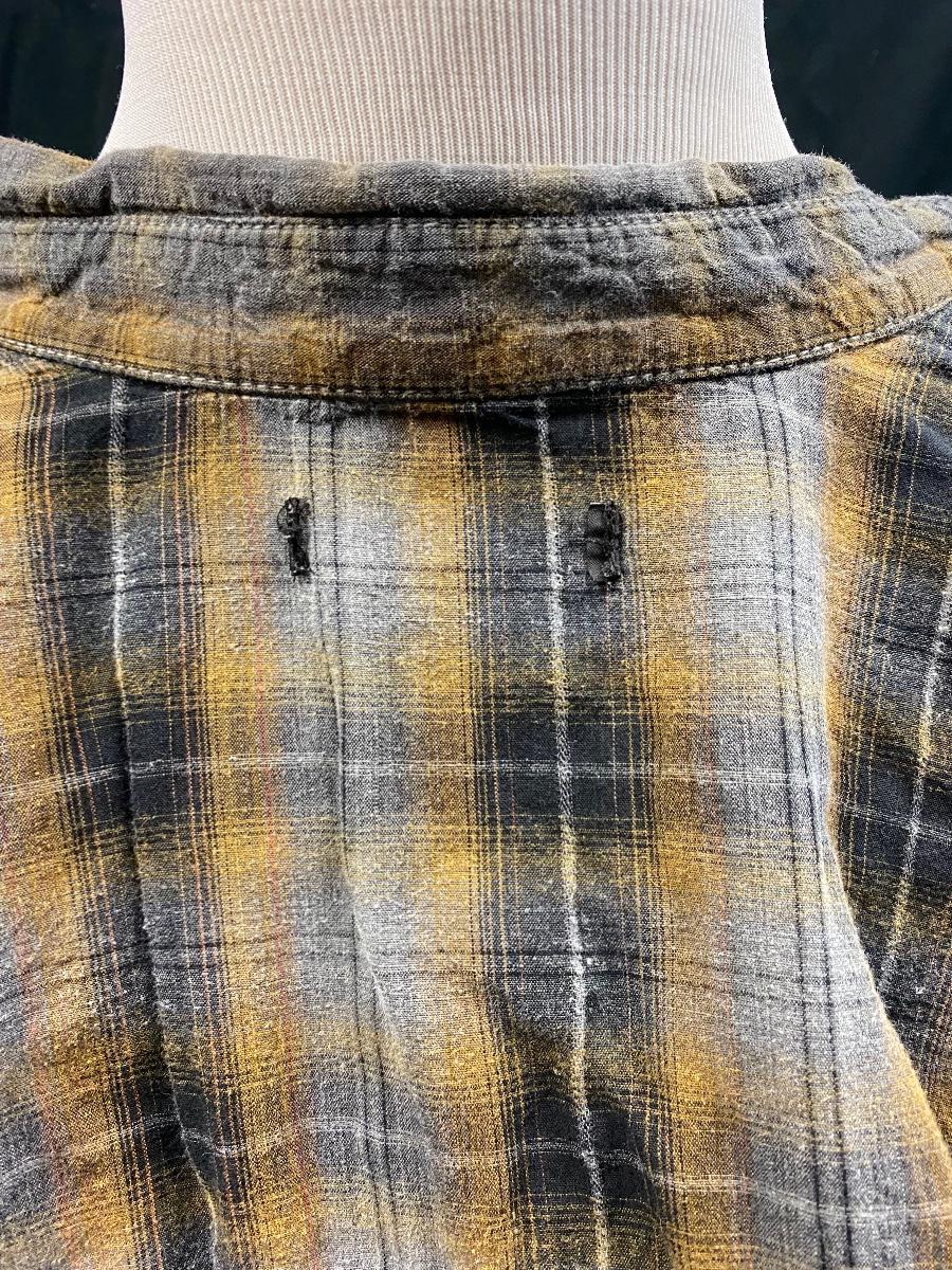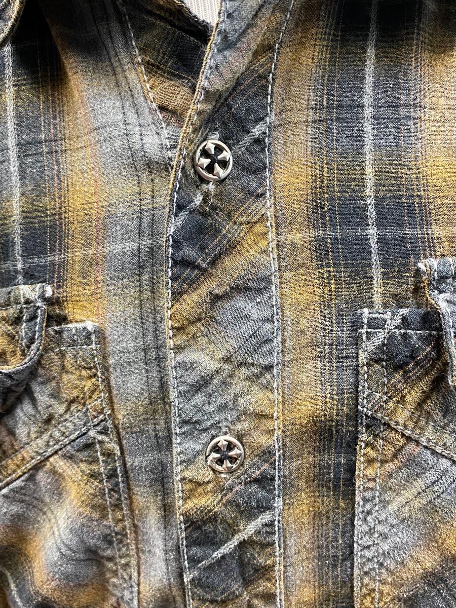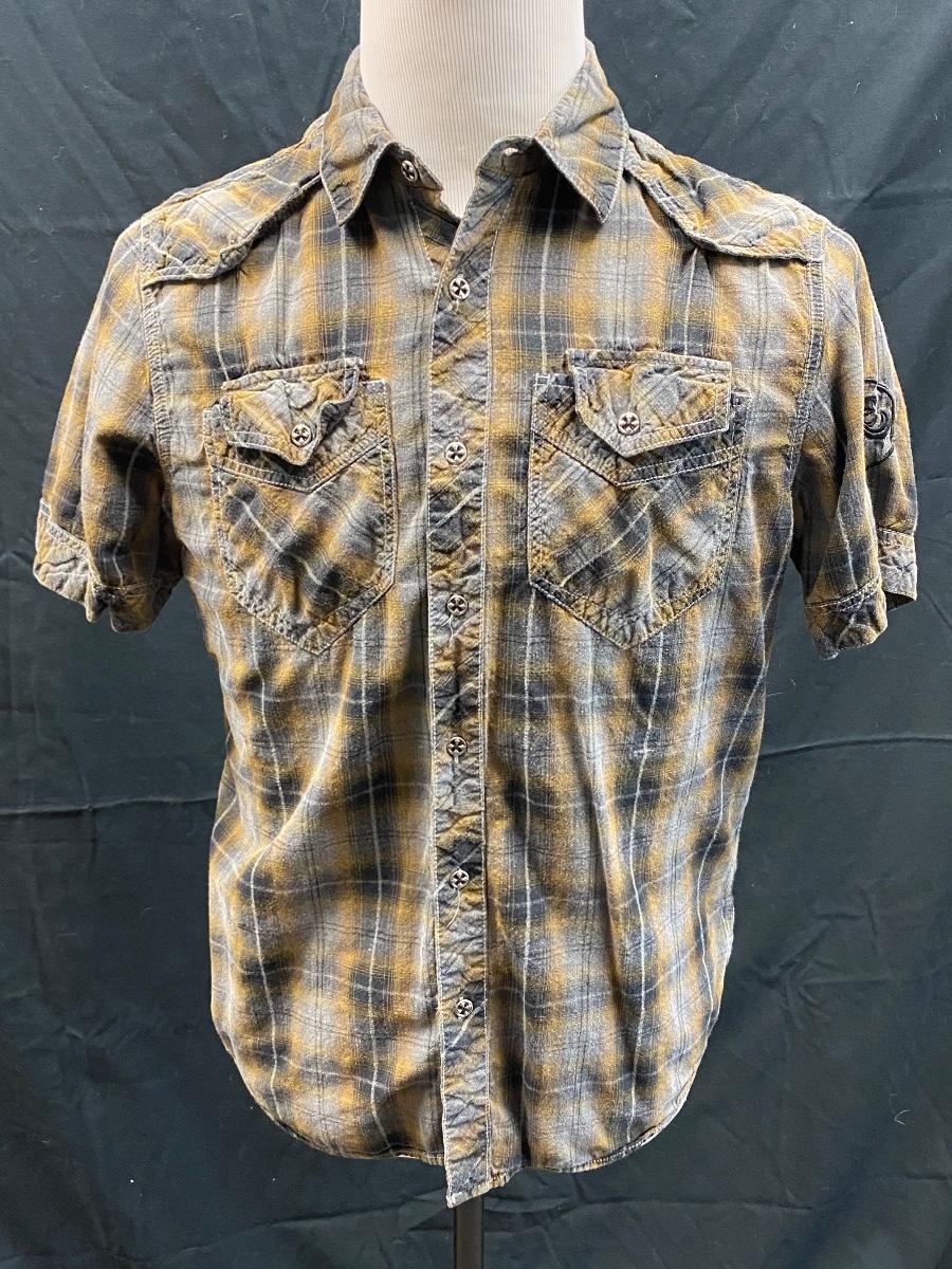 Men's western style plaid button front shirt from Affliction. Orange brown plaid short sleeve shirt, embroidered across the shoulders on the back. Size tag removed, looks like a medium or slim fit large.