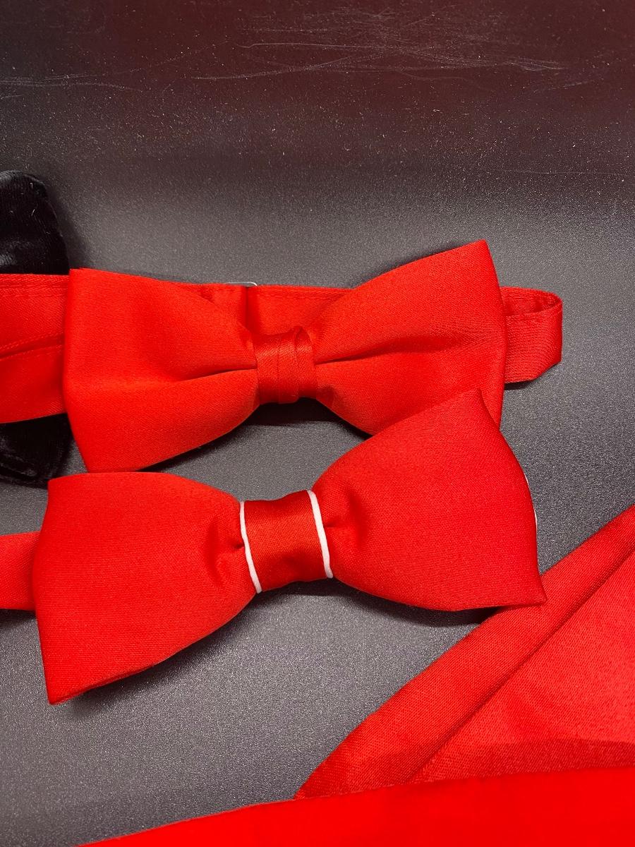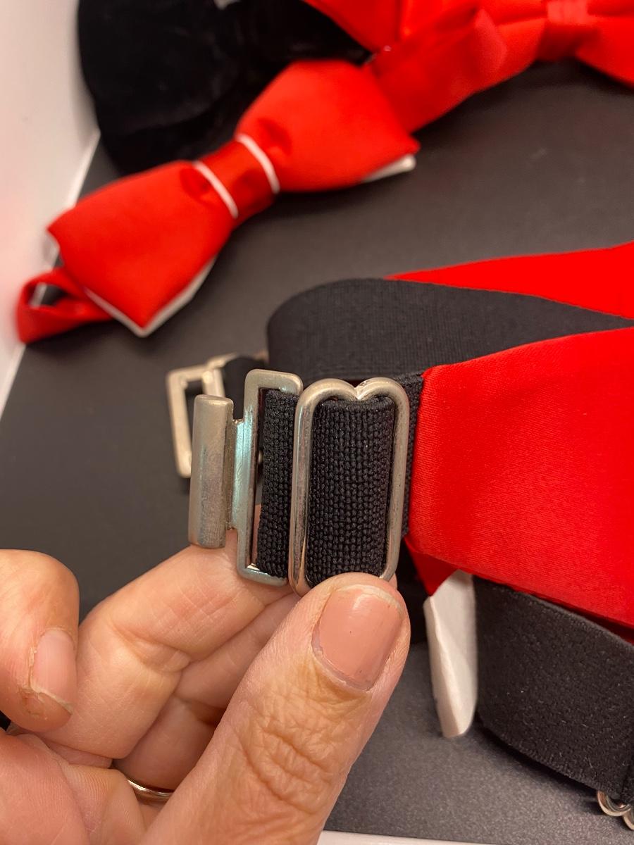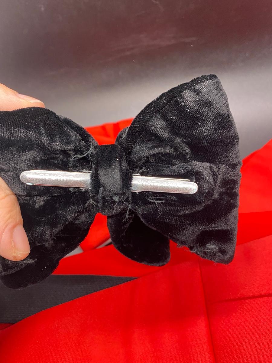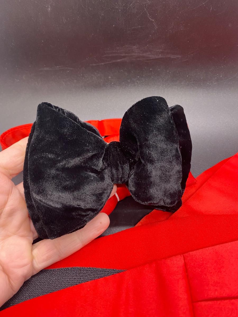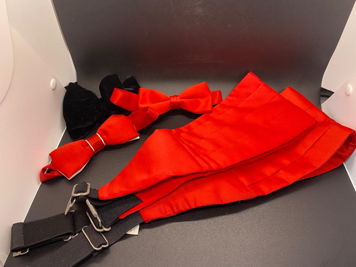 Pair of red cummerbunds and three bow ties. All are adjustable except the black velvet bow tie that is collar clip style. Good condition.