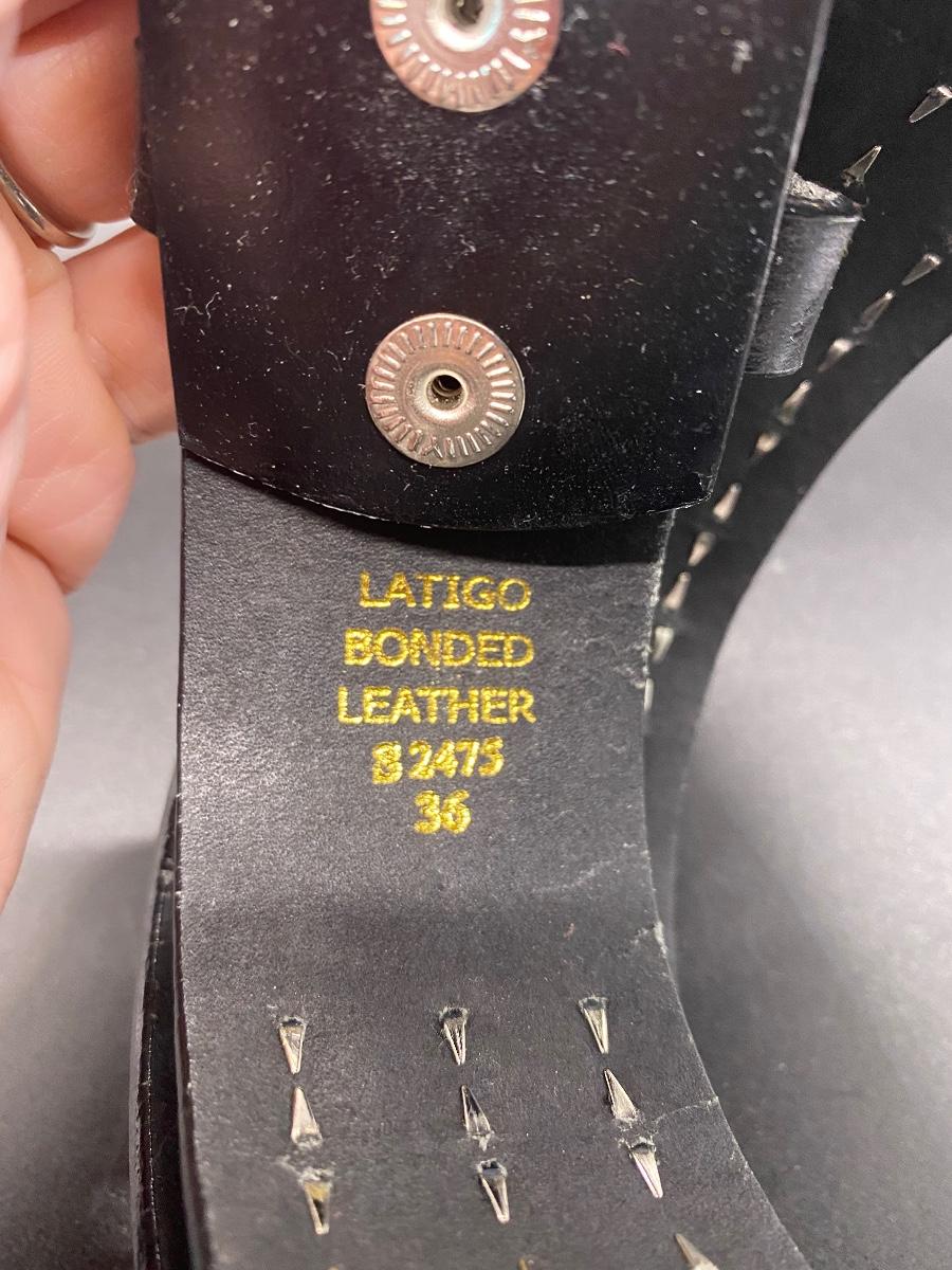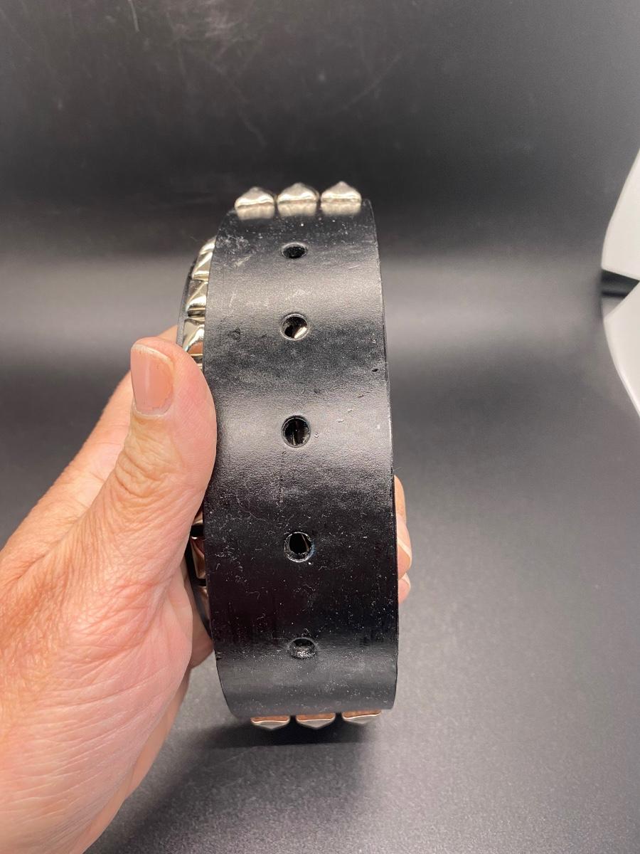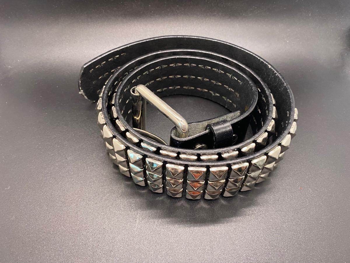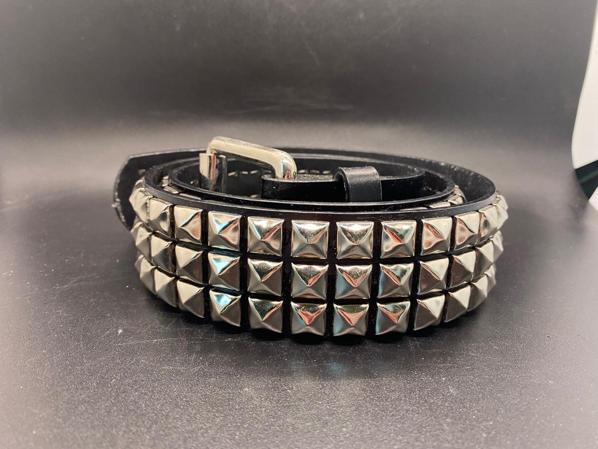 36" black bonded leather studded belt. 3 rows of square metal studs. In good used condition.