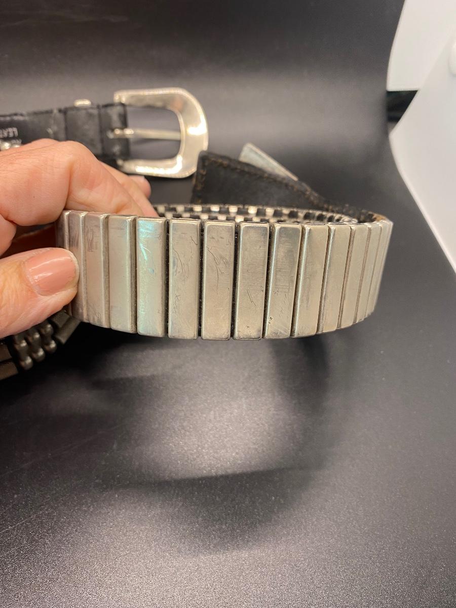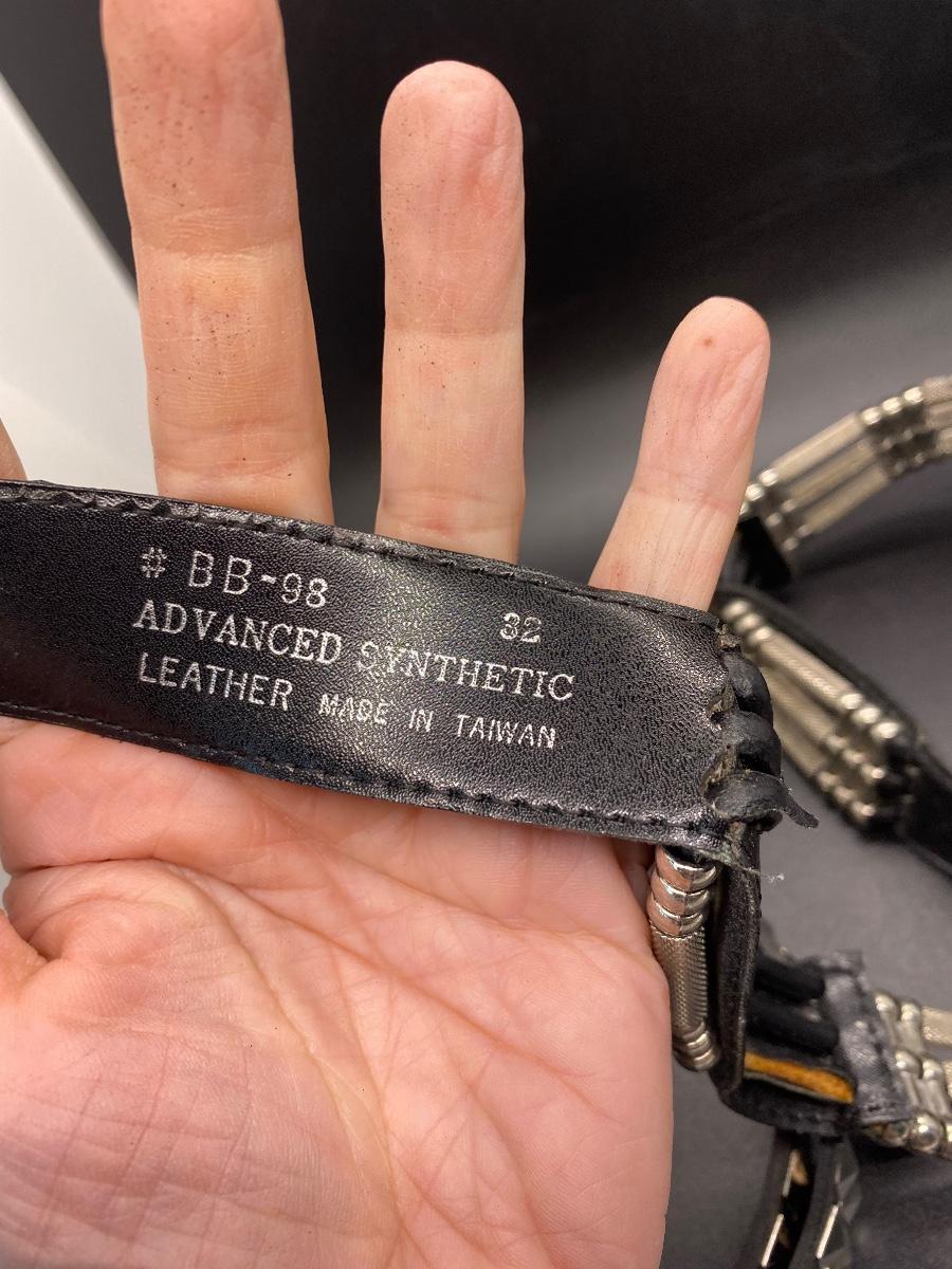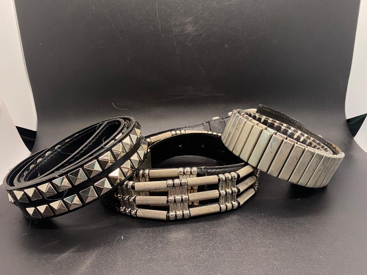 Set of 3 punk heavy metal style belts. 32" size. Good worn condition. Real and faux black leather.