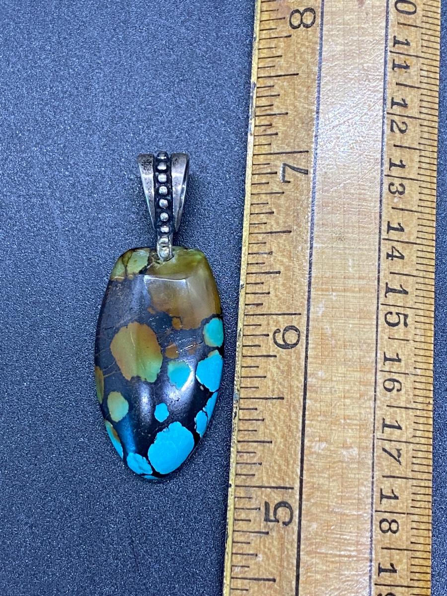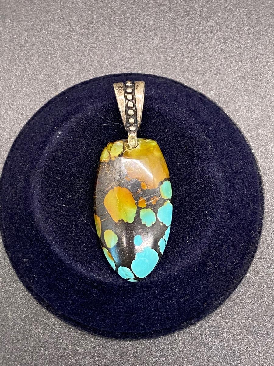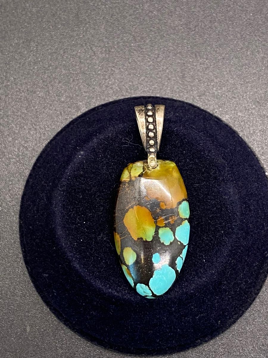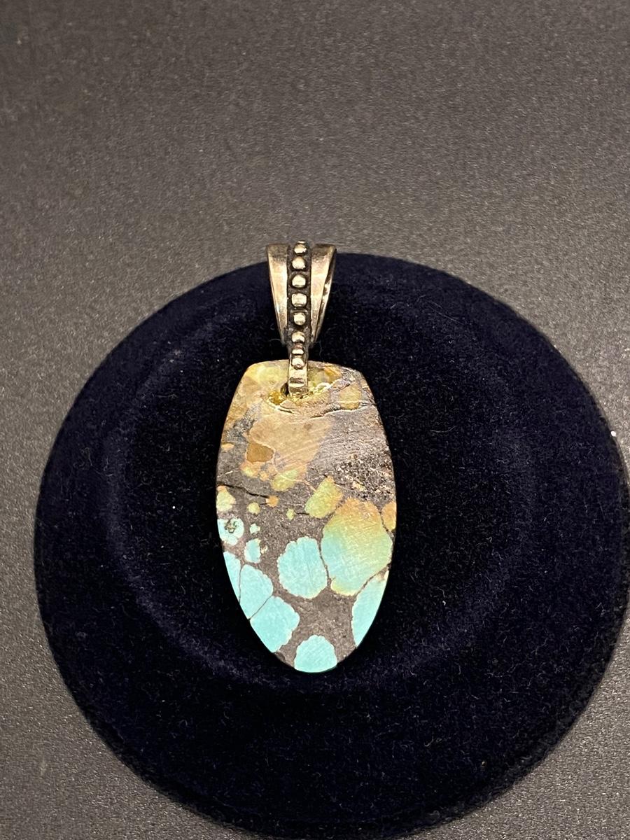 Southwestern style polished stone pendant. Interesting spotted turquoise jasper like stone, almond shape, flat on backside. No marks found on metal. About 2" length.
