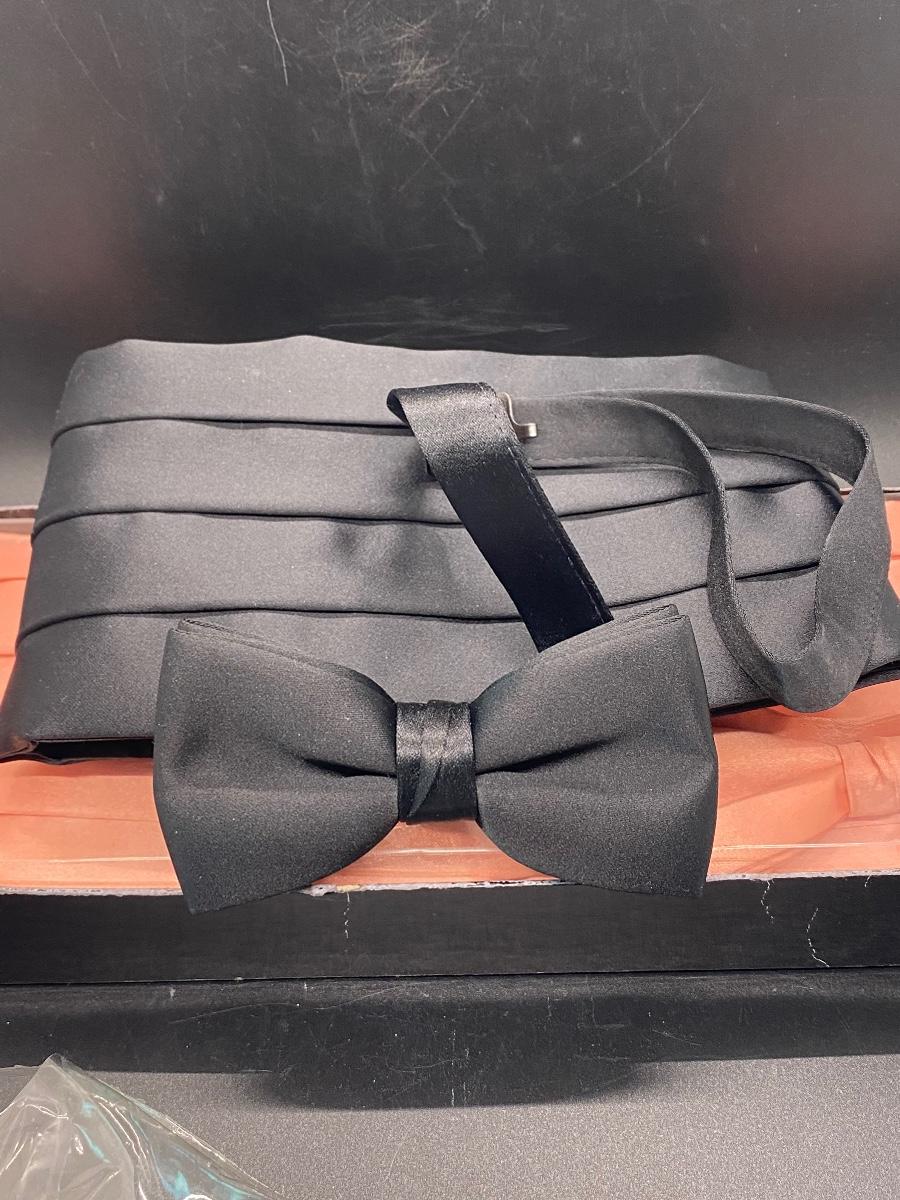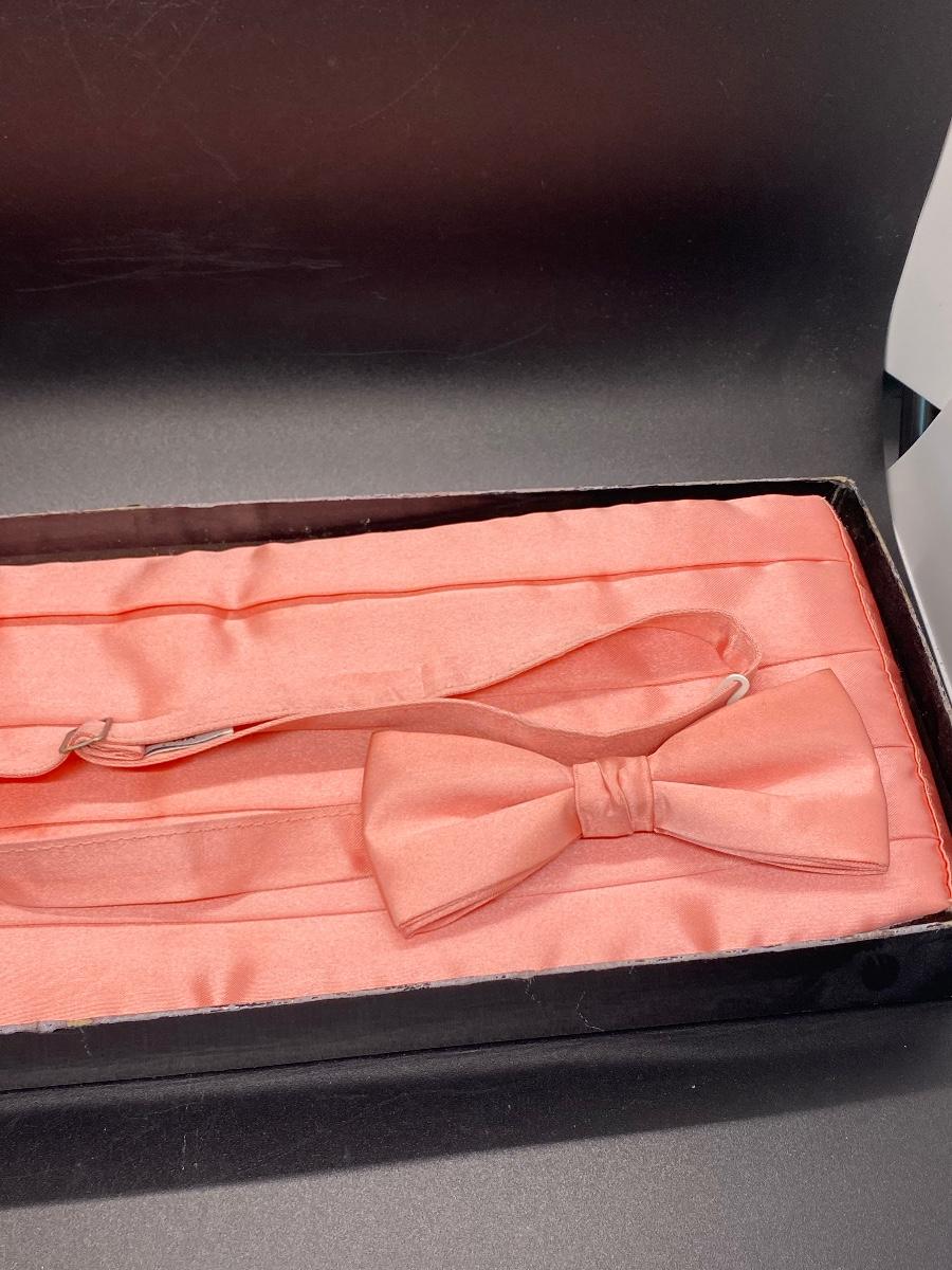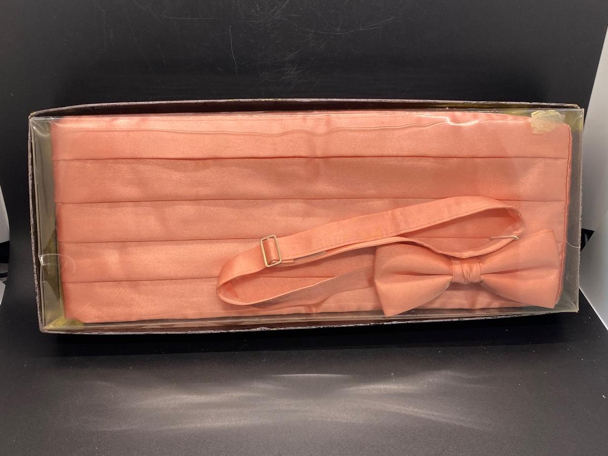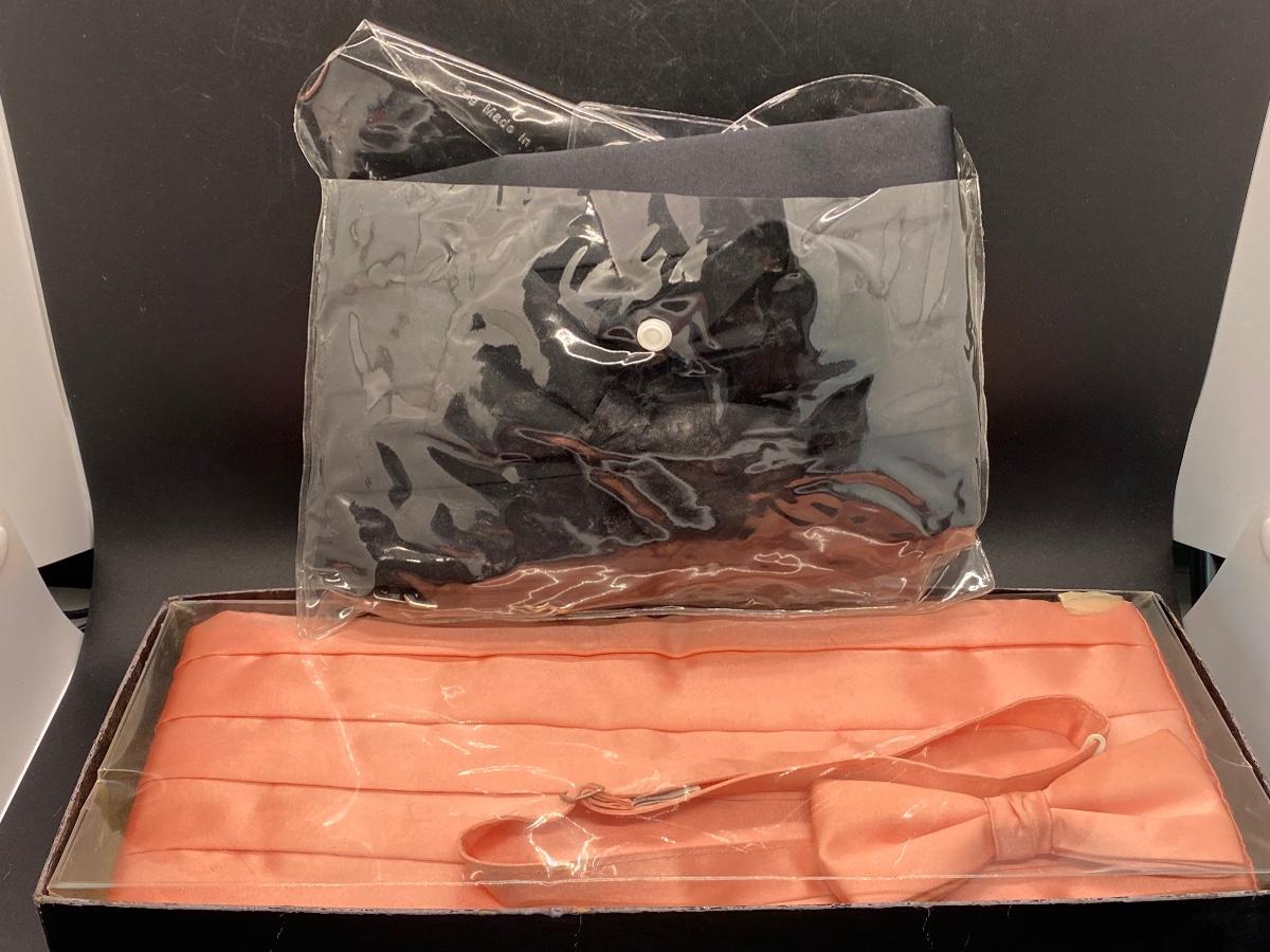 Vintage retro cummerbund and bow tie sets. Classic black and a peachy coral color. Adjustable, around size medium.