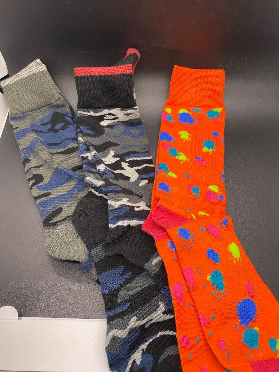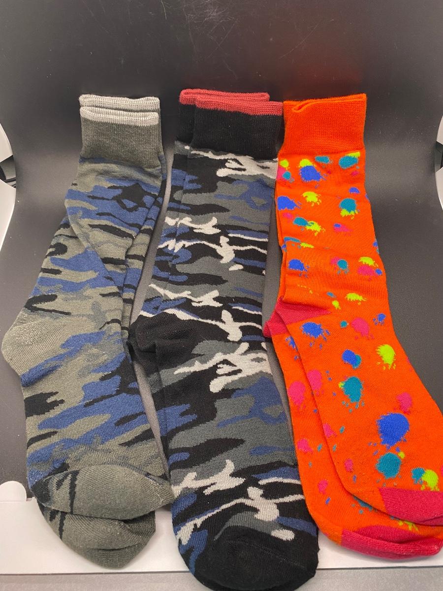 Three pairs of men's dress socks. Two pairs of camo and a colorful bright orange paint splatter pair. Good previously owned condition, no holes or worn spots.