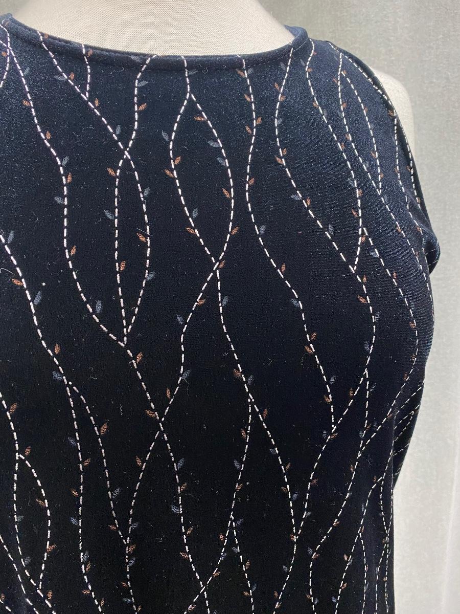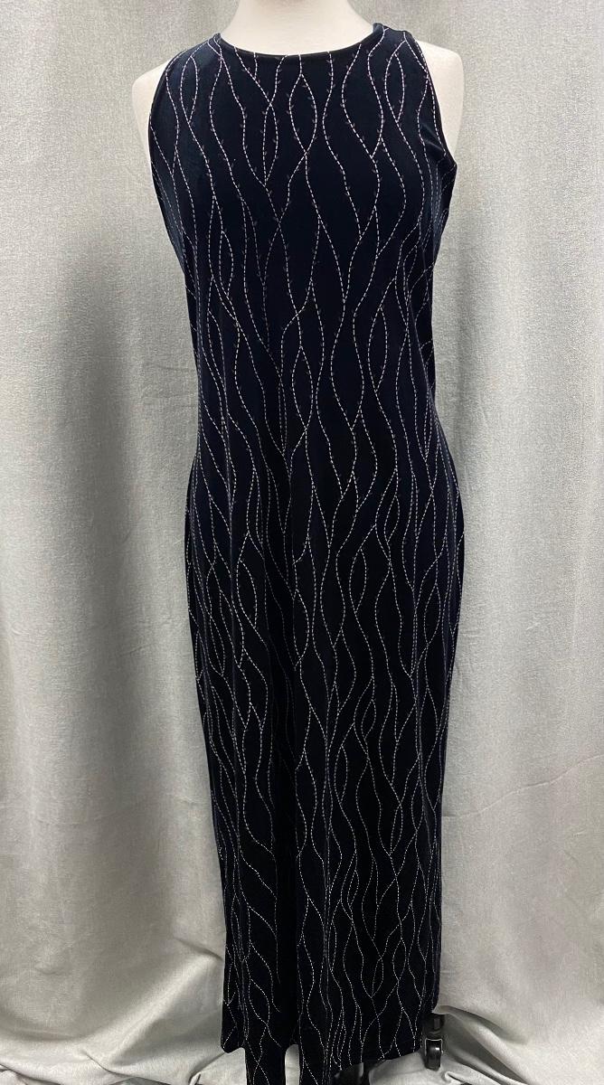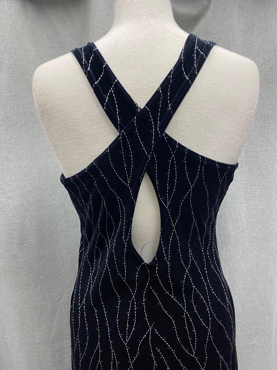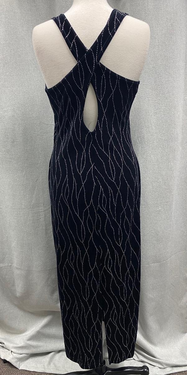 Woman's velvet party dress. Black with a glittery vine pattern. Stretch material, size 12. Crisscross back. In good condition.