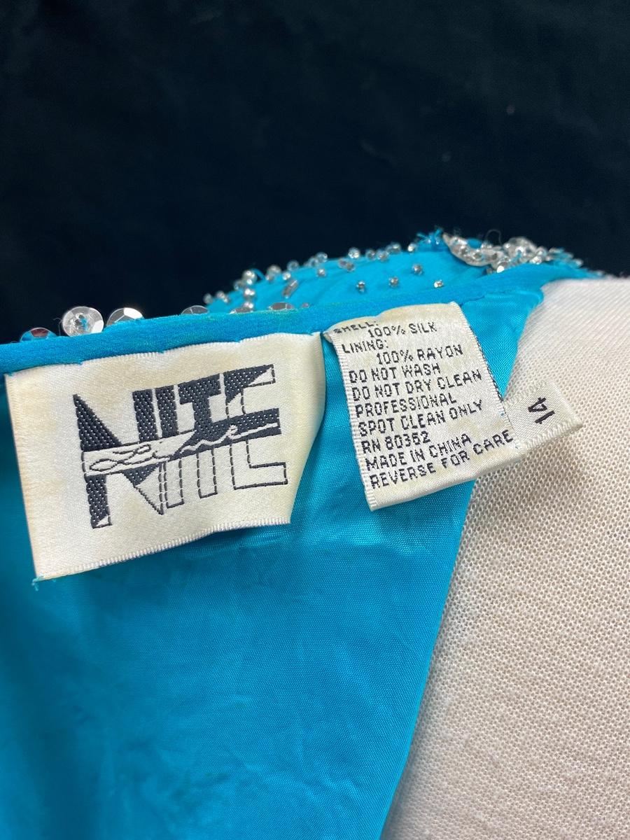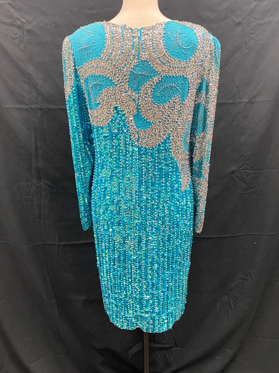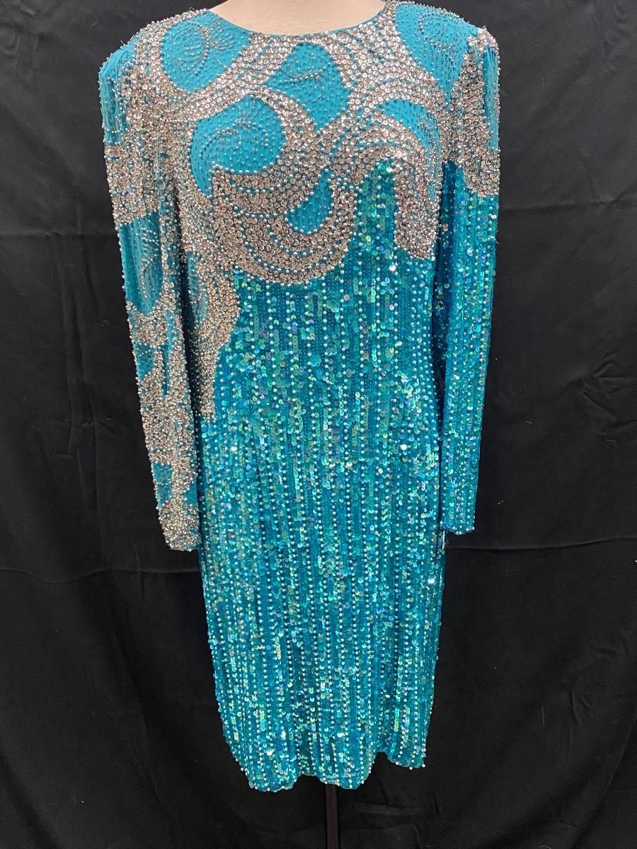 Turquoise and silver sequined cocktail dress. Retro party dress, long sleeves, knee length. Zipper back. Made by Nite Line, size 14. In good vintage condition, no holes or noticed spots. There is a slightly puller seam and a spot inside by zipper, but you can't see the spot on the outside.