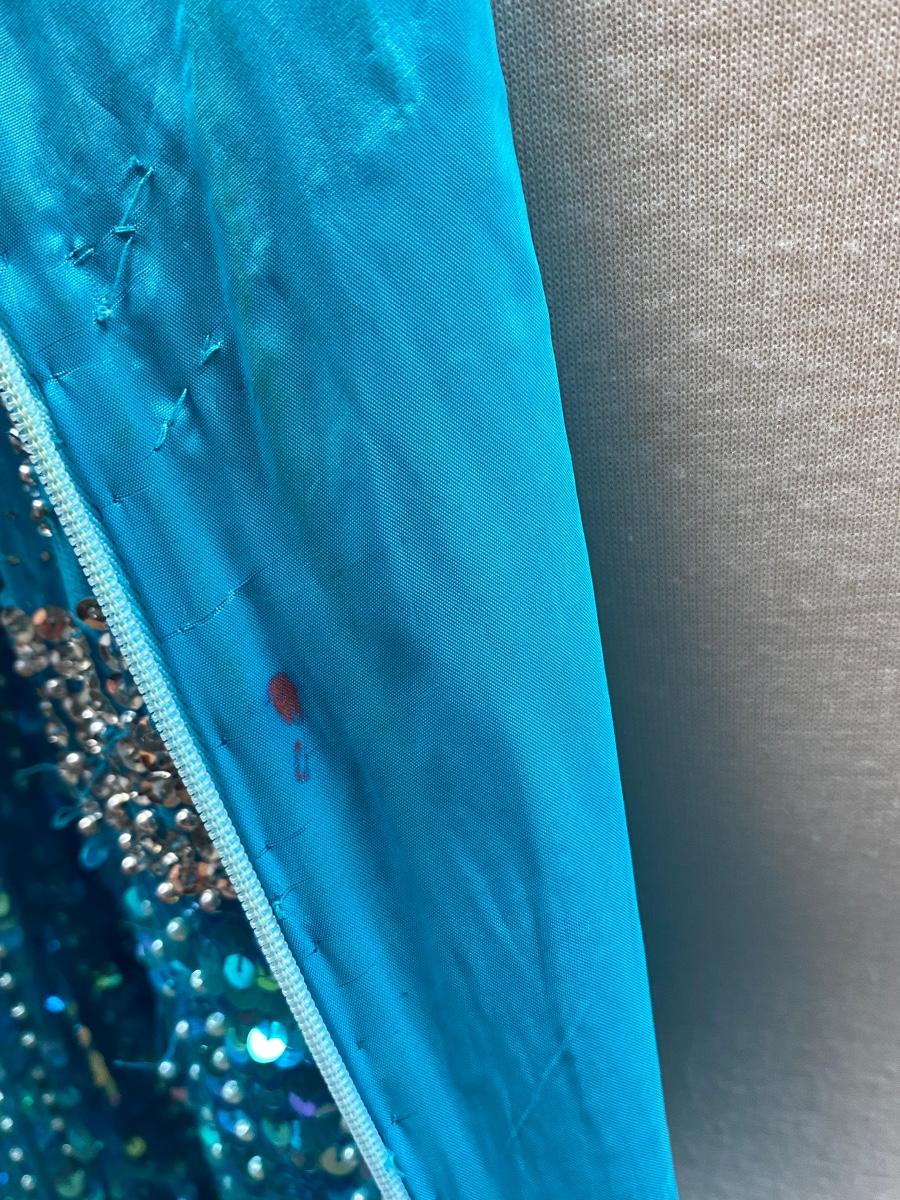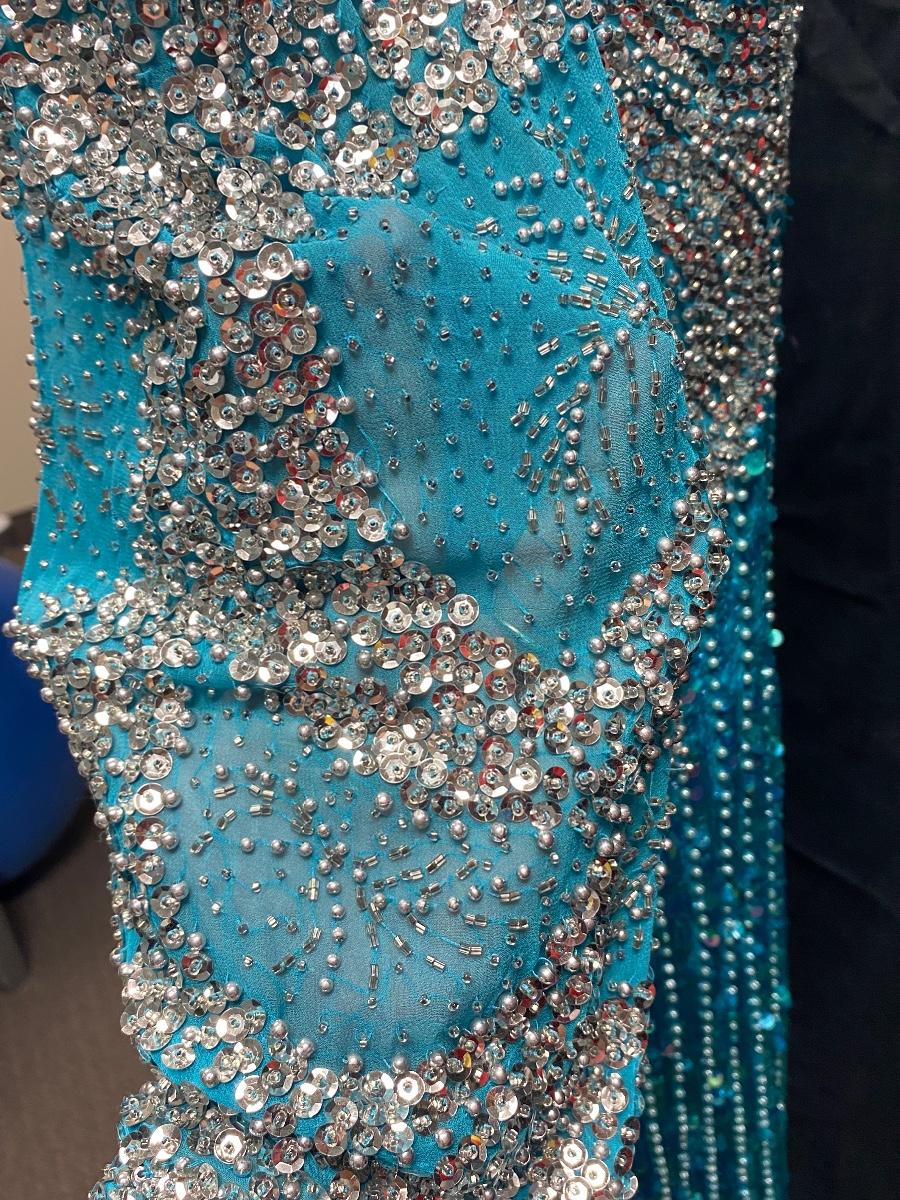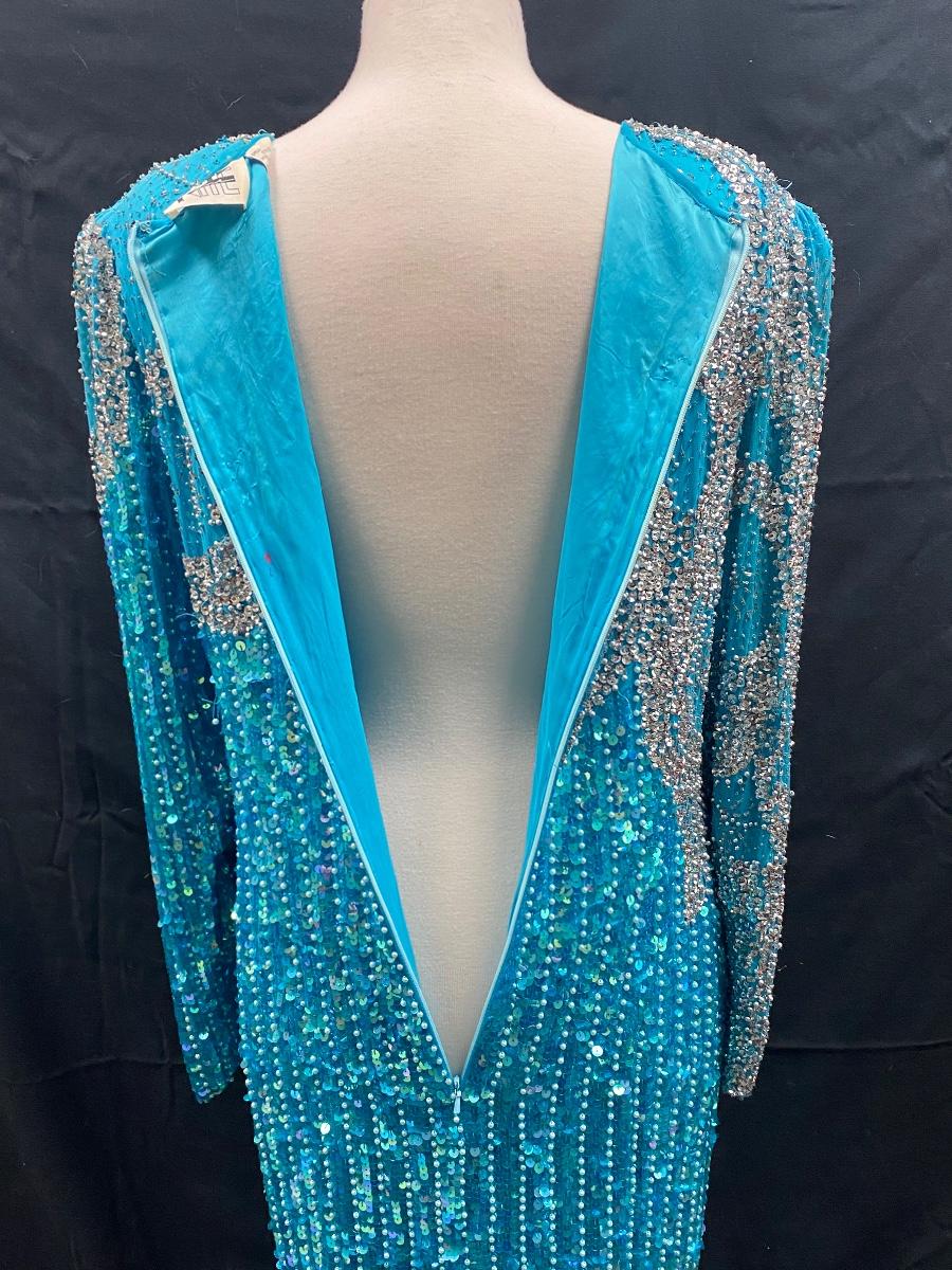 Turquoise and silver sequined cocktail dress. Retro party dress, long sleeves, knee length. Zipper back. Made by Nite Line, size 14. In good vintage condition, no holes or noticed spots. There is a slightly puller seam and a spot inside by zipper, but you can't see the spot on the outside.