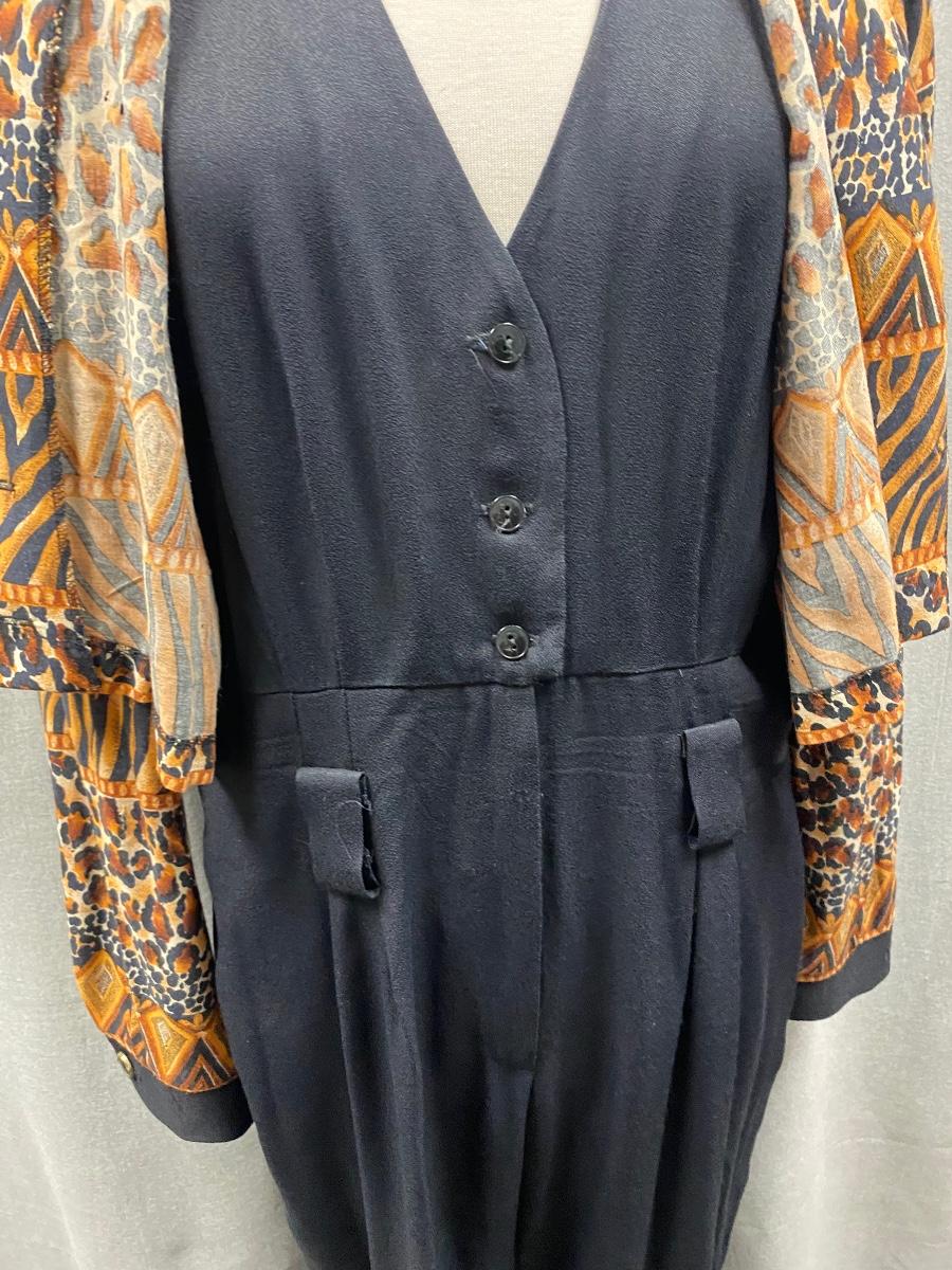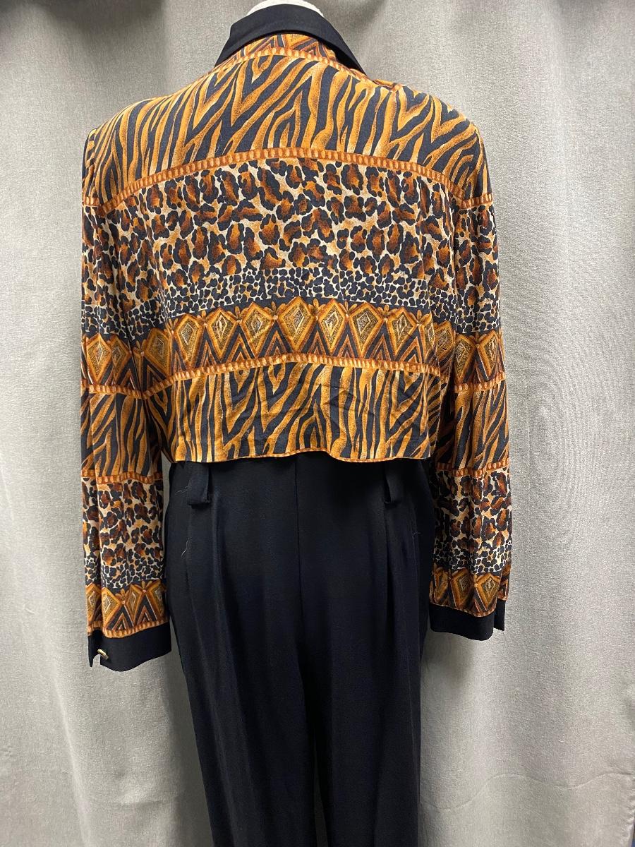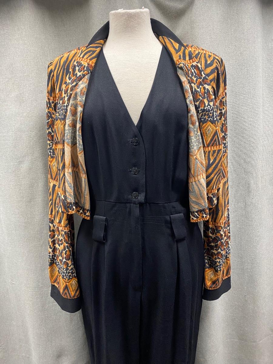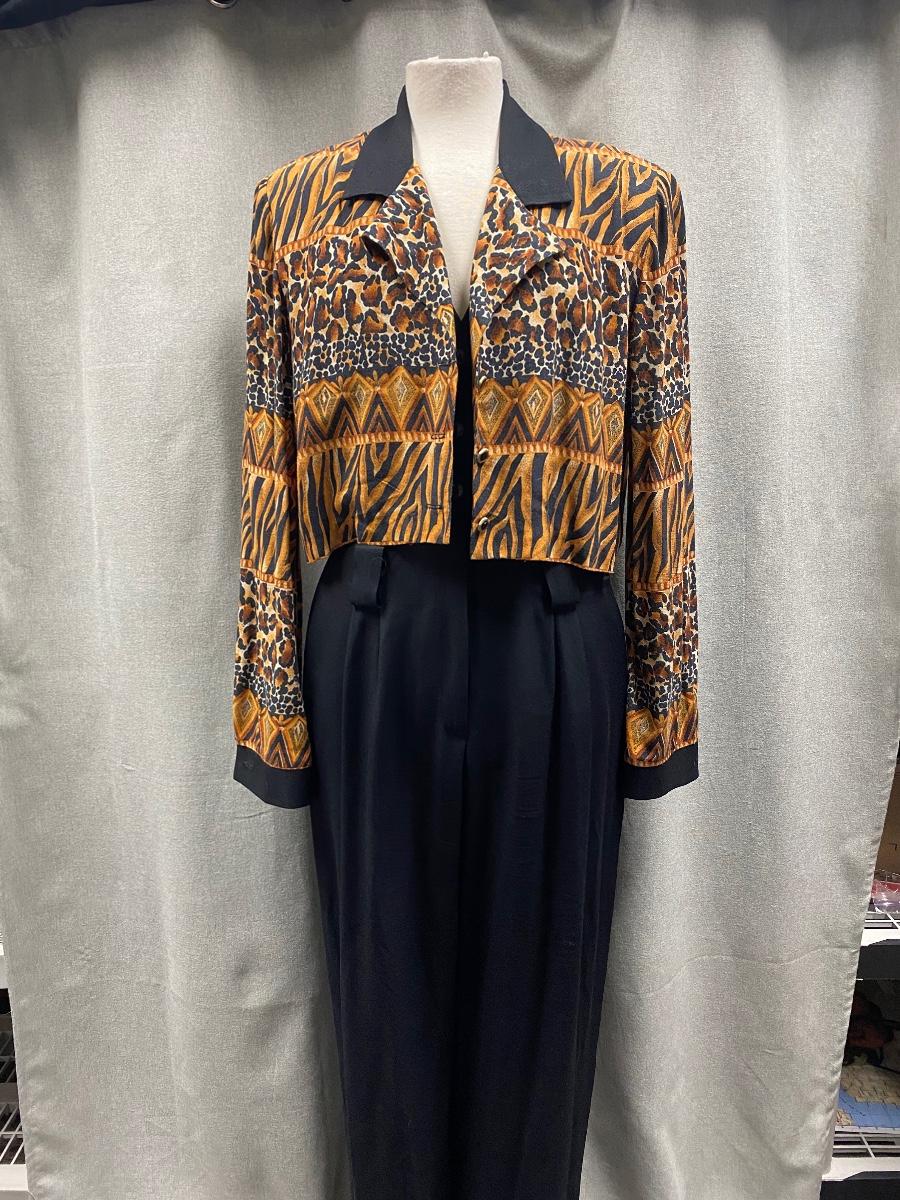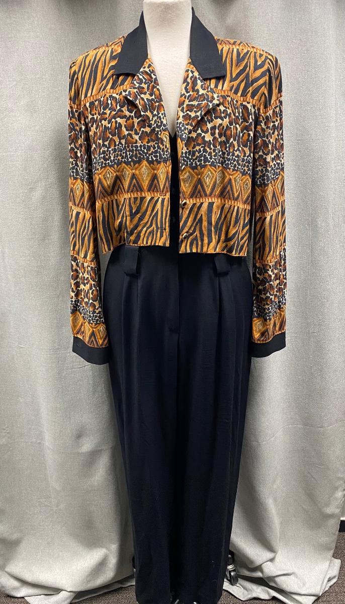 One piece woman's pants suit. Black one piece with an attached animal print shirt. zipper and button front. Animal print over shirt can be worn open or buttoned up. Has belt loops but no belt included. in good condition. Size 16 from R & M Richards by Karen Kwong.