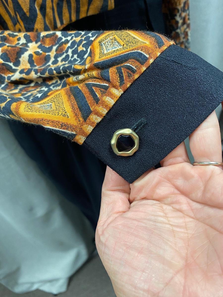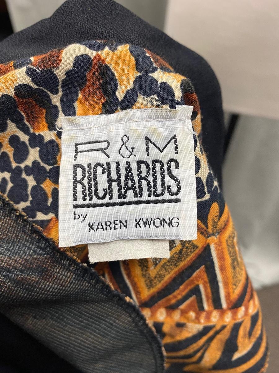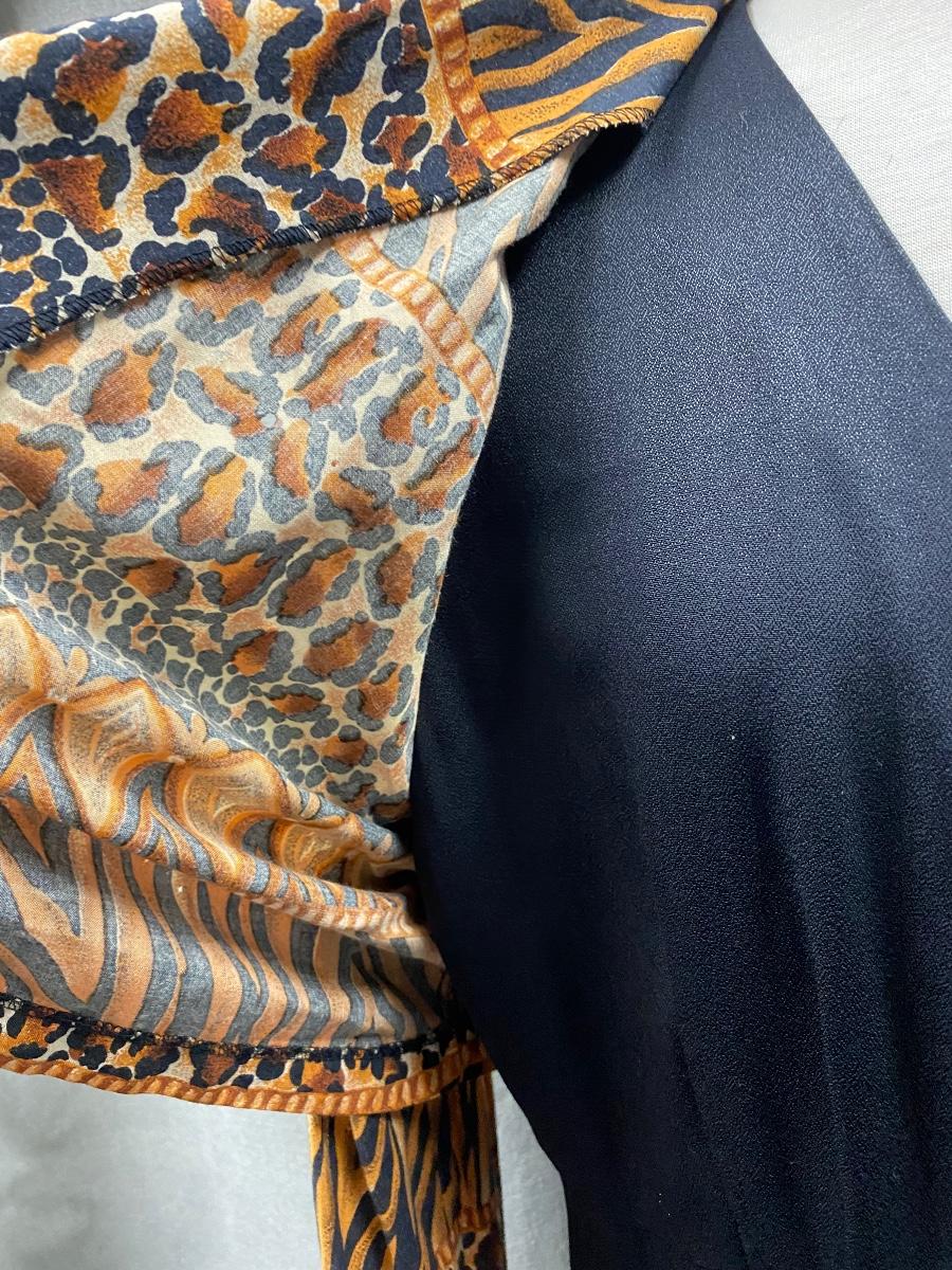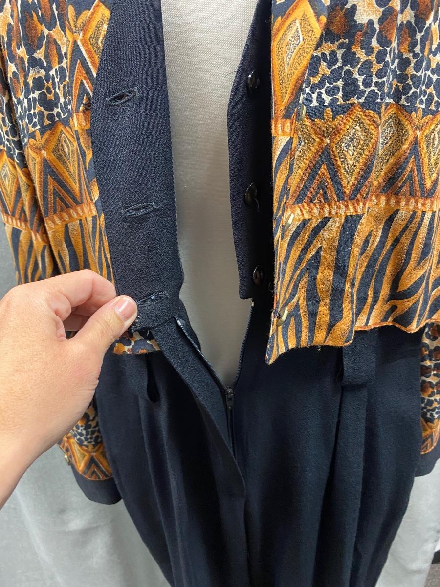 One piece woman's pants suit. Black one piece with an attached animal print shirt. zipper and button front. Animal print over shirt can be worn open or buttoned up. Has belt loops but no belt included. in good condition. Size 16 from R & M Richards by Karen Kwong.