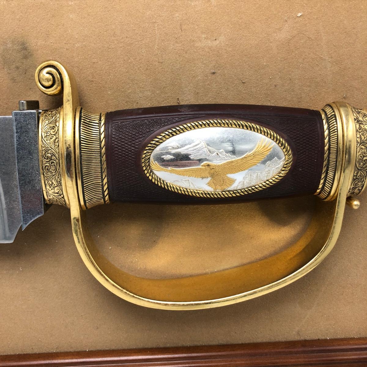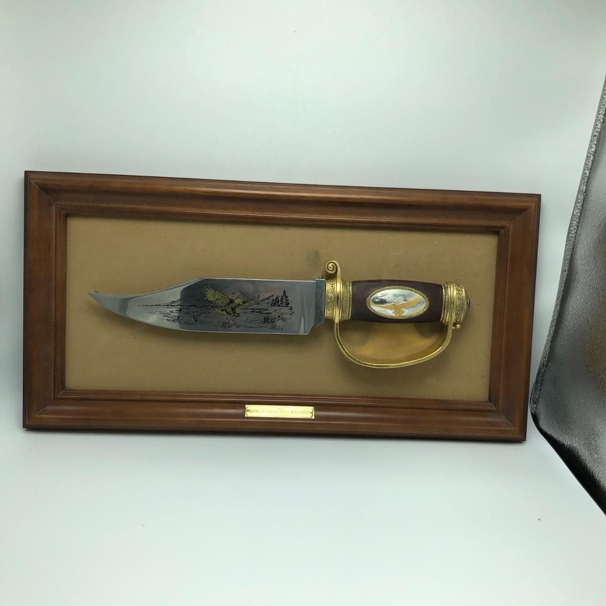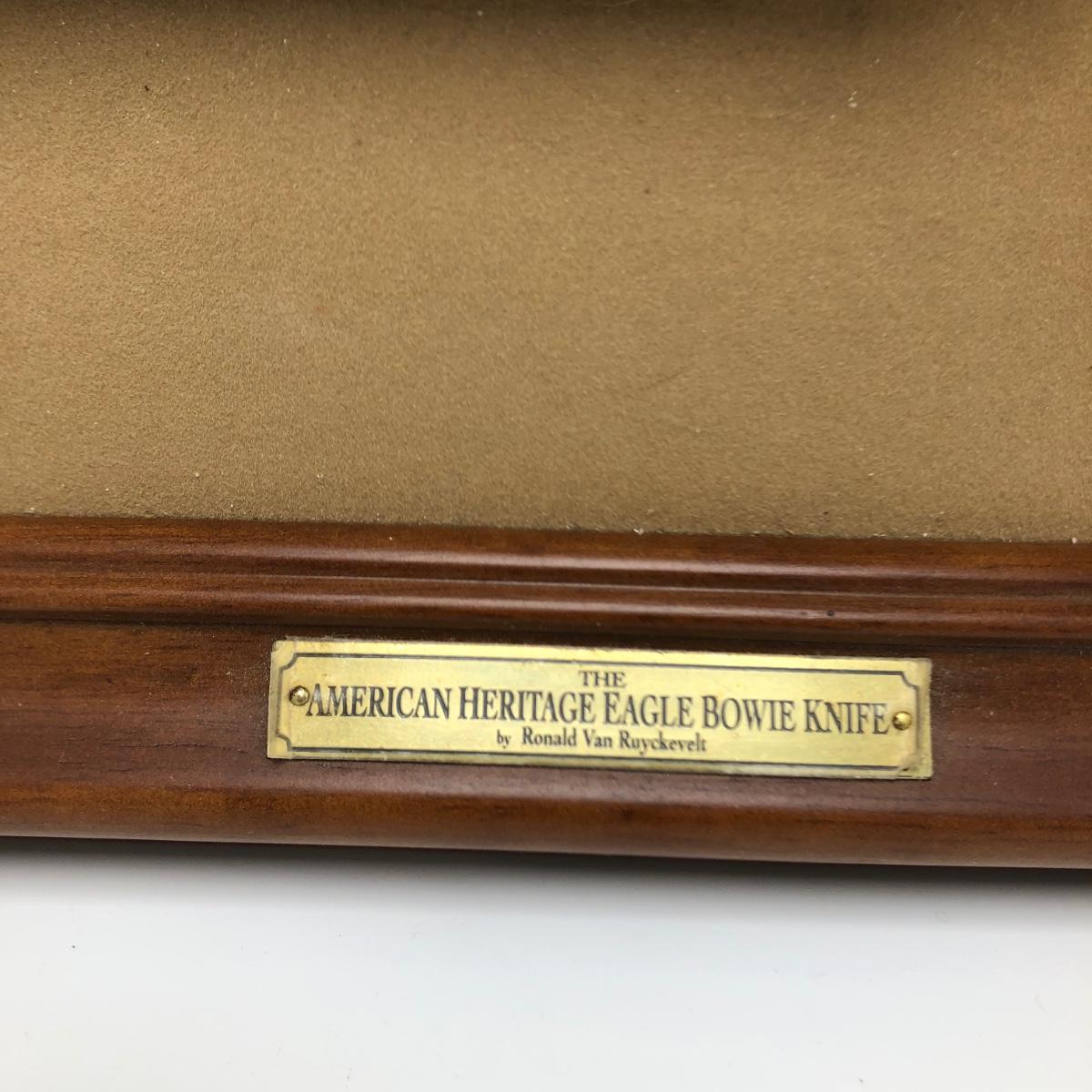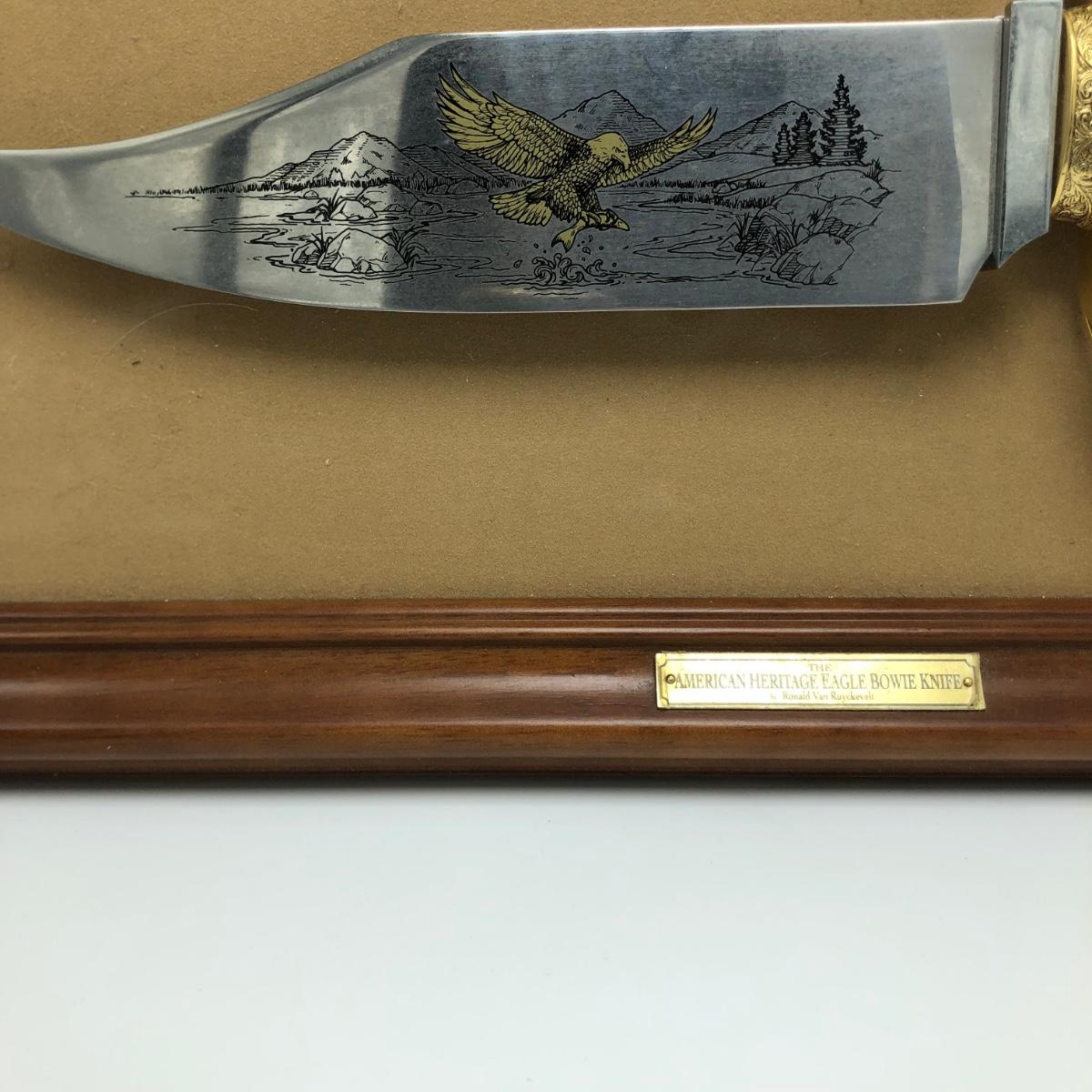 Lot includes a American Heritage Eagle Bowie Knife by Ronald Van Ruyckevelt mounted on a wooden frame. The blade showcases an Eagle catching a fish. The handle appears to be made of resin or a plastic. Frame measures 10.5” x 21”.