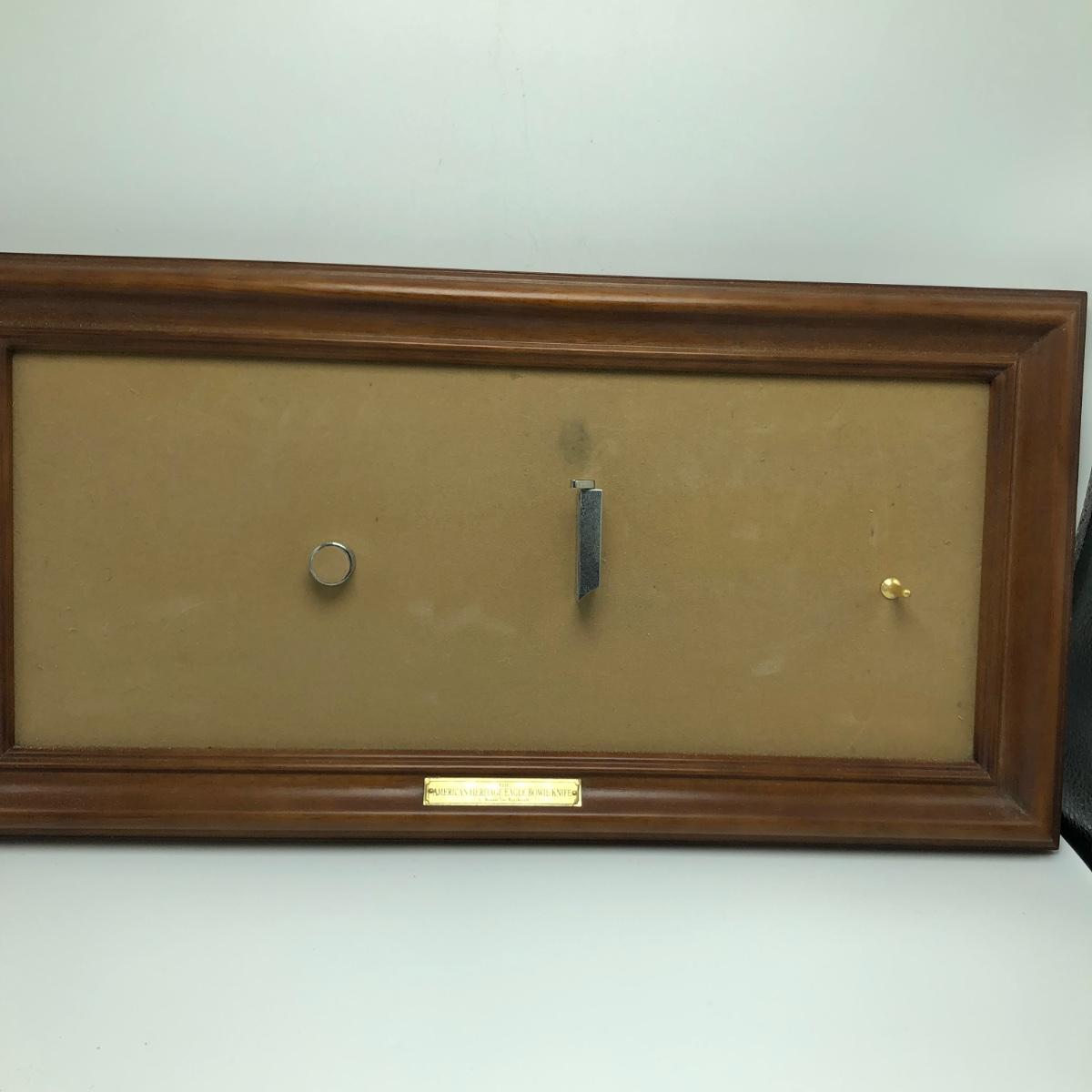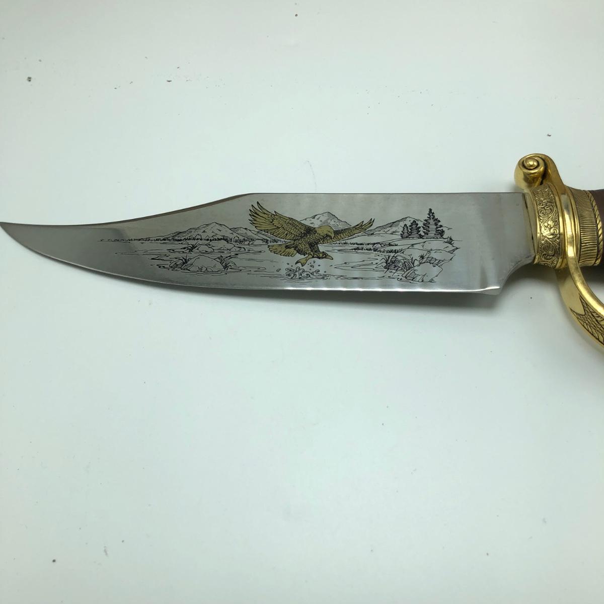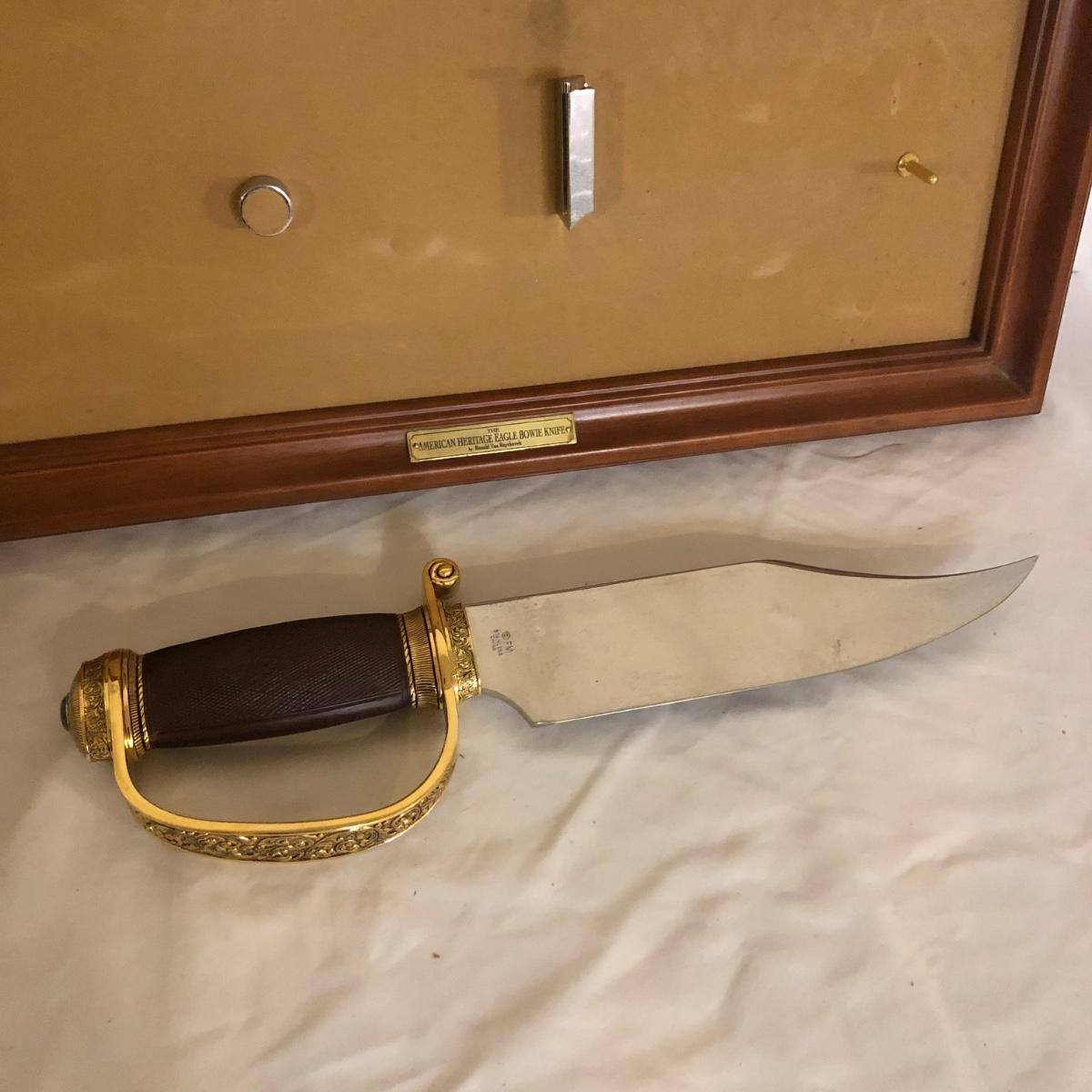 Lot includes a American Heritage Eagle Bowie Knife by Ronald Van Ruyckevelt mounted on a wooden frame. The blade showcases an Eagle catching a fish. The handle appears to be made of resin or a plastic. Frame measures 10.5” x 21”.