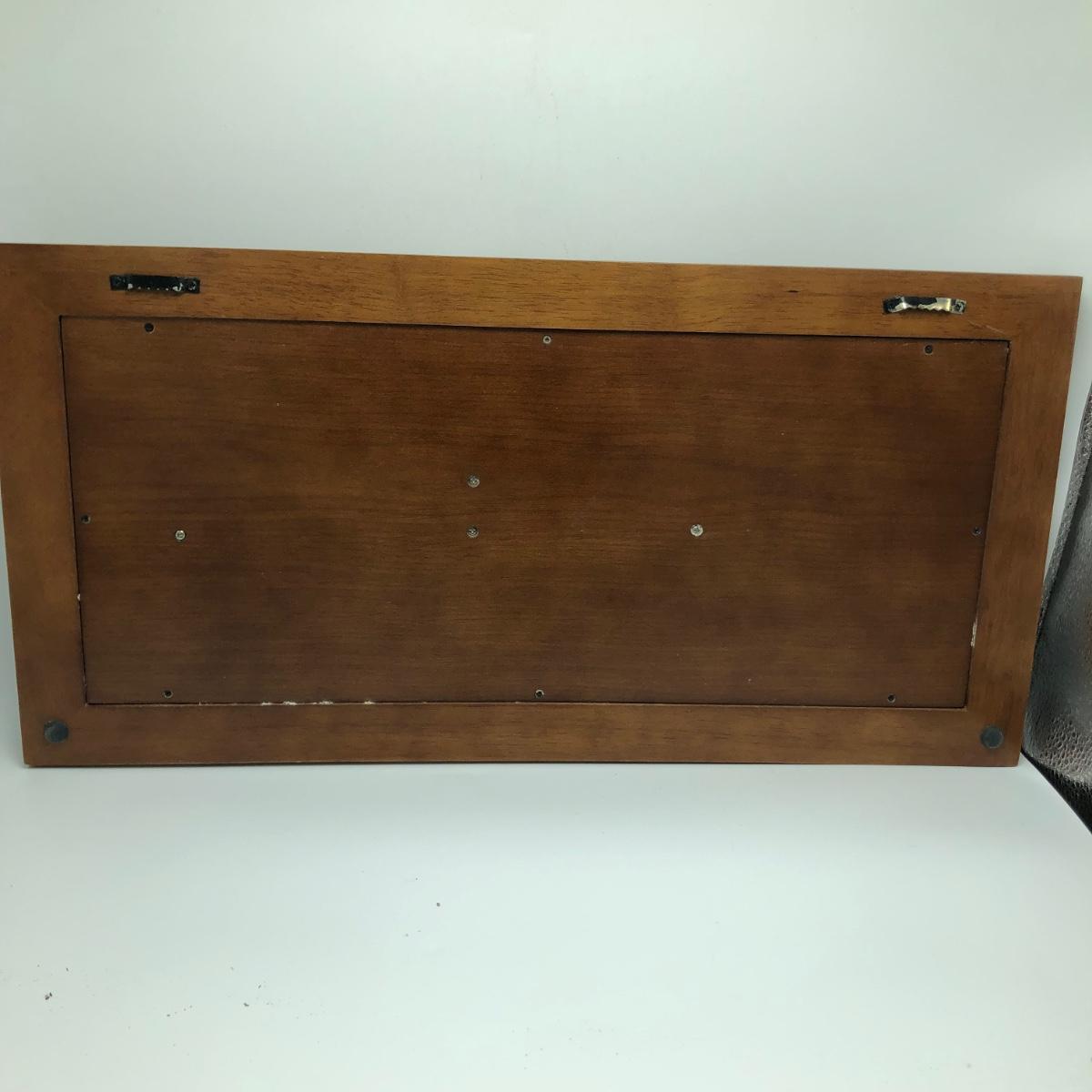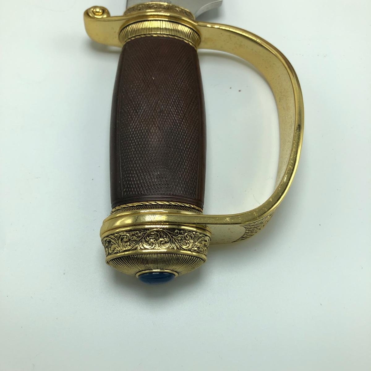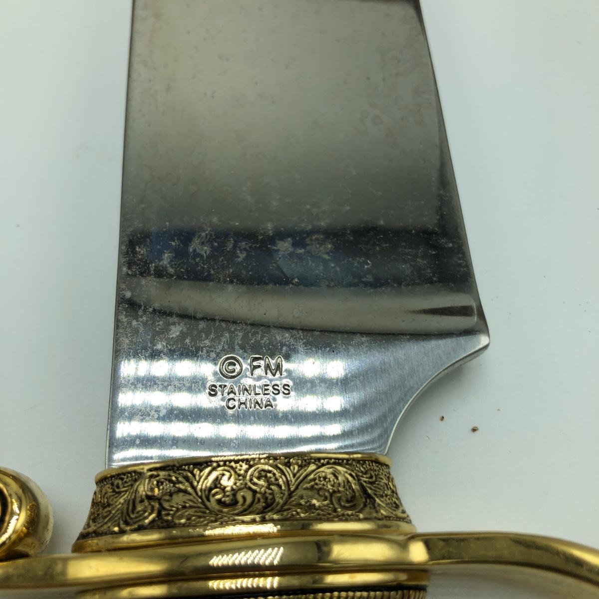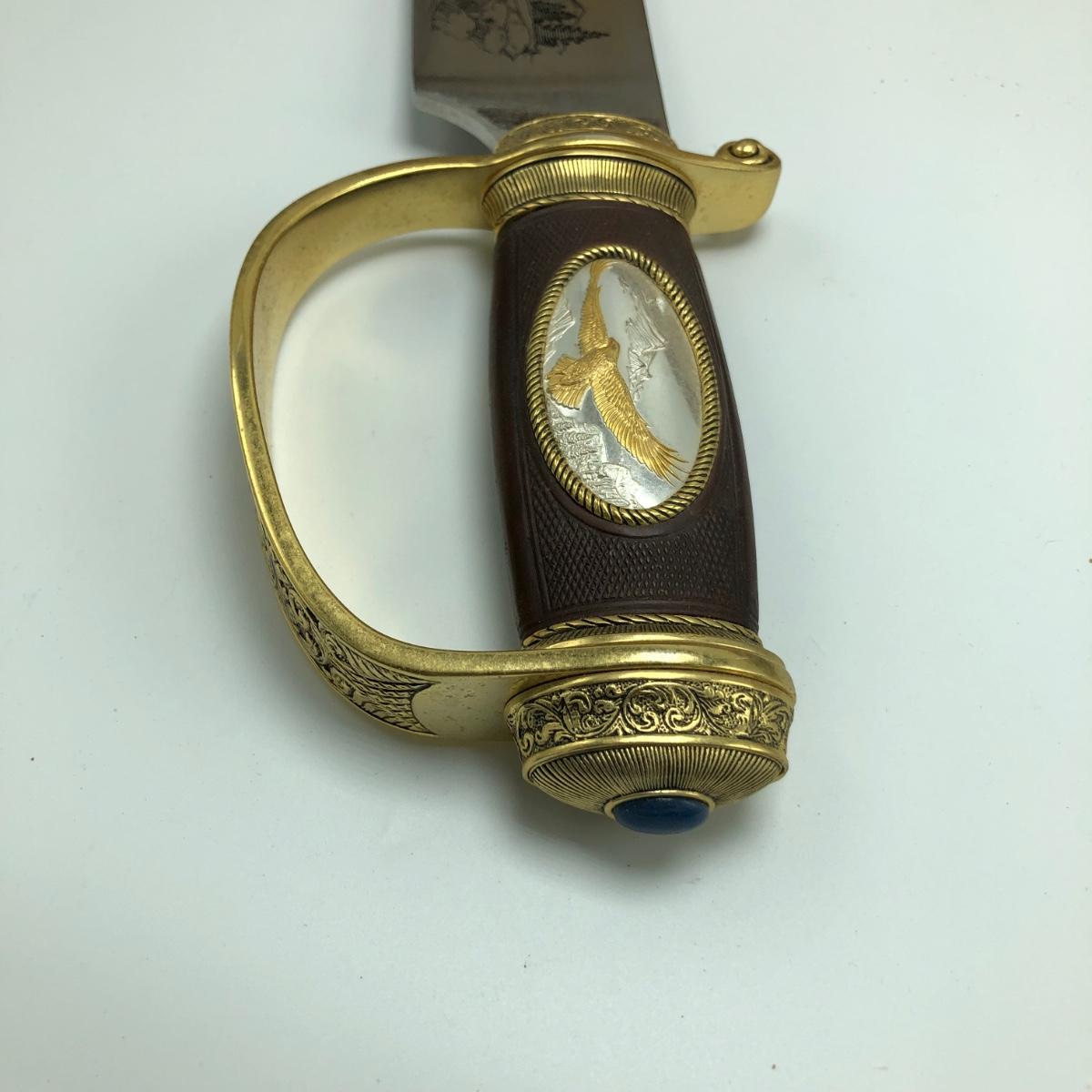 Lot includes a American Heritage Eagle Bowie Knife by Ronald Van Ruyckevelt mounted on a wooden frame. The blade showcases an Eagle catching a fish. The handle appears to be made of resin or a plastic. Frame measures 10.5” x 21”.