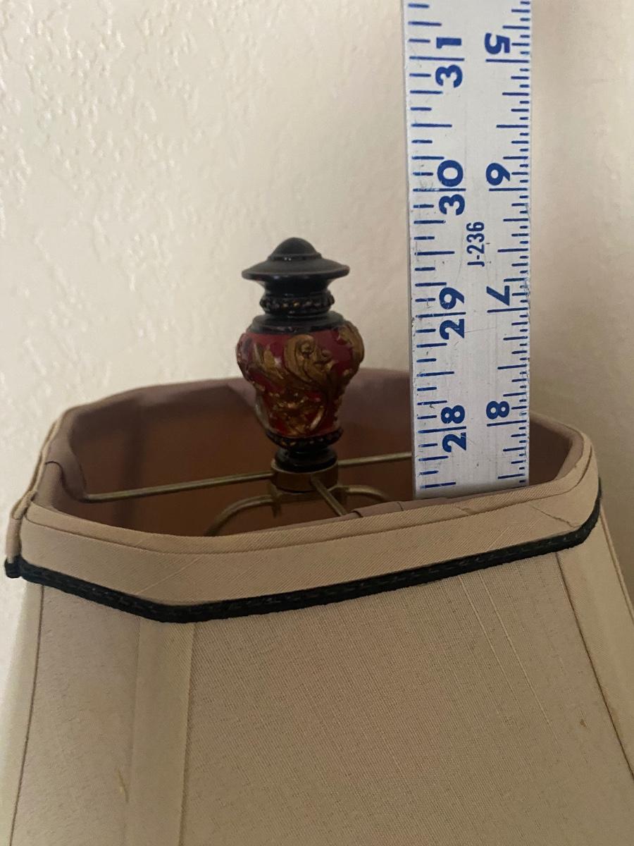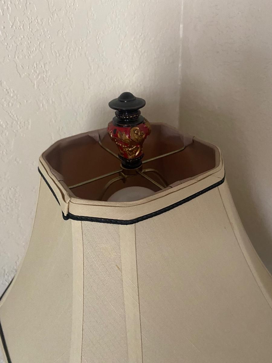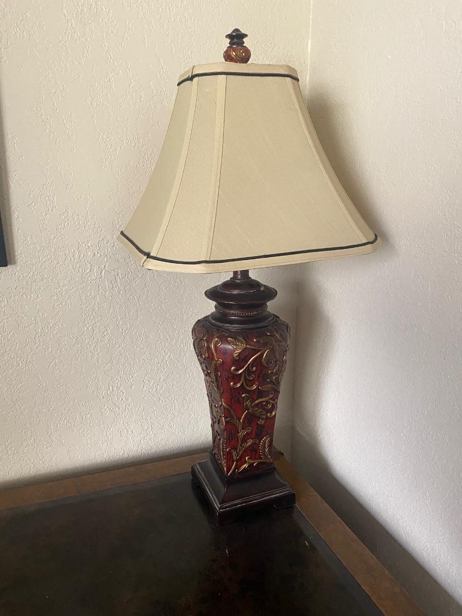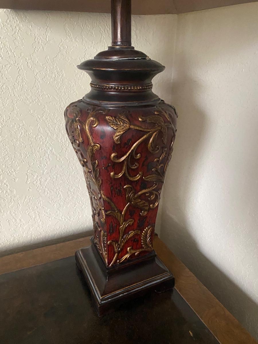Dark Red & Gold Table Lamp with Shade. In good condition. Untested. About 30" tall.