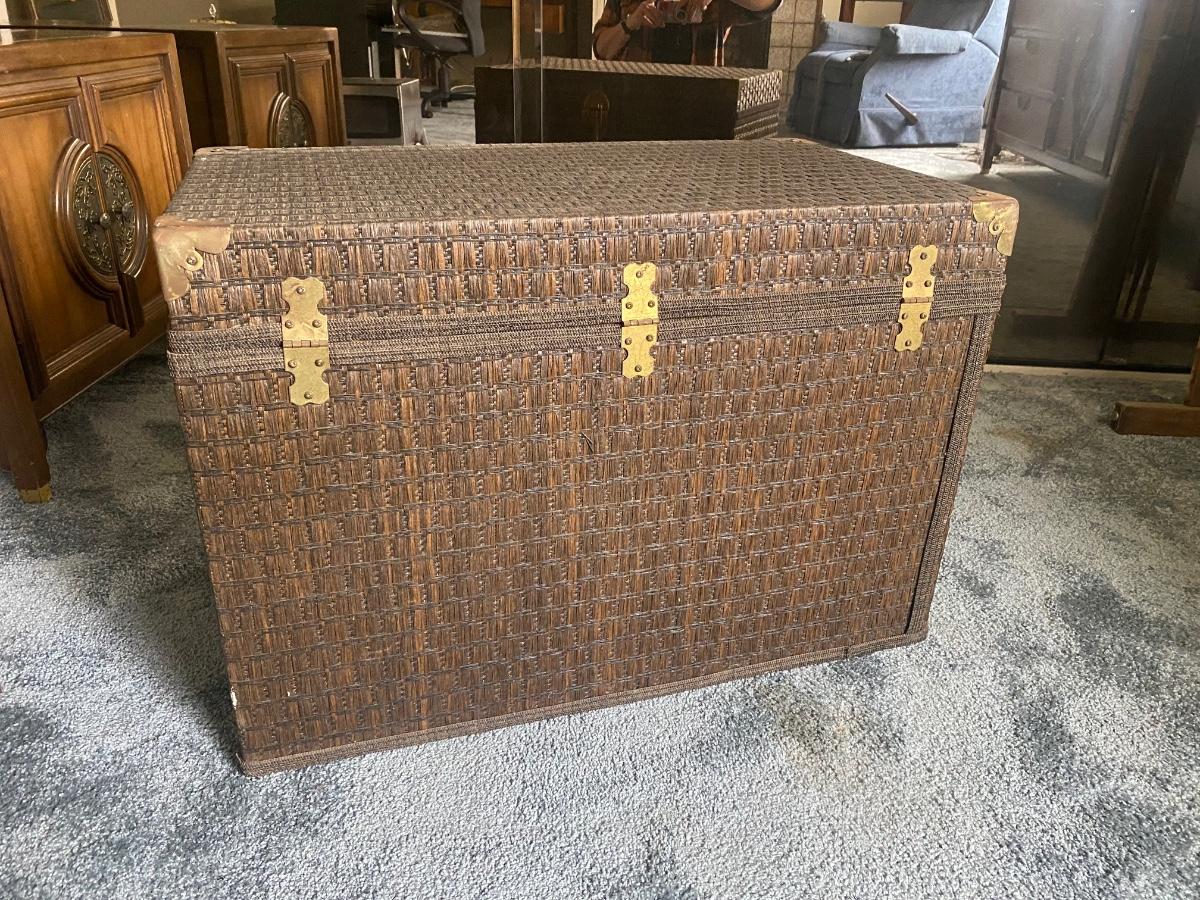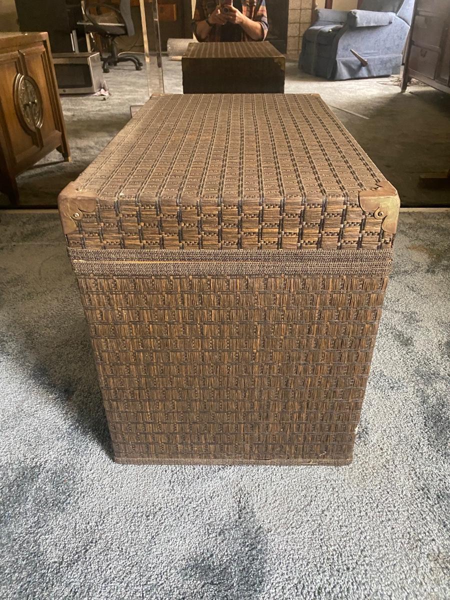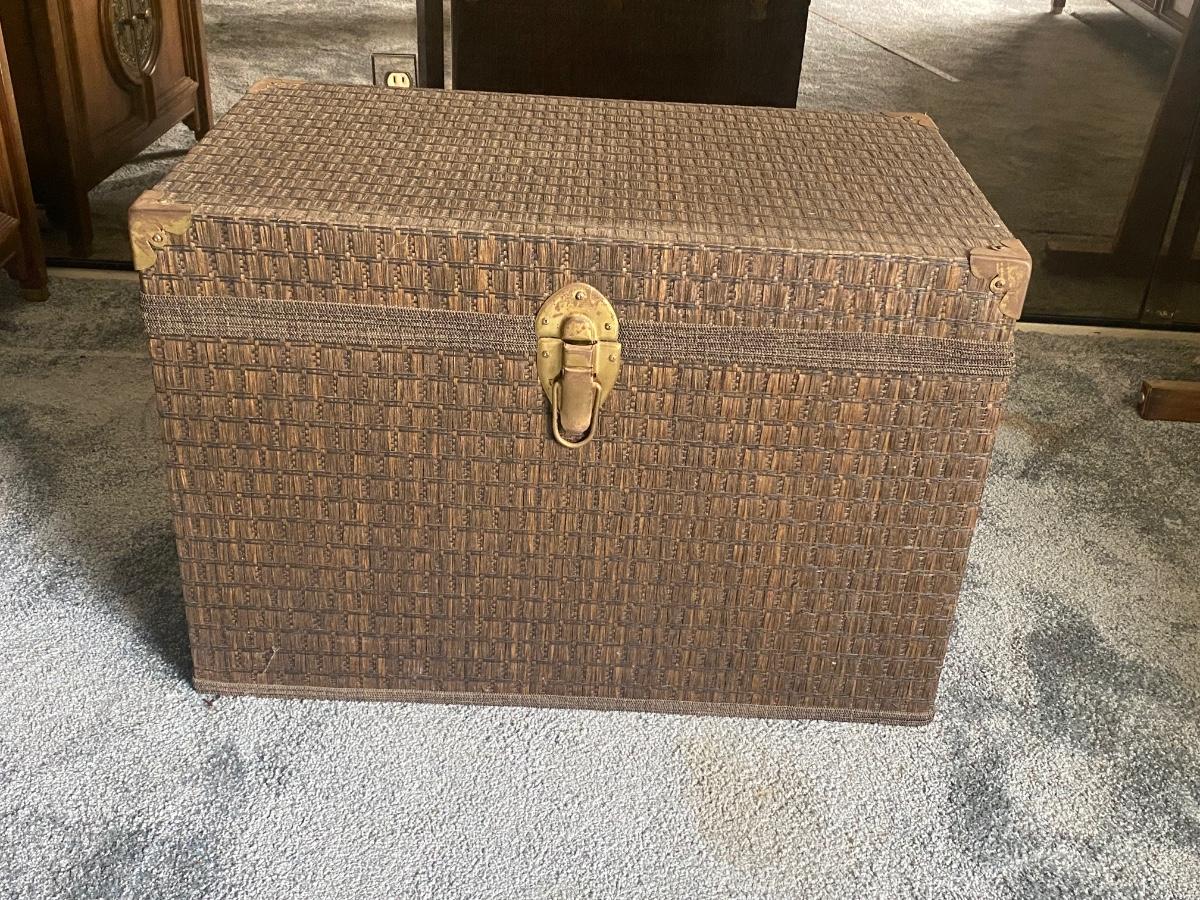 Vintage Wicker Rattan Covered Wood Storage Chest. Sturdy chest, solid wood covered with a rattan like finish. Brass corners and latch, no lock. Some light wear from age and a little dusty. Great for side table use also. About 28" wide, 16" deep, and 20" tall.