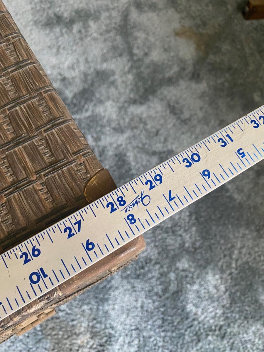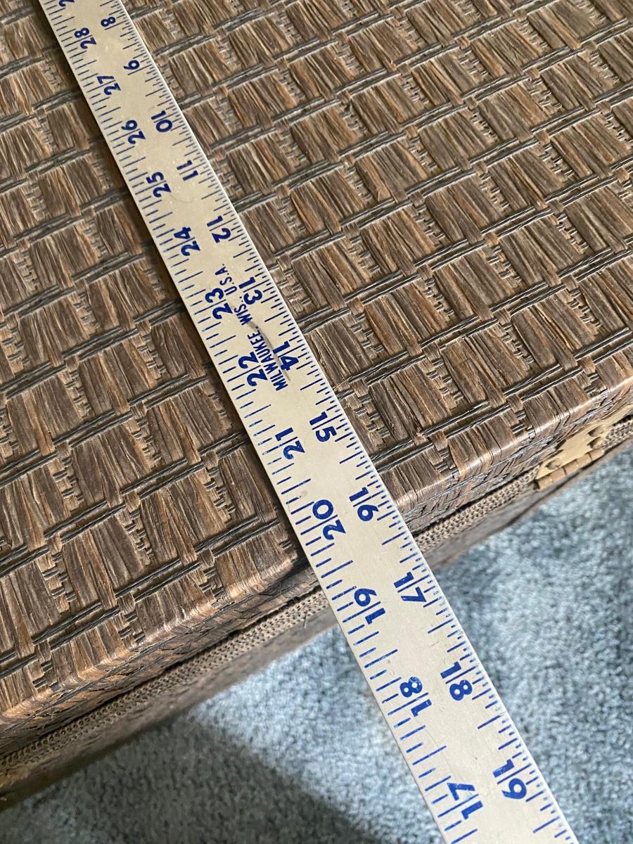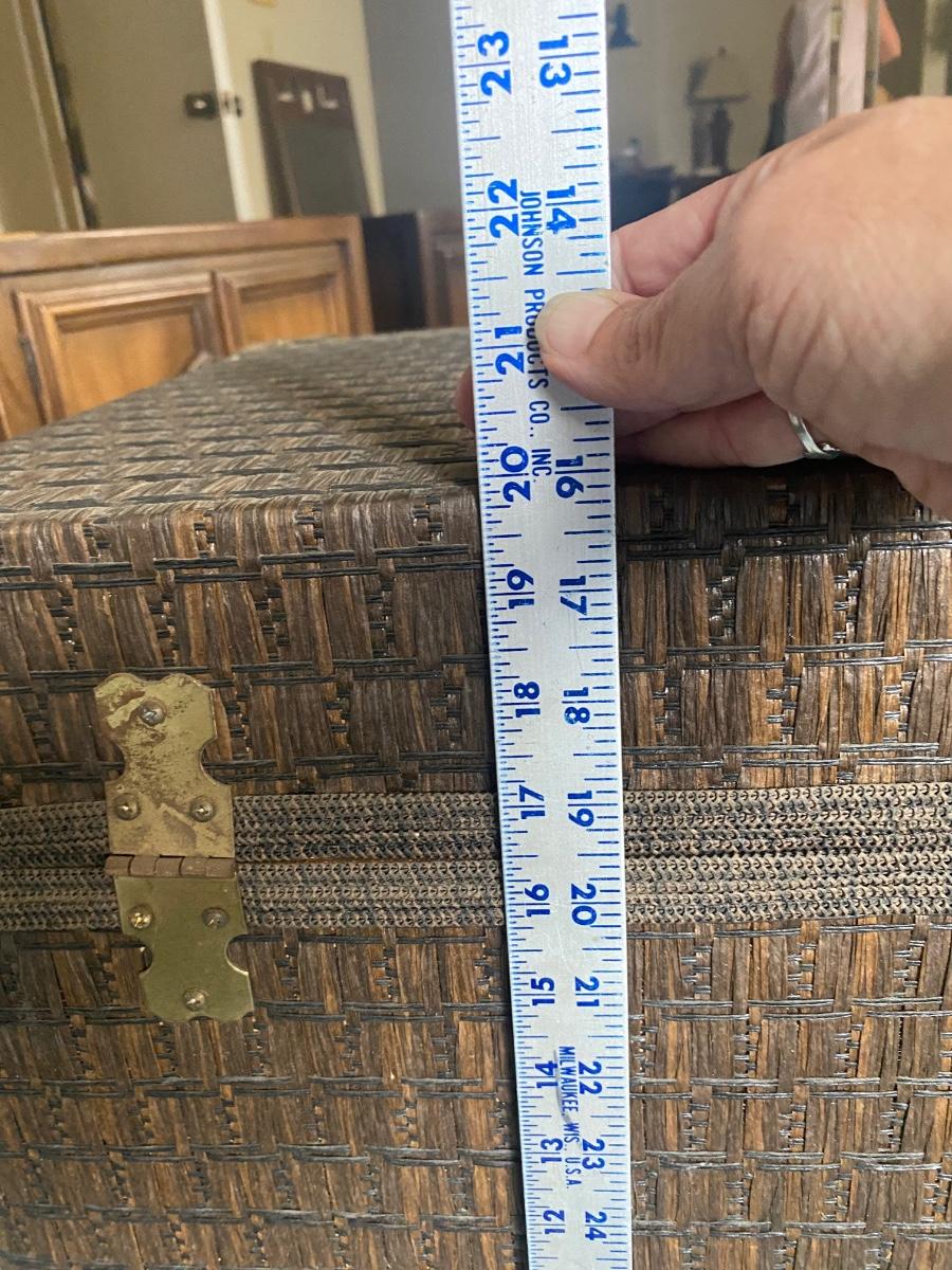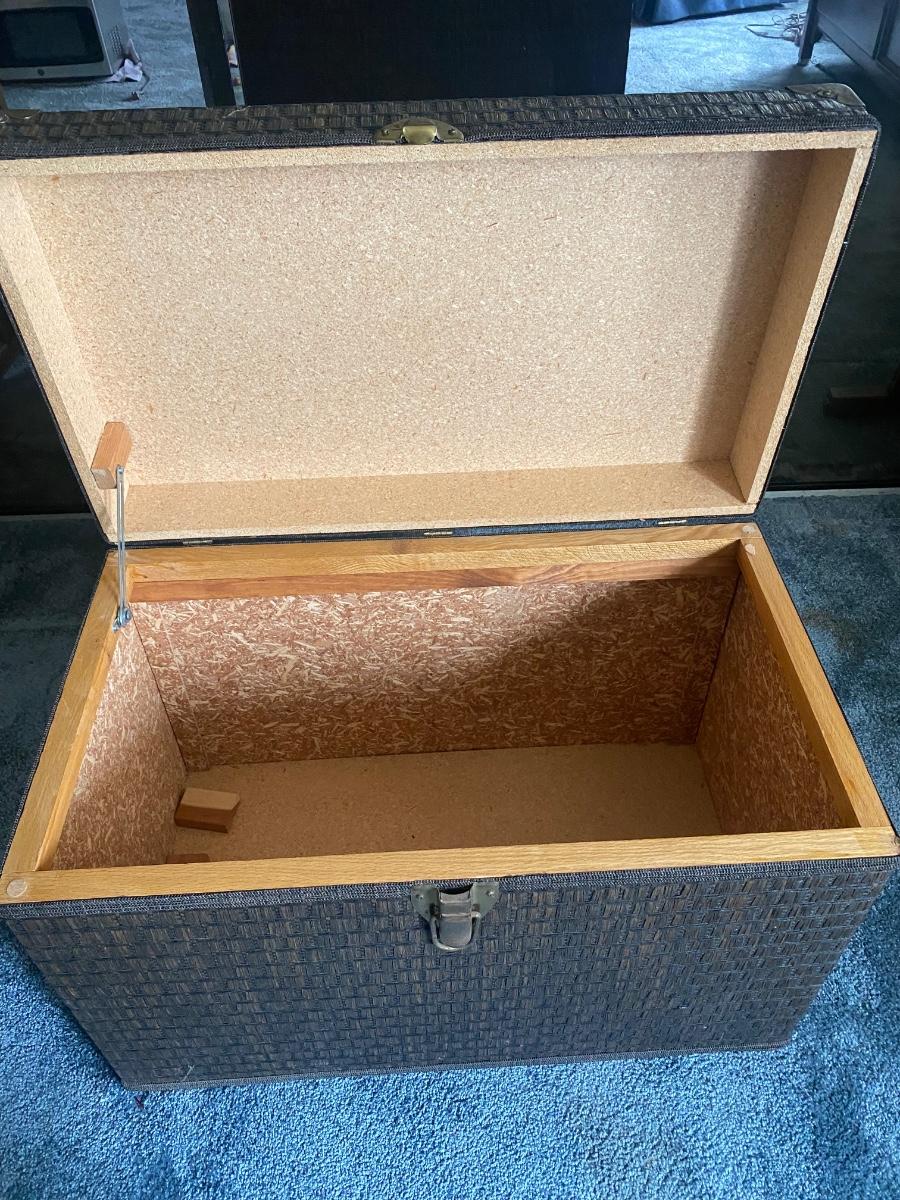 Vintage Wicker Rattan Covered Wood Storage Chest. Sturdy chest, solid wood covered with a rattan like finish. Brass corners and latch, no lock. Some light wear from age and a little dusty. Great for side table use also. About 28" wide, 16" deep, and 20" tall.