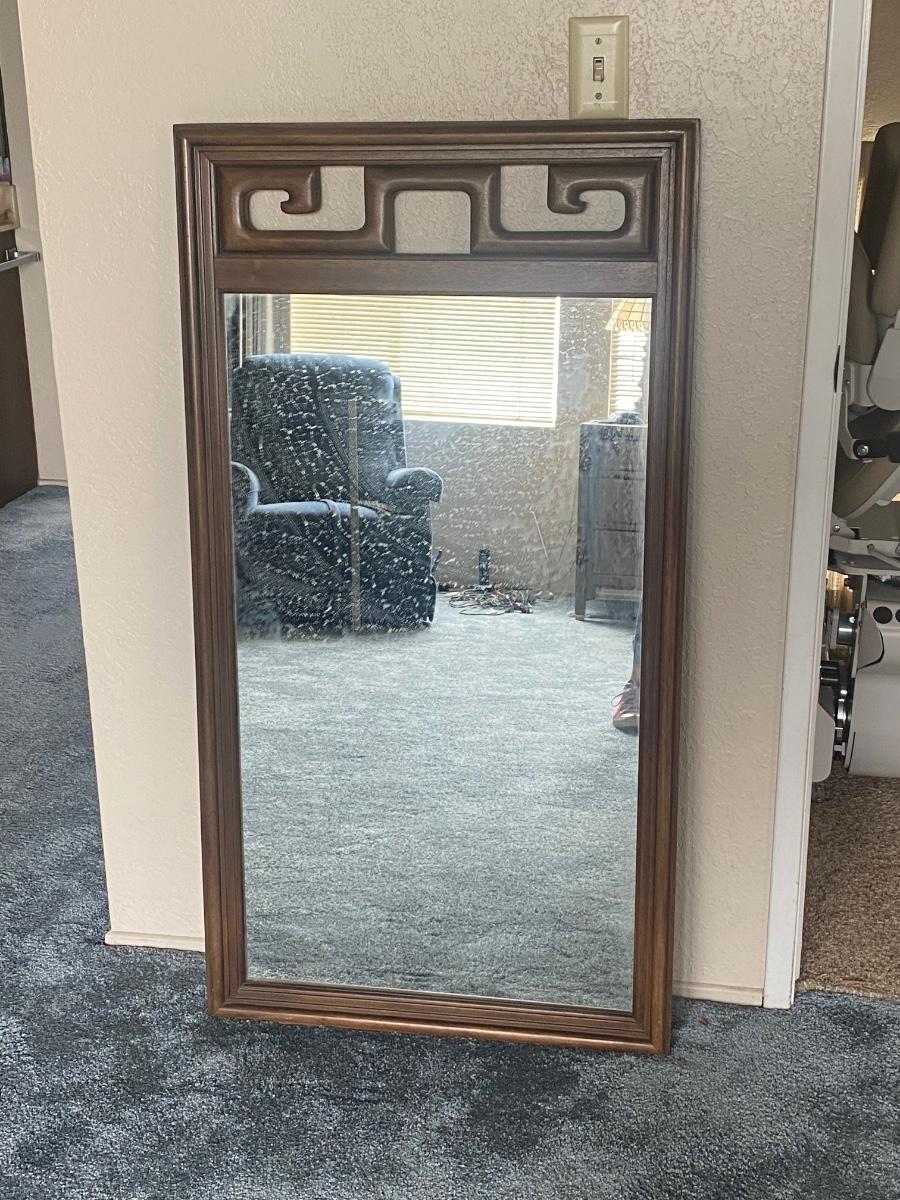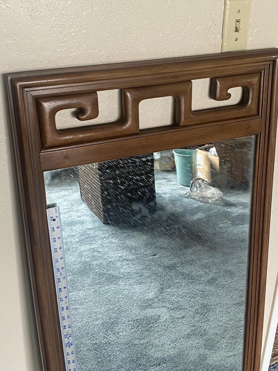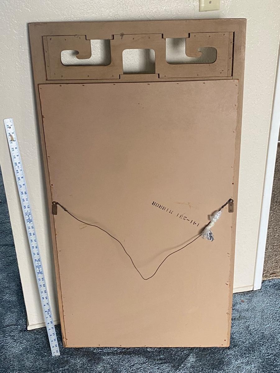 Vintage Mid Century Asian Style Wood Wall Mirror by Century Furniture. Single wall mirror about 25"x48" size. Mirror needs to be cleaned but in otherwise good useable condition.