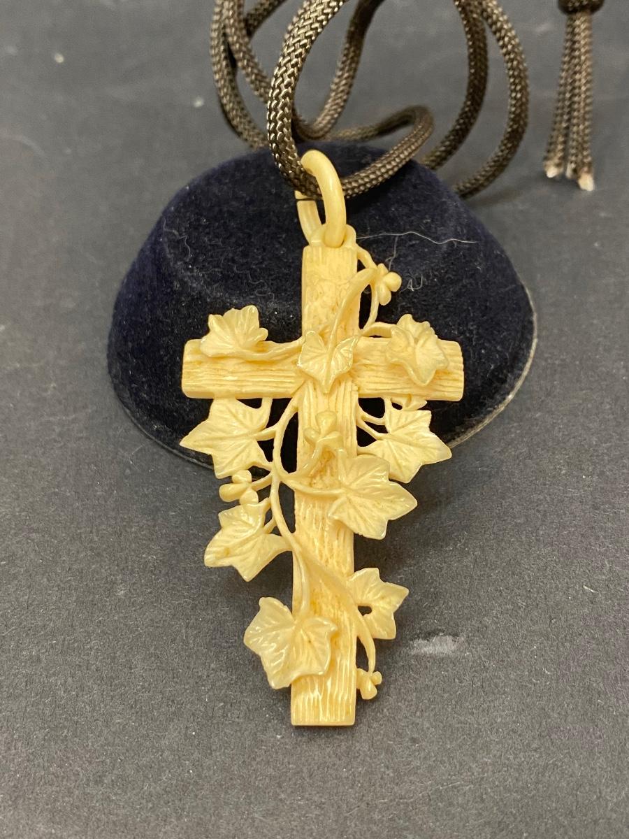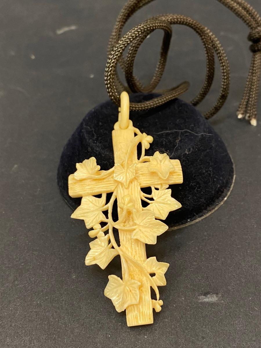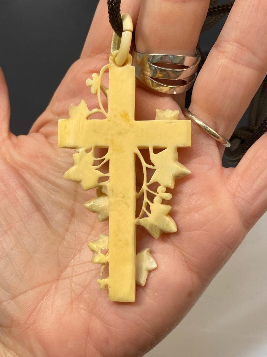 Vintage Bovine Bone Autumn Leaf Religious Cross Necklace