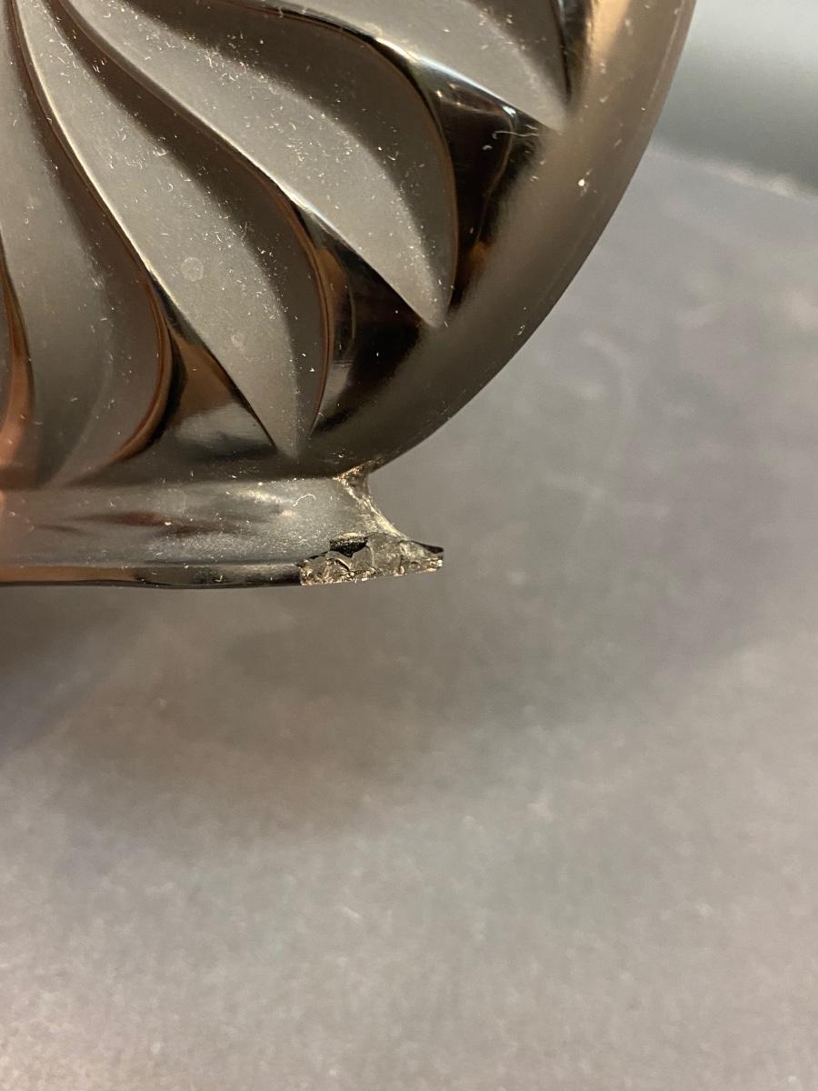 There is a light crack, but there is no significant damage to the bottle and is in overall good collectible or useable condition. Check pictures for more details and for sizing.