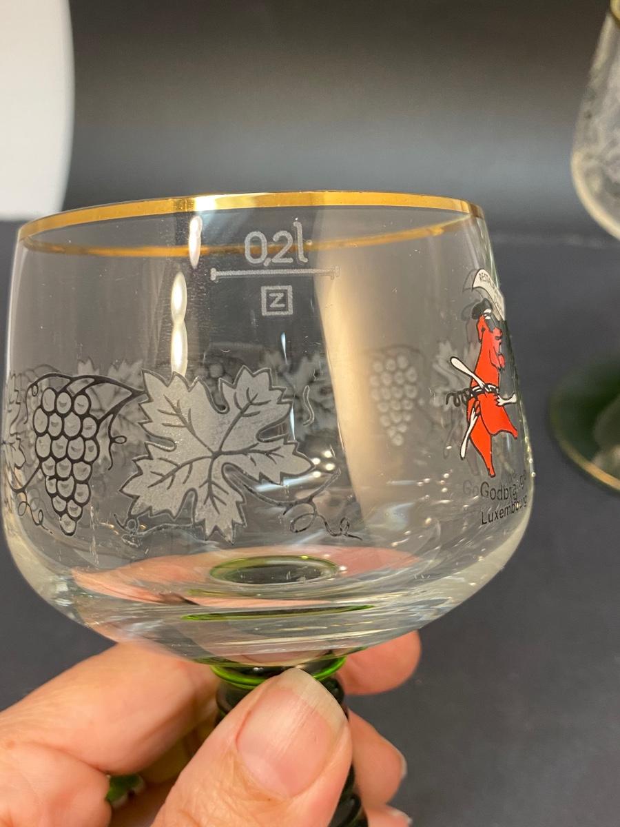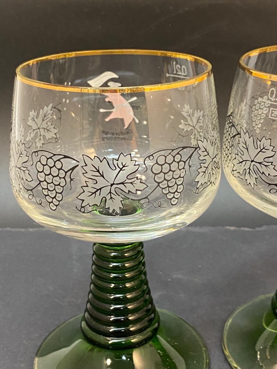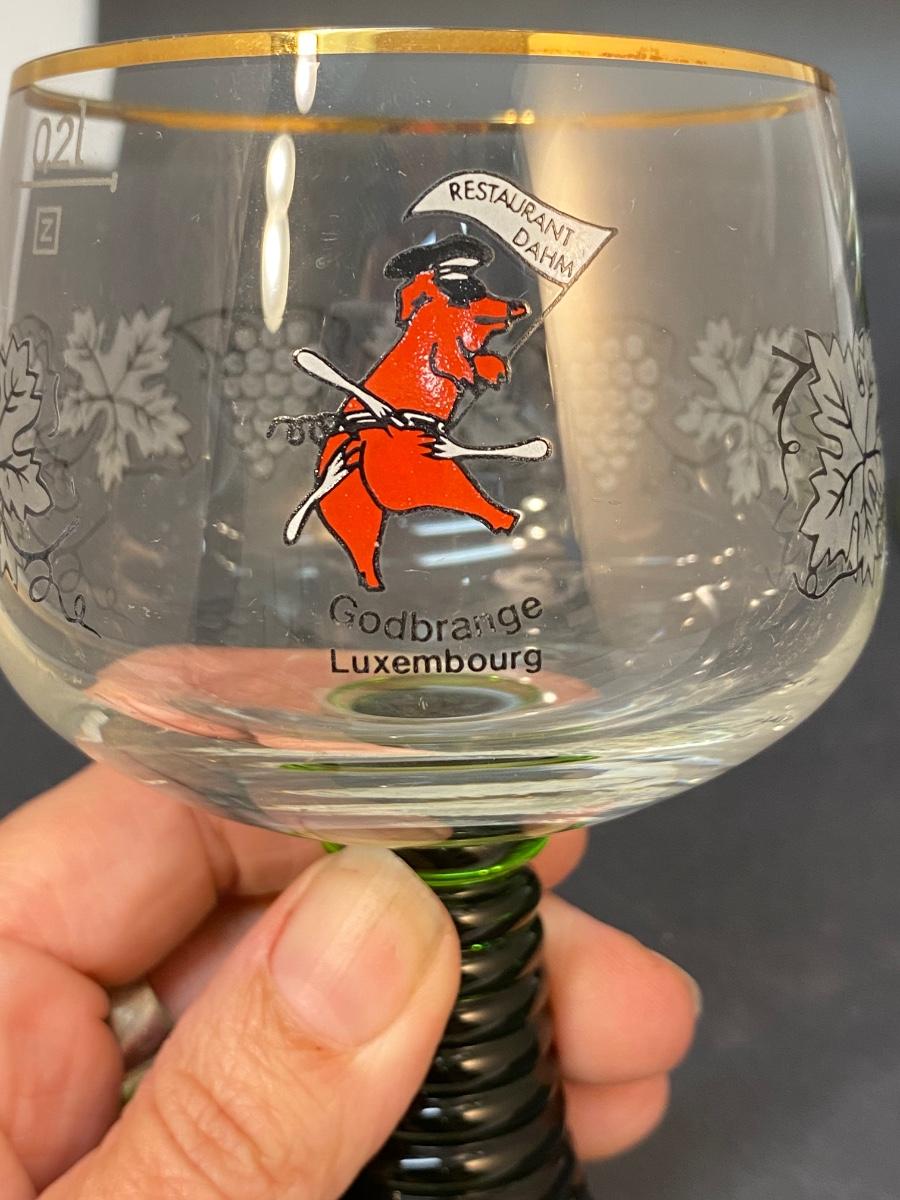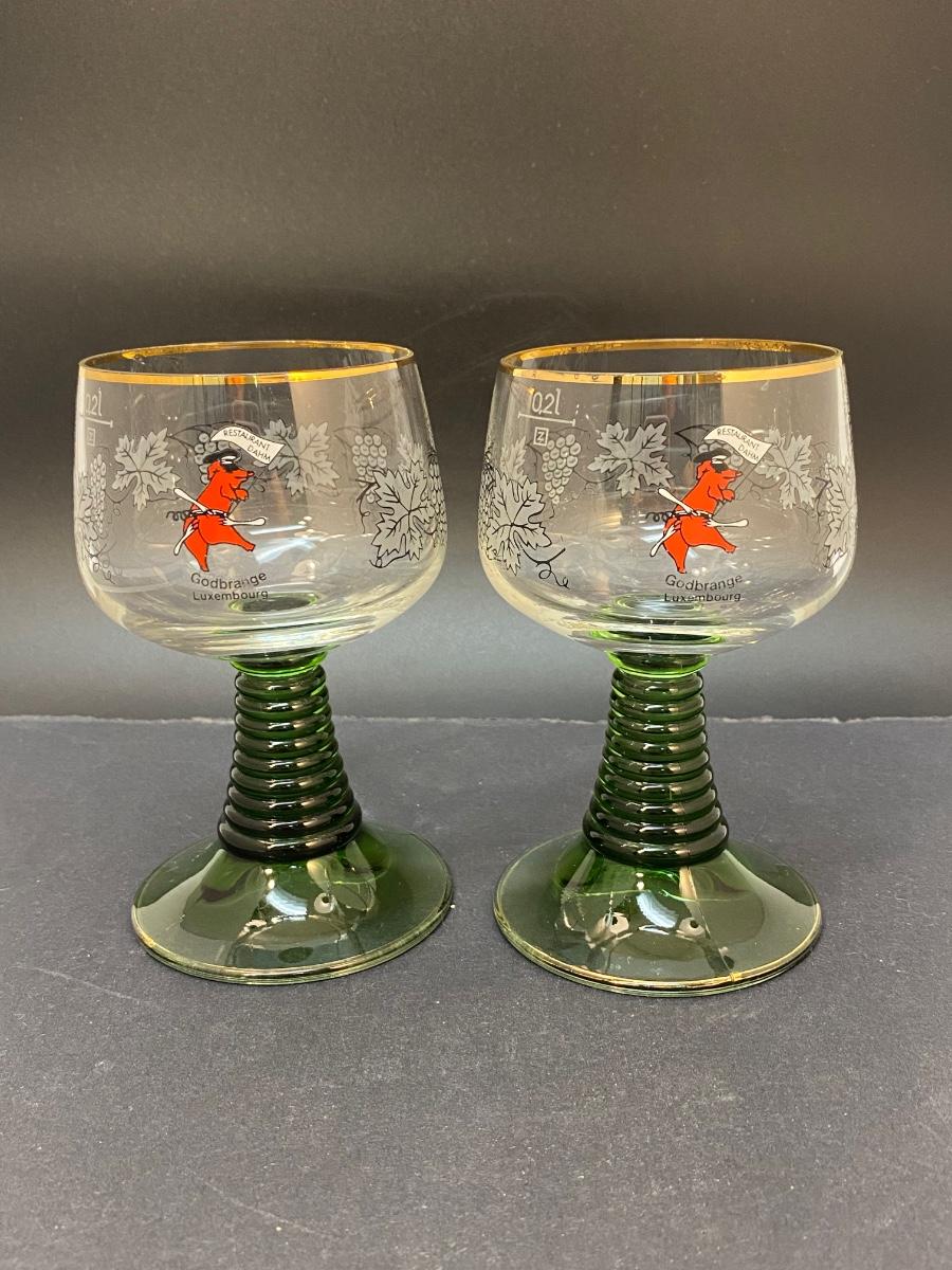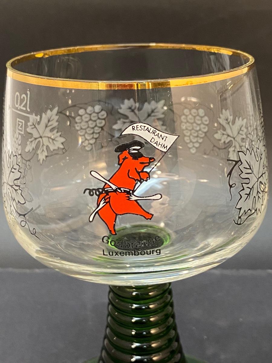 Pair of Vintage German Godbrange Luxembourg Pig Graphic Wine Vino Goblet Glasses