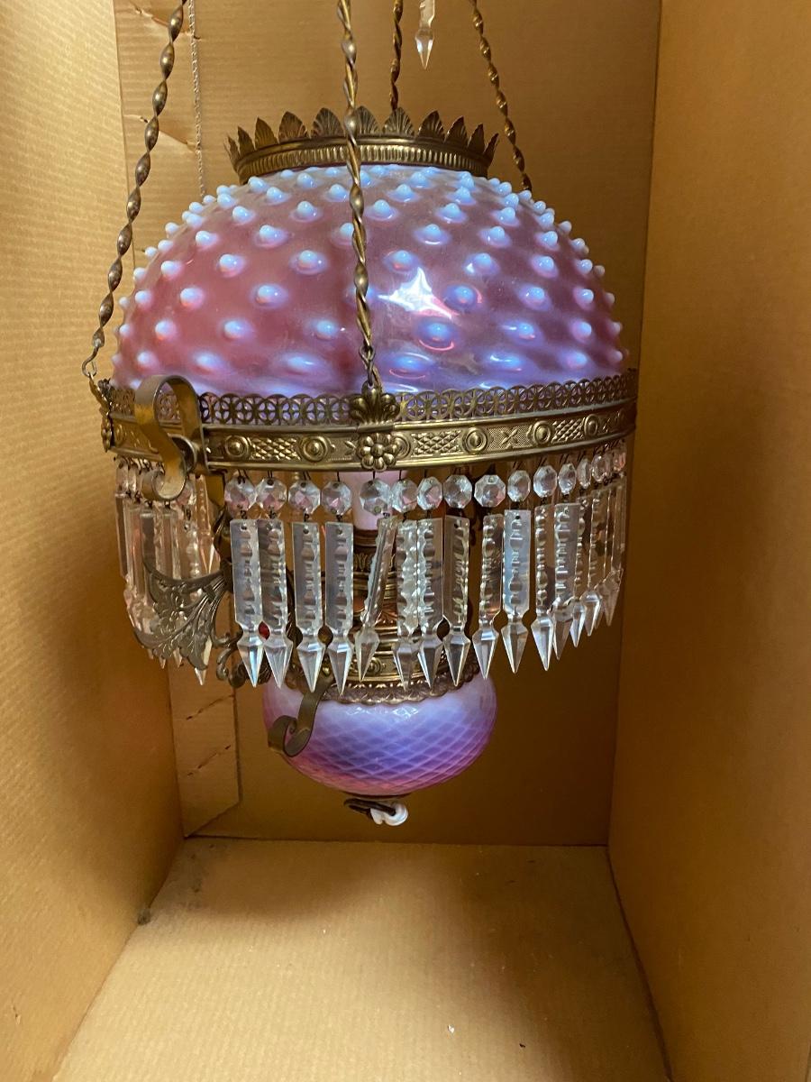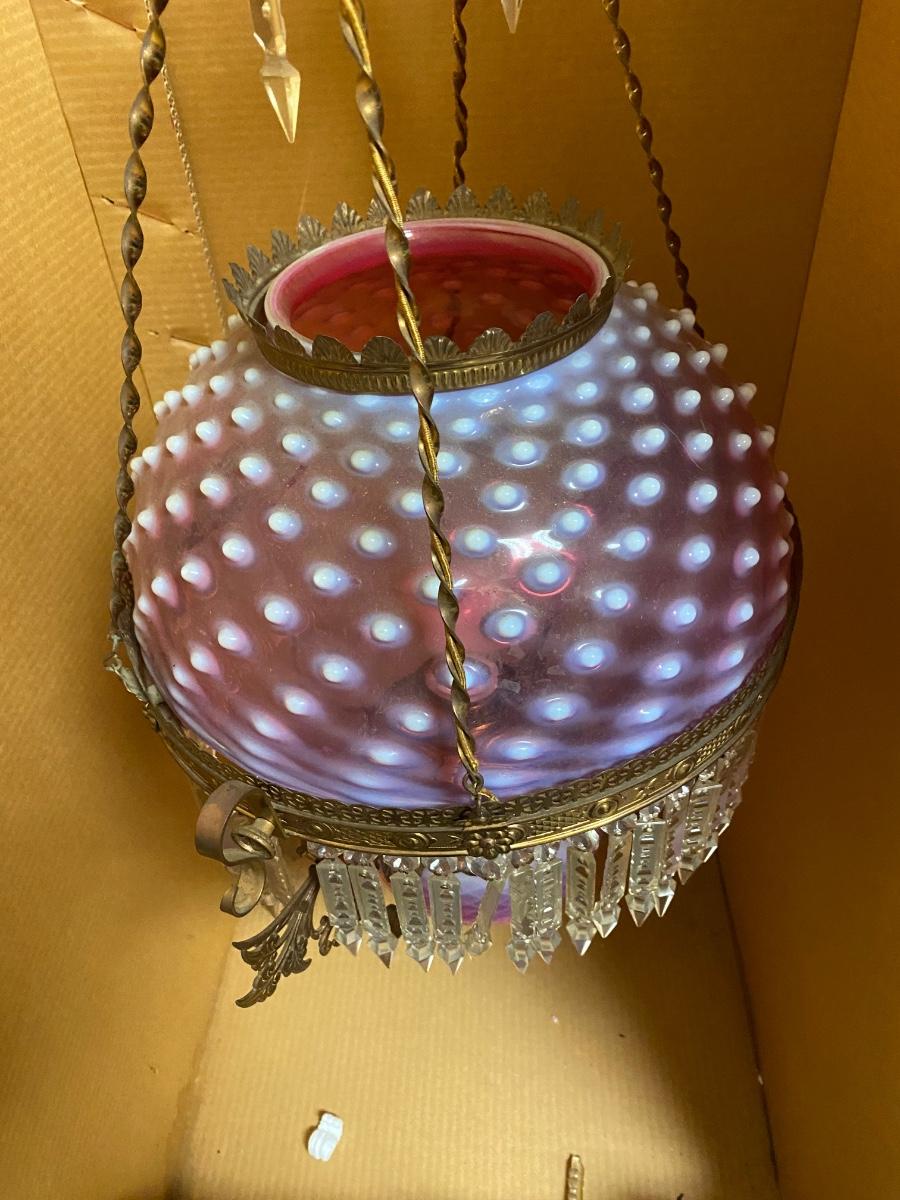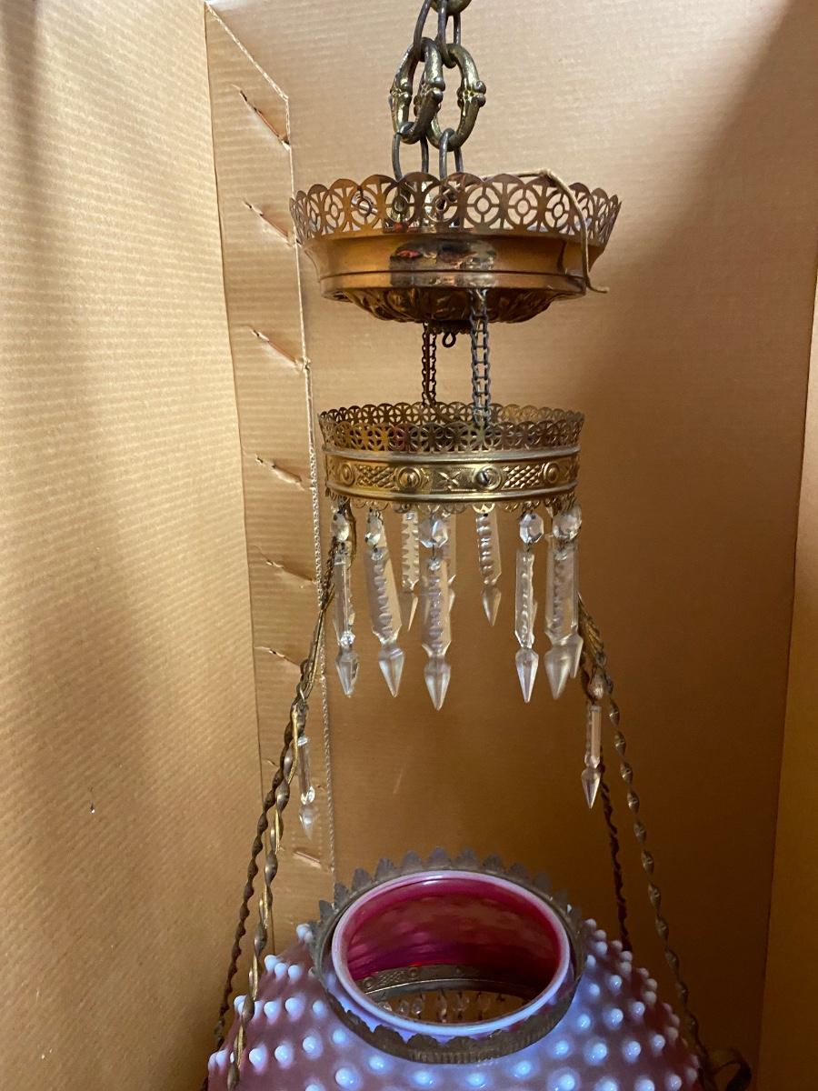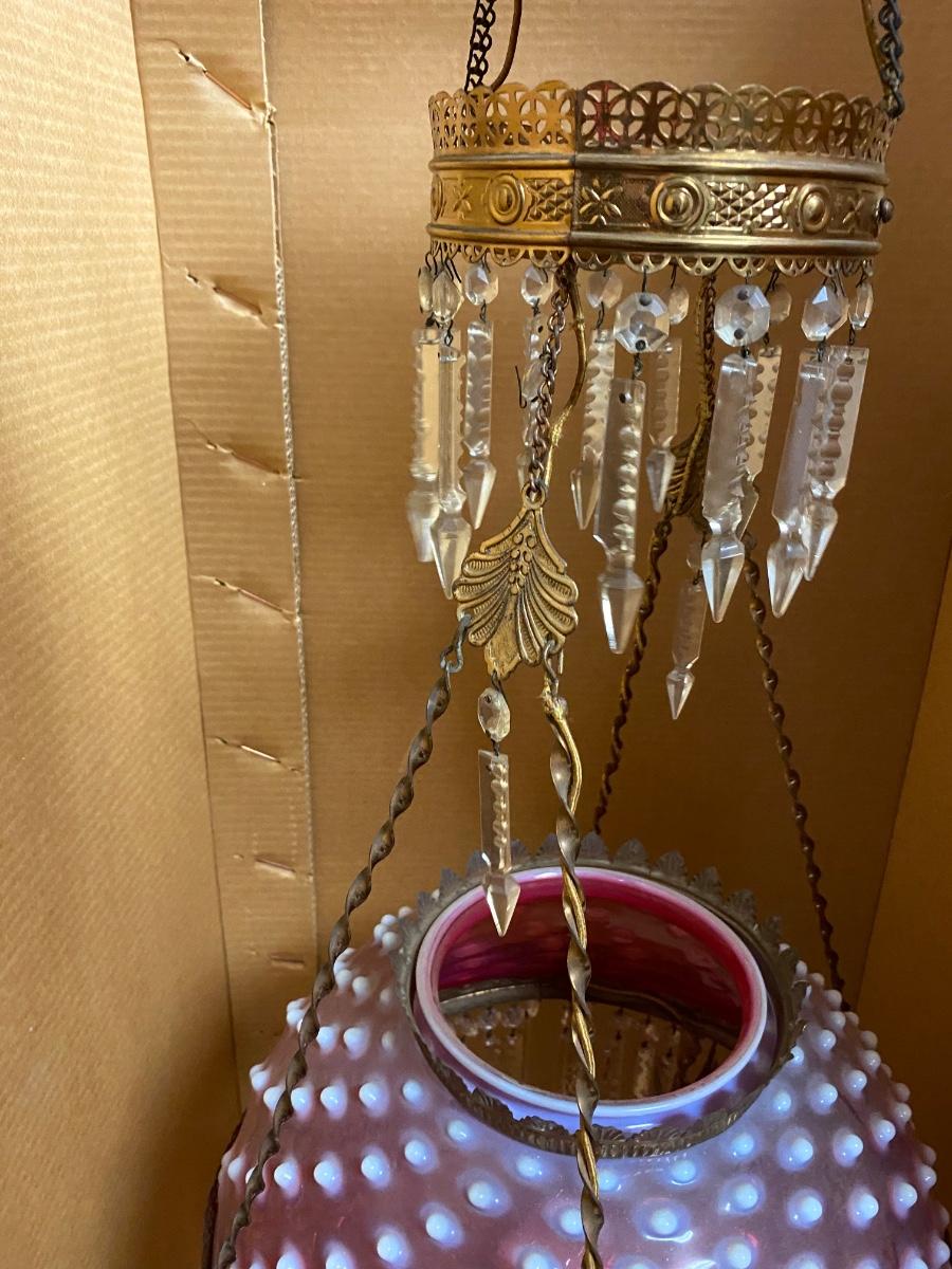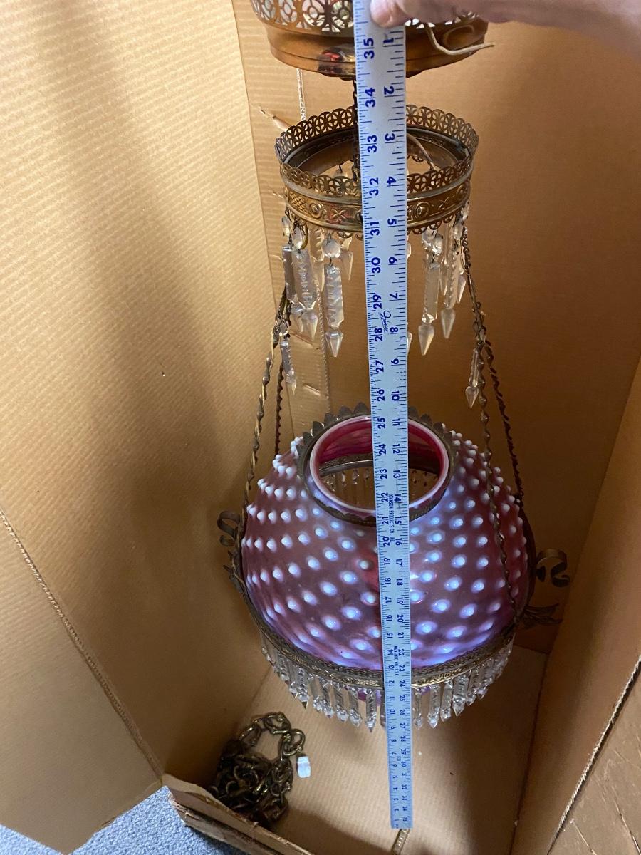 Antique Hanging Chandelier Lamp Light Cranberry Opaque Hobnail Glass with Crystals. In good antique condition. Over 3' length from end to end not including chain. Untested, needs to be hard wired. Glass pieces are in good condition, no chips or cracks found. May be missing a hanging crystal or two but looks to have most of them in place. Believe it only takes one light bulb in the glass dome, no bulb in the lower glass part. Beautiful opaque white over cranberry glass.