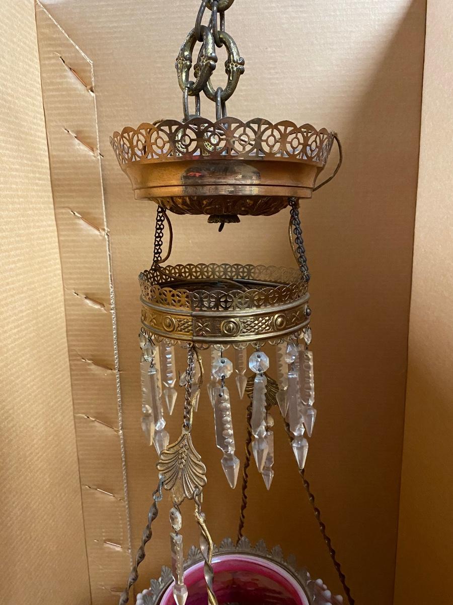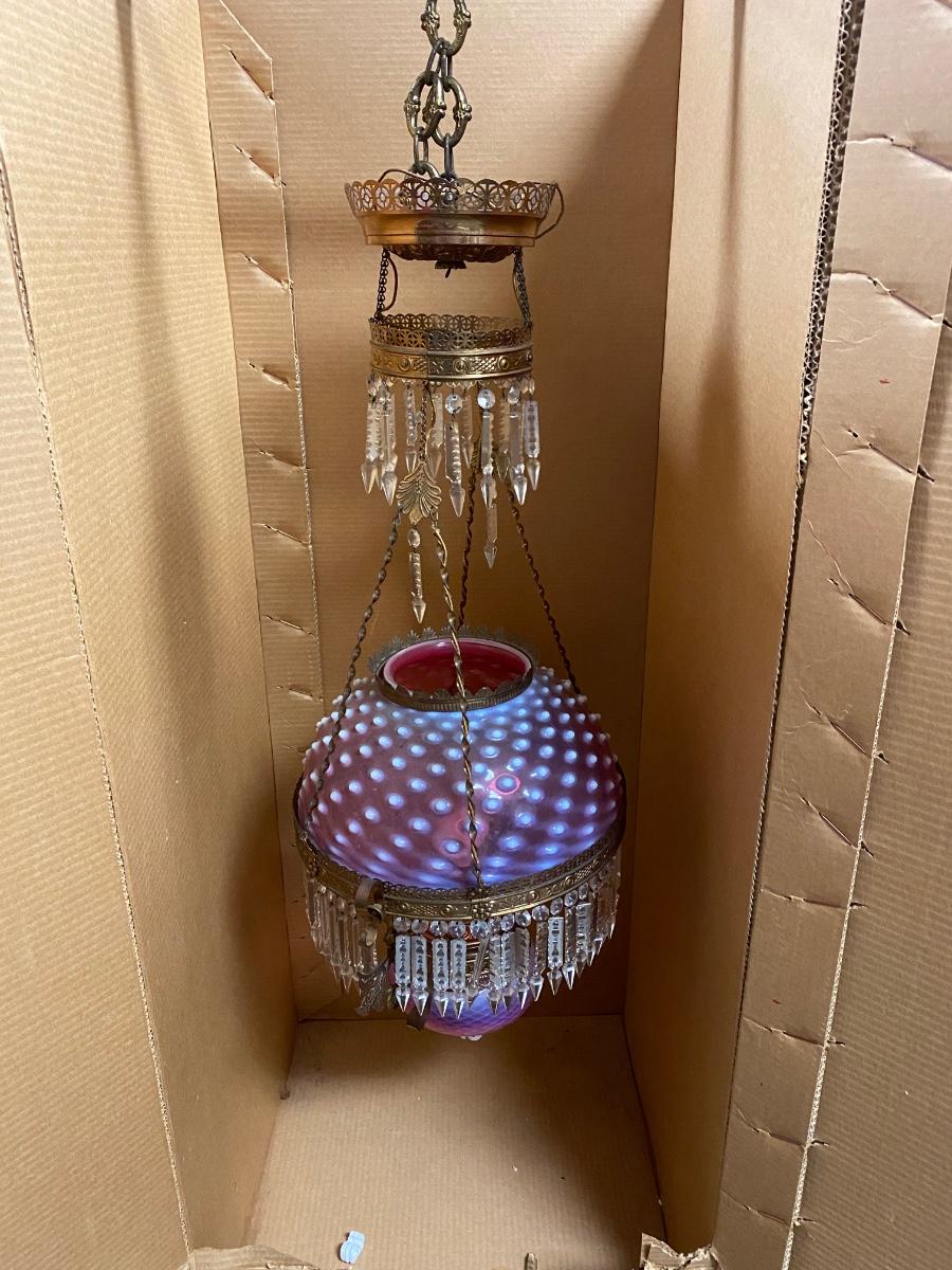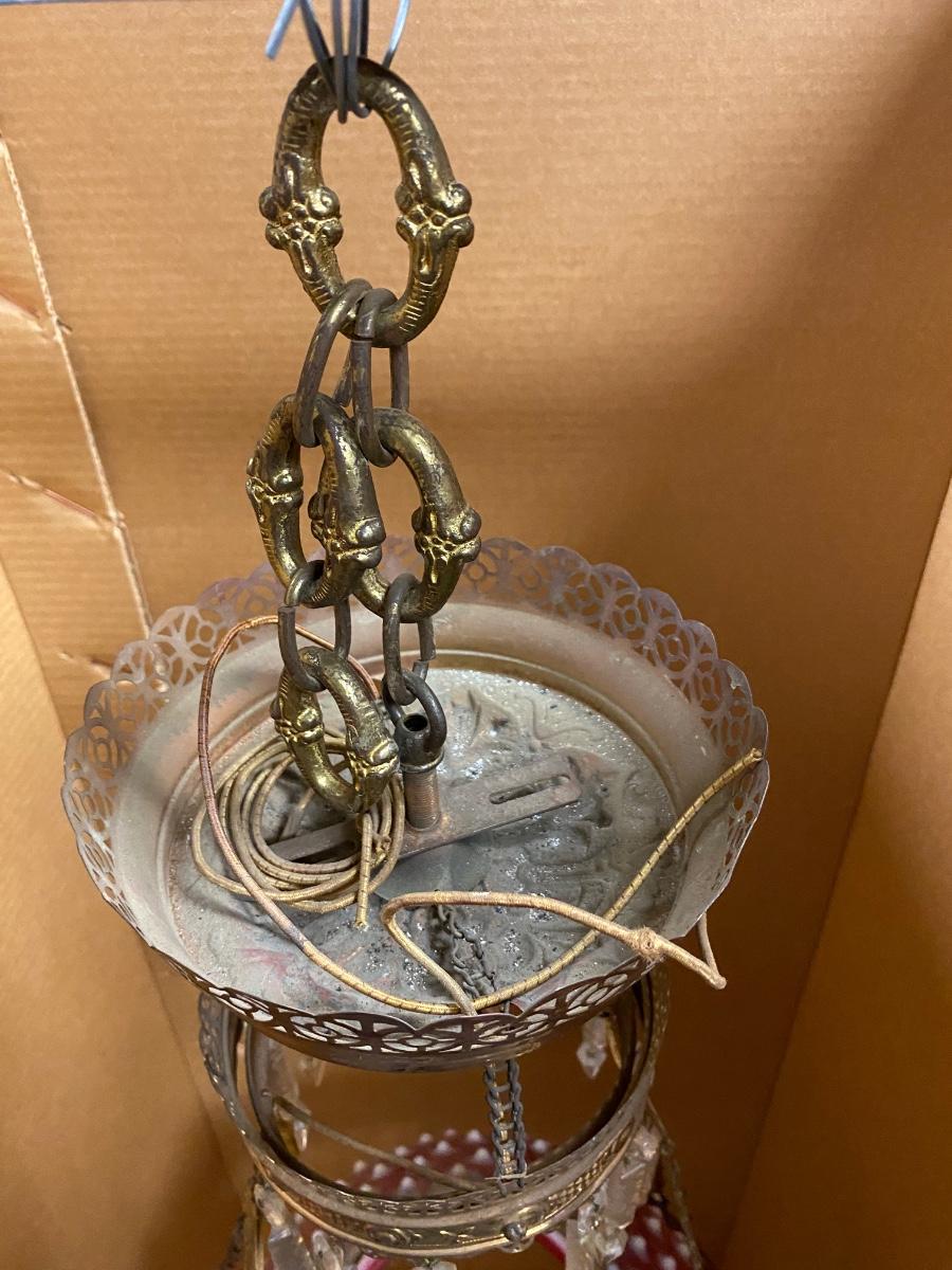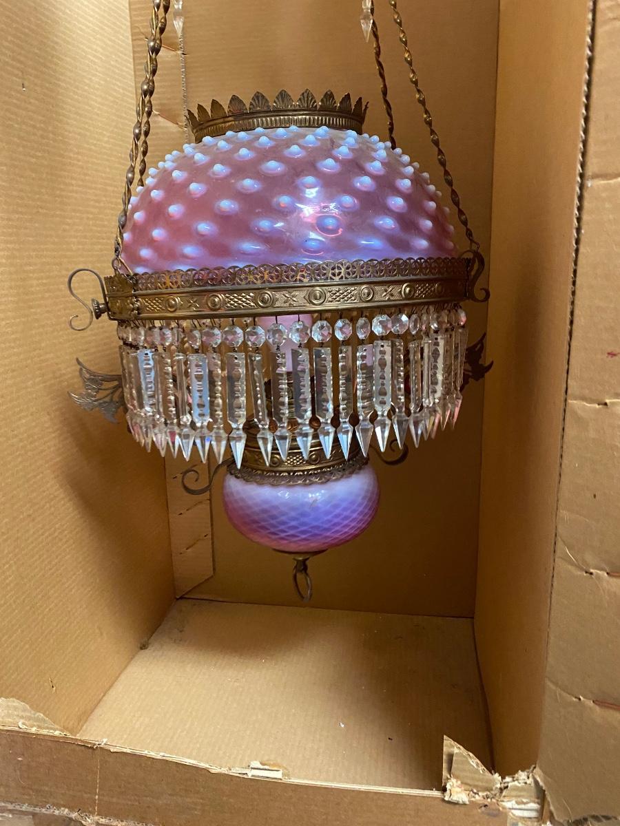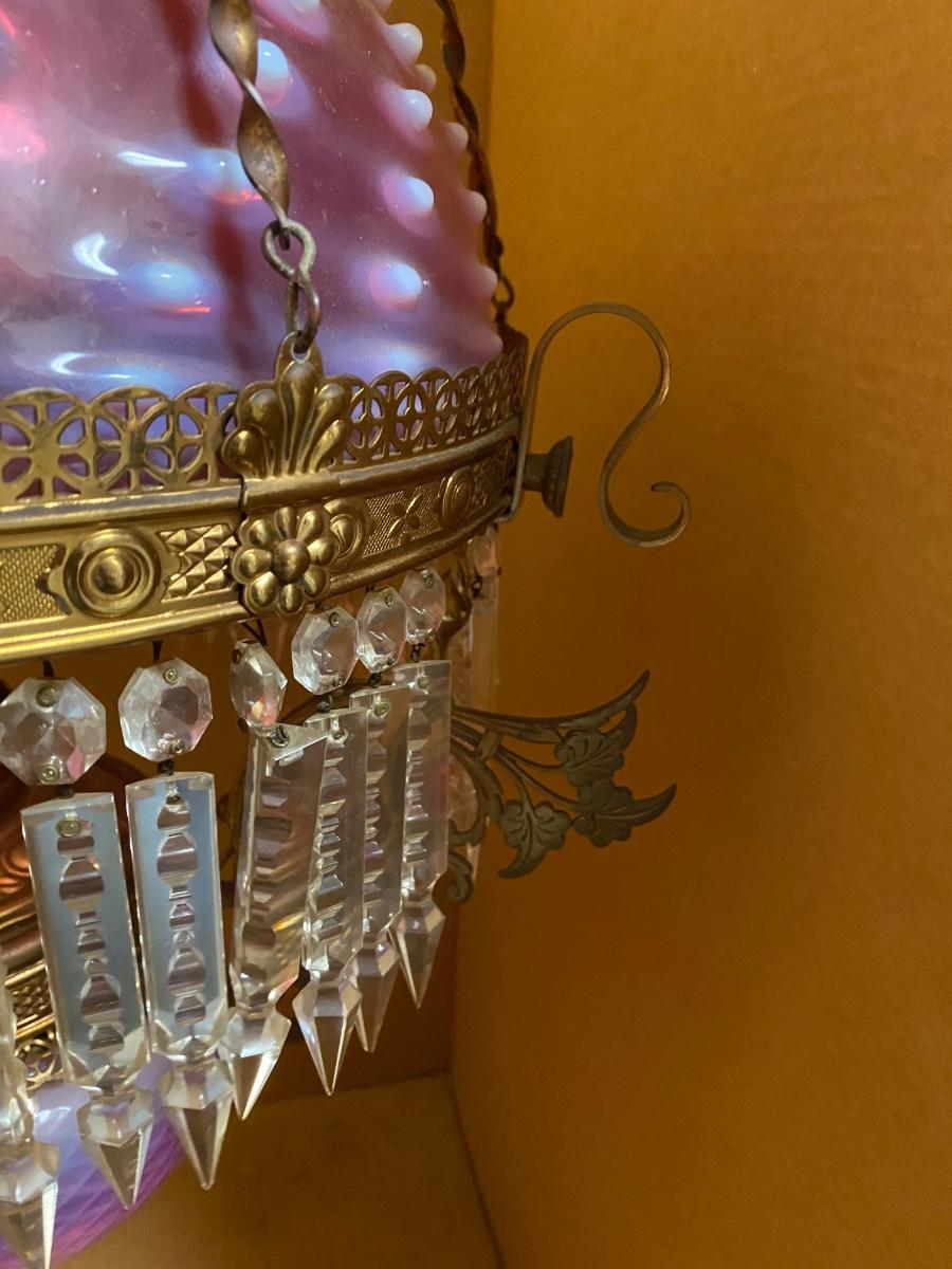 Antique Hanging Chandelier Lamp Light Cranberry Opaque Hobnail Glass with Crystals. In good antique condition. Over 3' length from end to end not including chain. Untested, needs to be hard wired. Glass pieces are in good condition, no chips or cracks found. May be missing a hanging crystal or two but looks to have most of them in place. Believe it only takes one light bulb in the glass dome, no bulb in the lower glass part. Beautiful opaque white over cranberry glass.