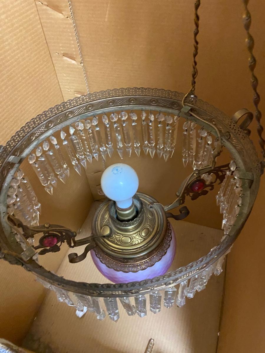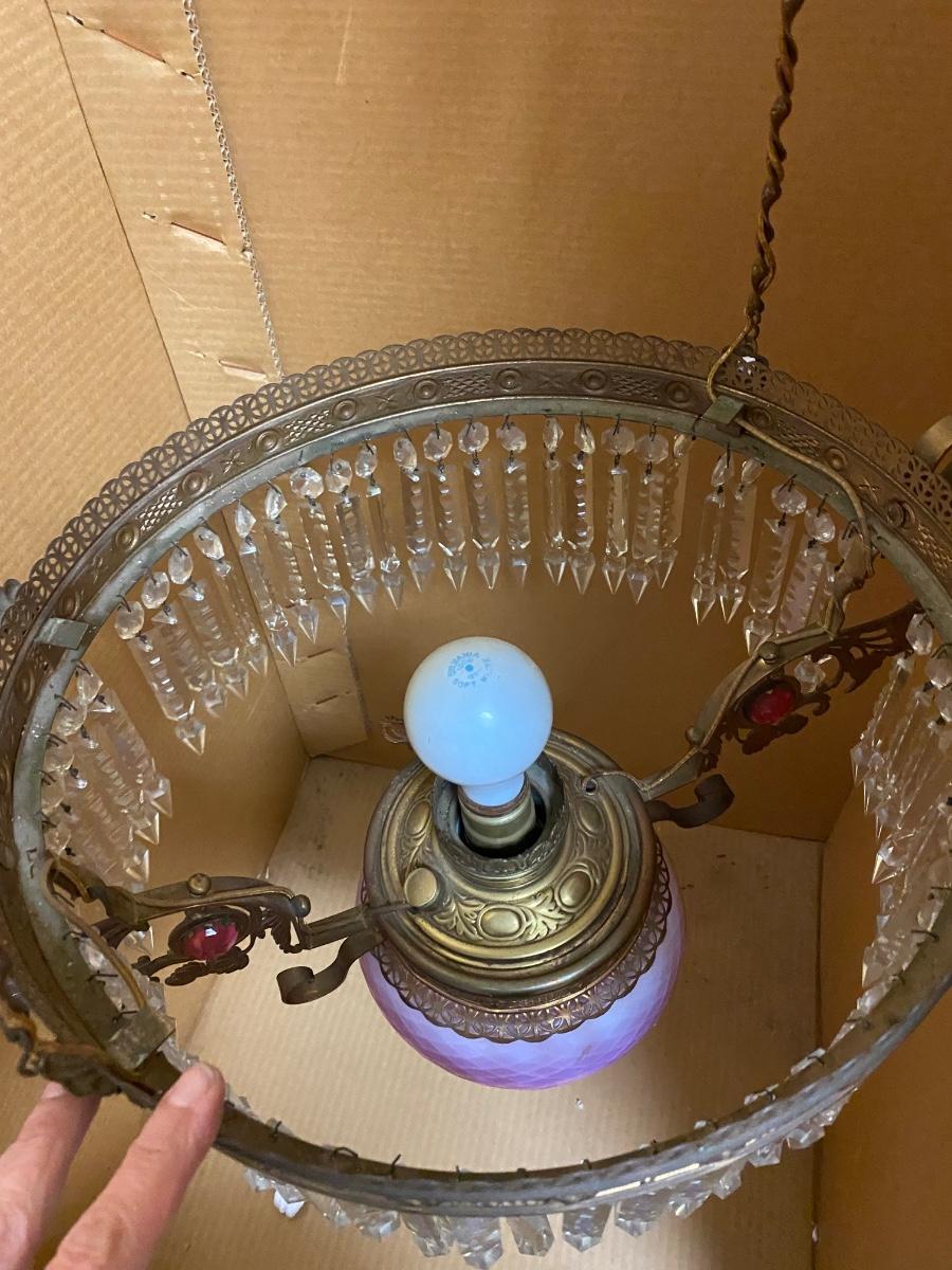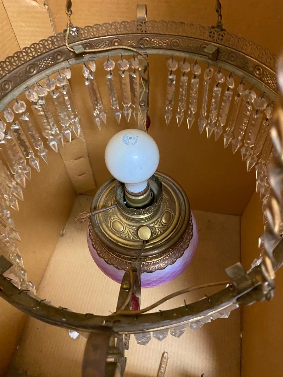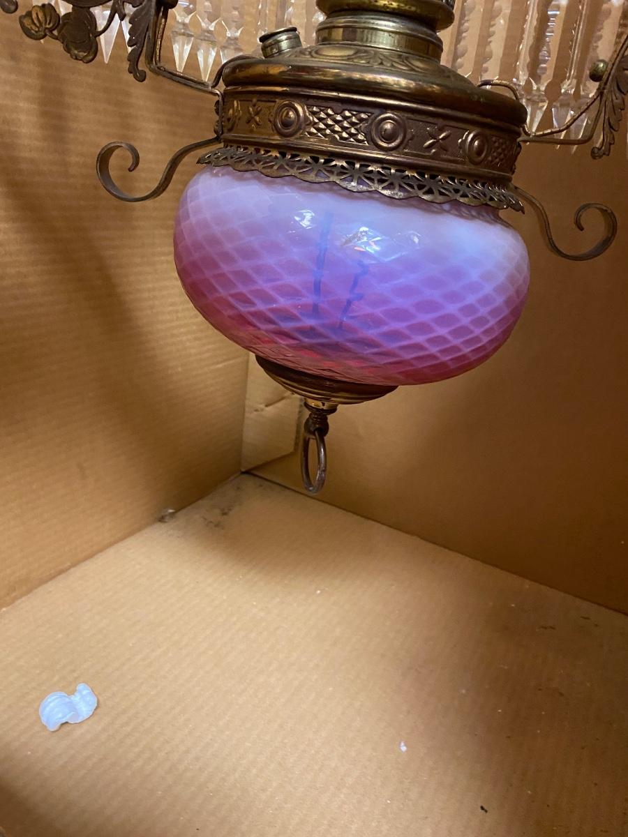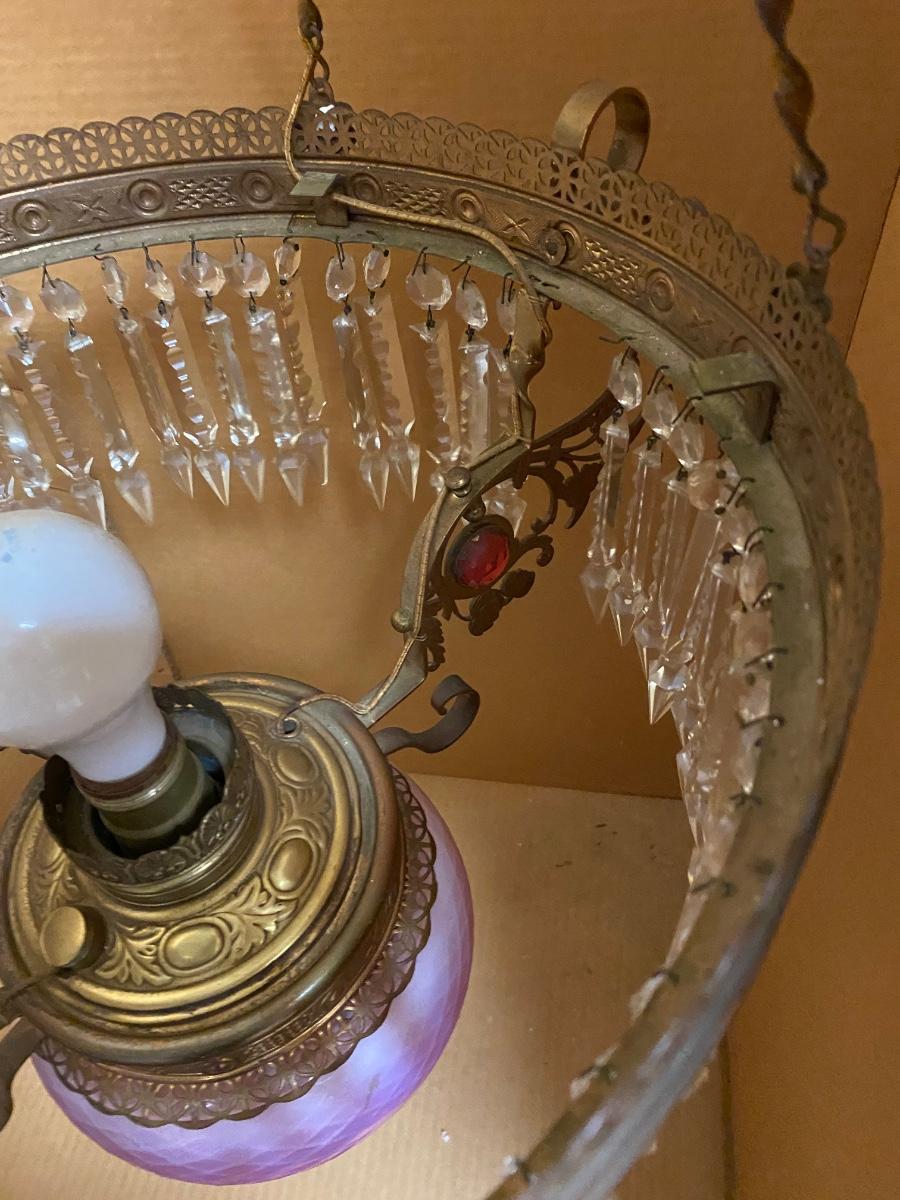 Antique Hanging Chandelier Lamp Light Cranberry Opaque Hobnail Glass with Crystals. In good antique condition. Over 3' length from end to end not including chain. Untested, needs to be hard wired. Glass pieces are in good condition, no chips or cracks found. May be missing a hanging crystal or two but looks to have most of them in place. Believe it only takes one light bulb in the glass dome, no bulb in the lower glass part. Beautiful opaque white over cranberry glass.
