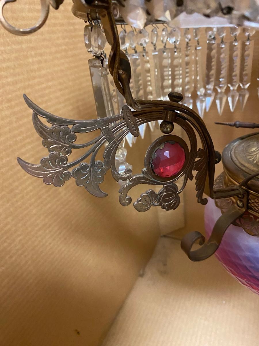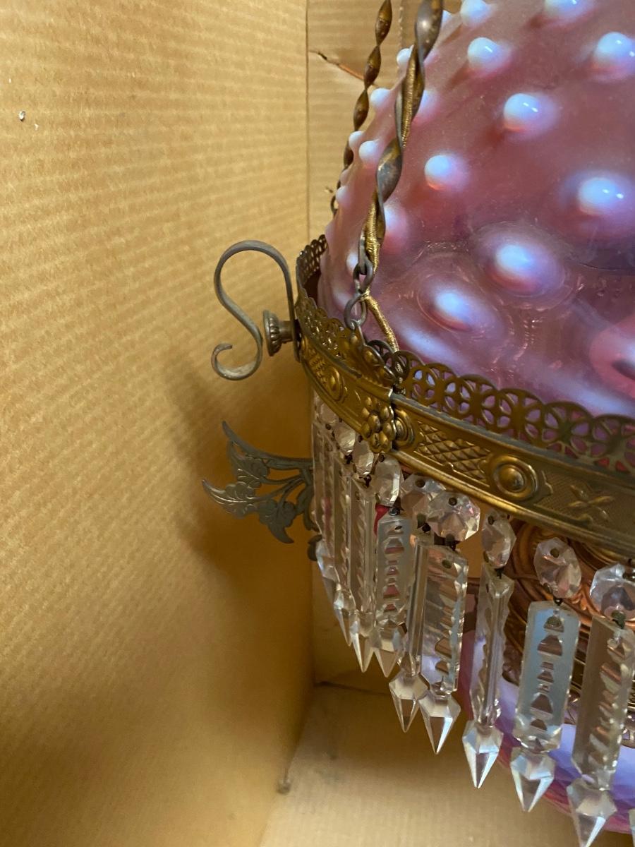 Antique Hanging Chandelier Lamp Light Cranberry Opaque Hobnail Glass with Crystals