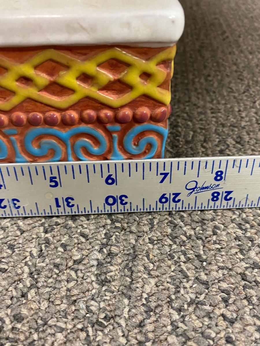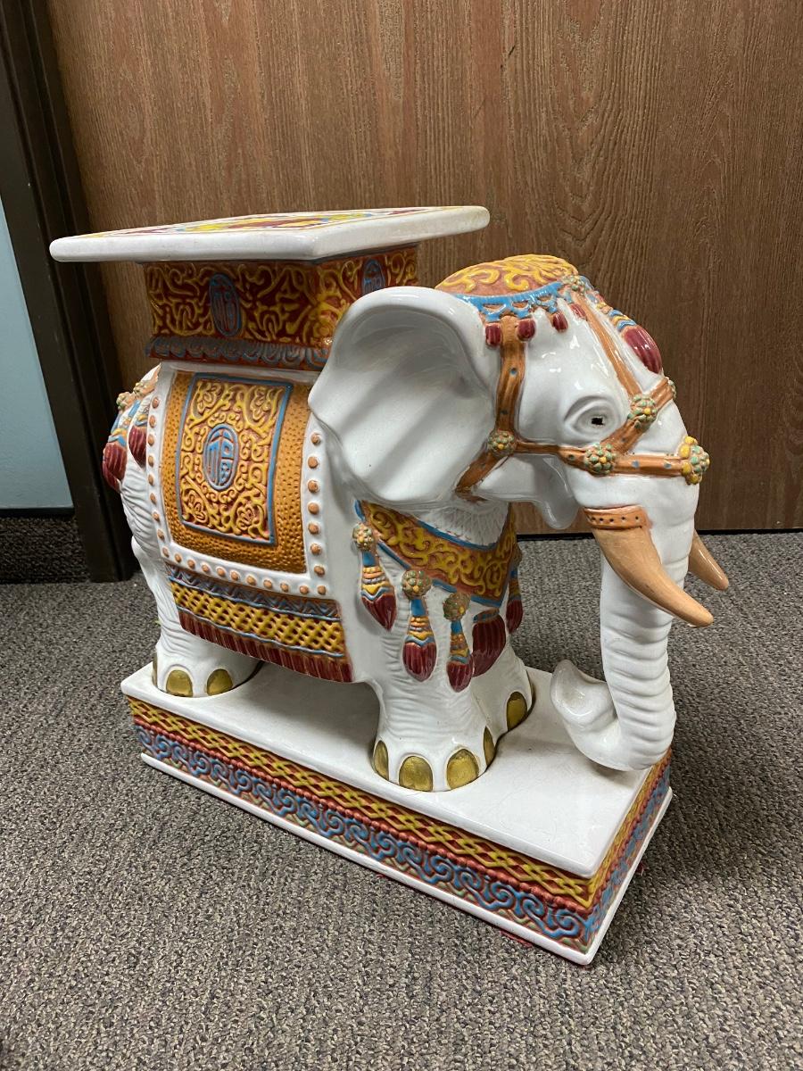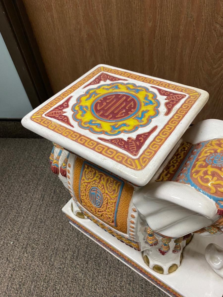Vintage Ceramic Mid Century Asian Indian Elephant Plant Stand Side Table Garden Stool Yard Art. Colorful white elephant stool. No chips in ceramic but there is crazing from age. About 17.5" tall.