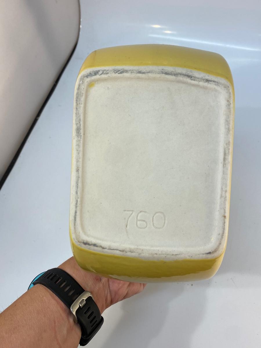 Vintage Sunshine Mustard Yellow Alamo Pottery Pitcher. In good vintage condition. No cracks, chips, or crazing noticed. Great yellow color. Marked 760 on the bottom. About 7.5" tall.