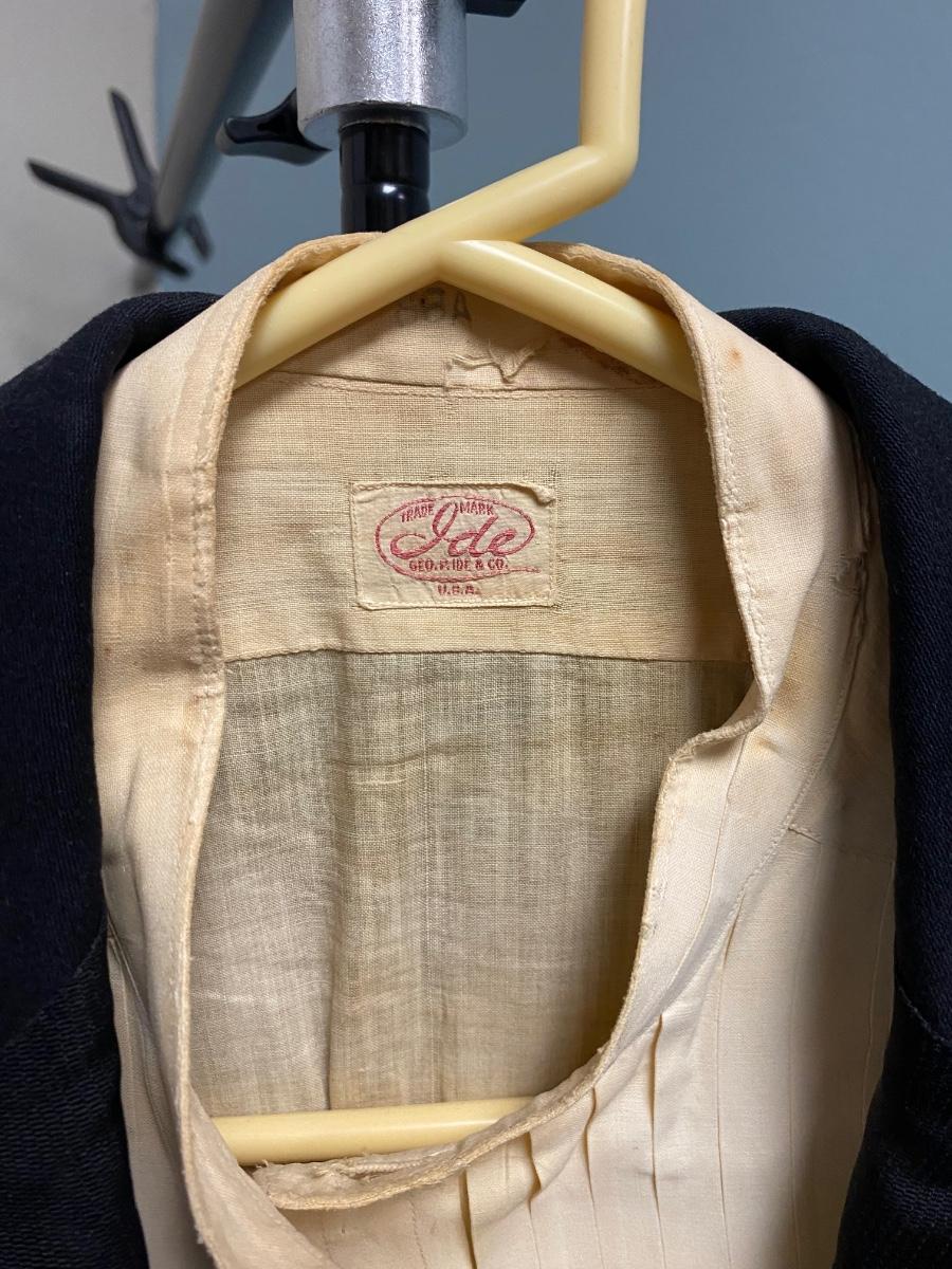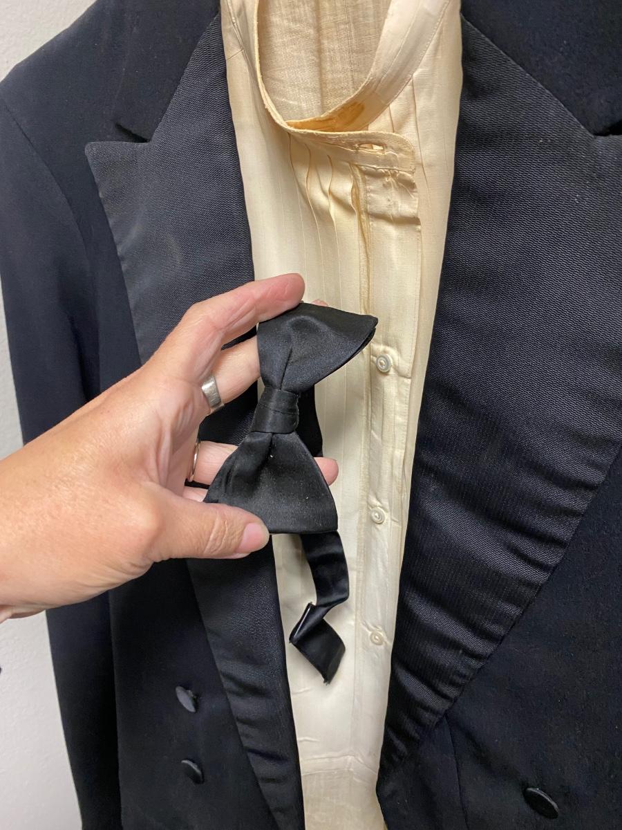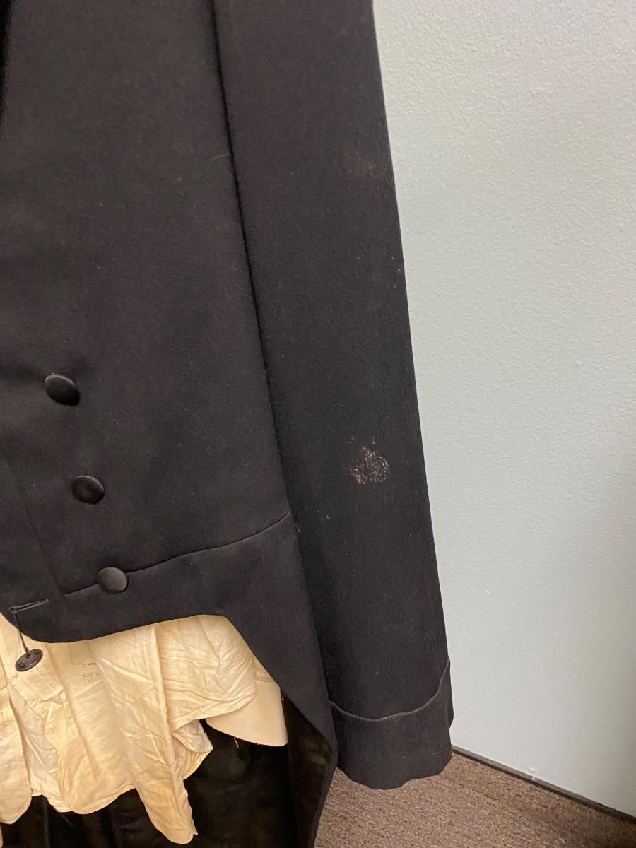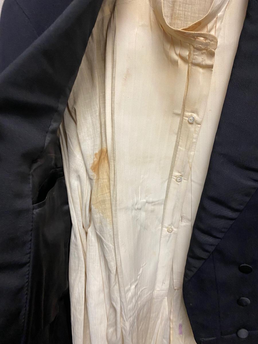 Vintage Victorian Men's Black Tuxedo Suit with Tail Jacket Coat. In vintage condition. Some smudges/spots, unsure how clean they will come. The dress shirt shows the signs of age the most. No size tags, but it is on the smaller side, like a men's medium. Maker tag inside from Lutz & Co.