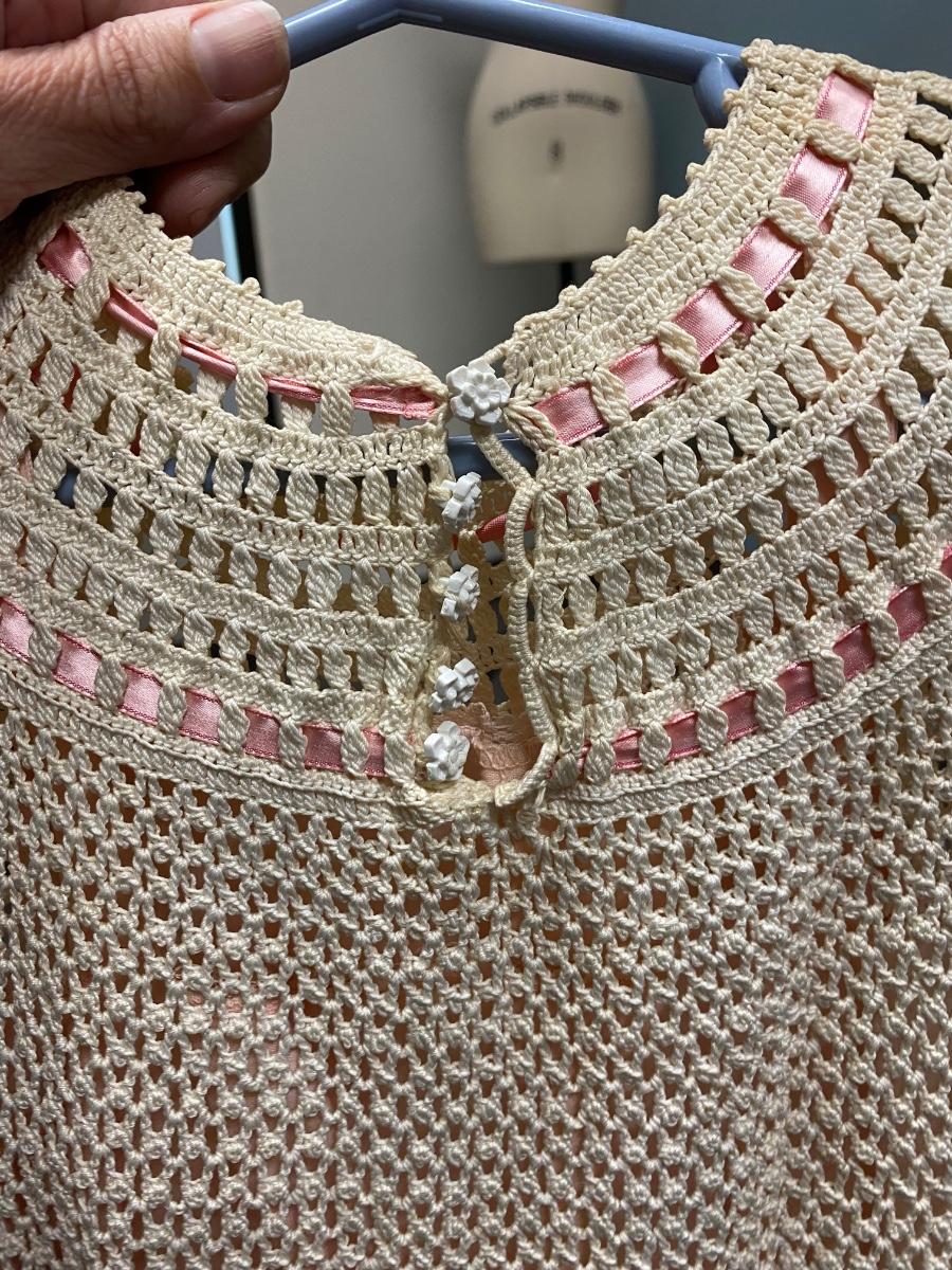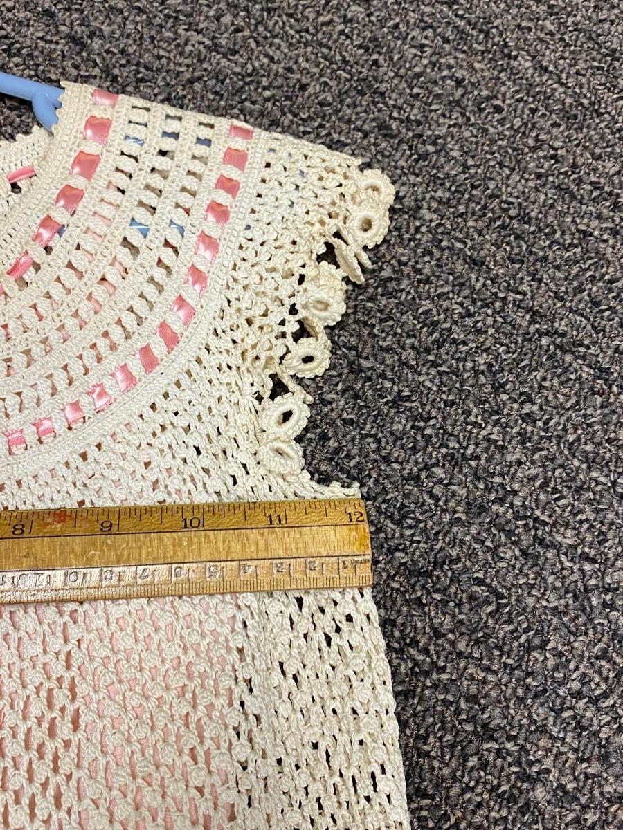Vintage Little Girl's Crochet Sun Dress with Pastel Pink Slip Dress and Ribbon Trim. In good wearable condition. No major spots or stains. Pink slip dress is a size 10.