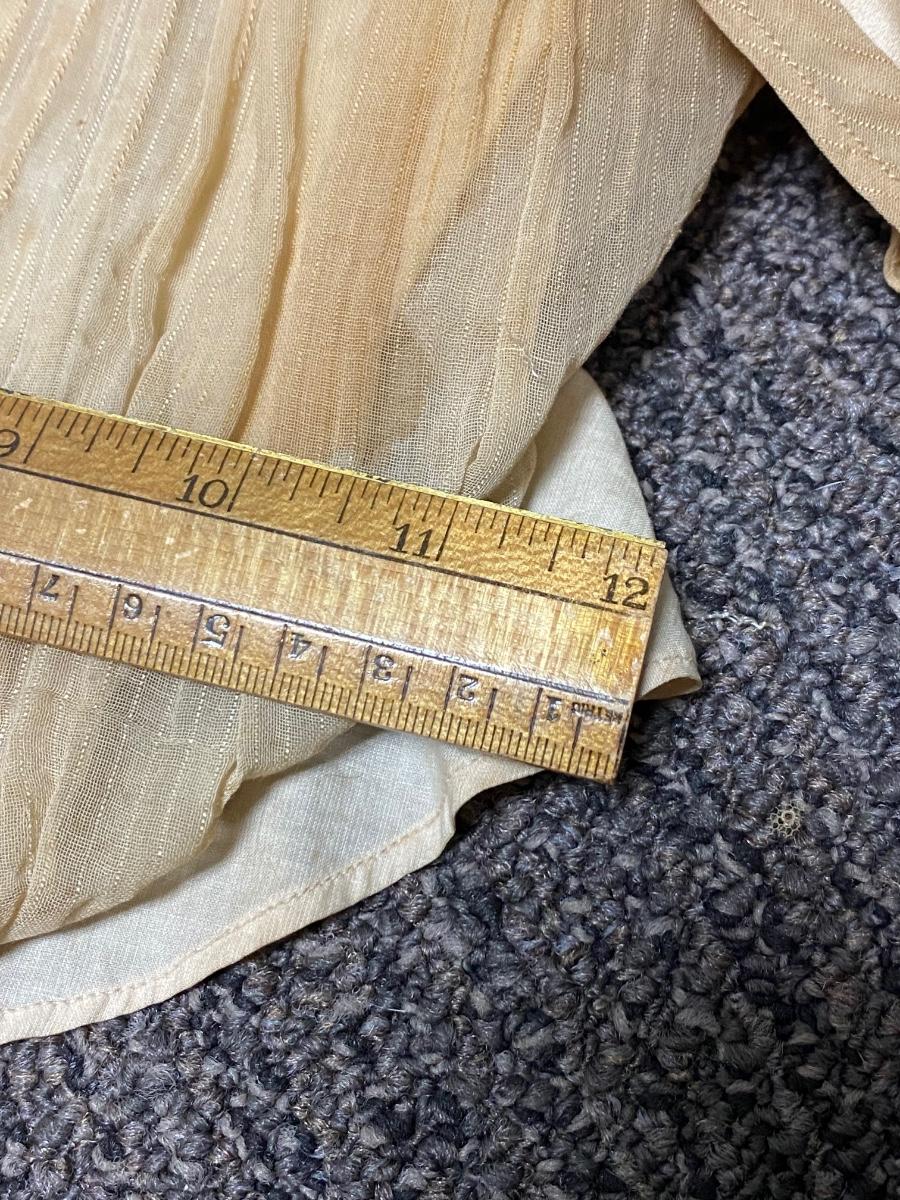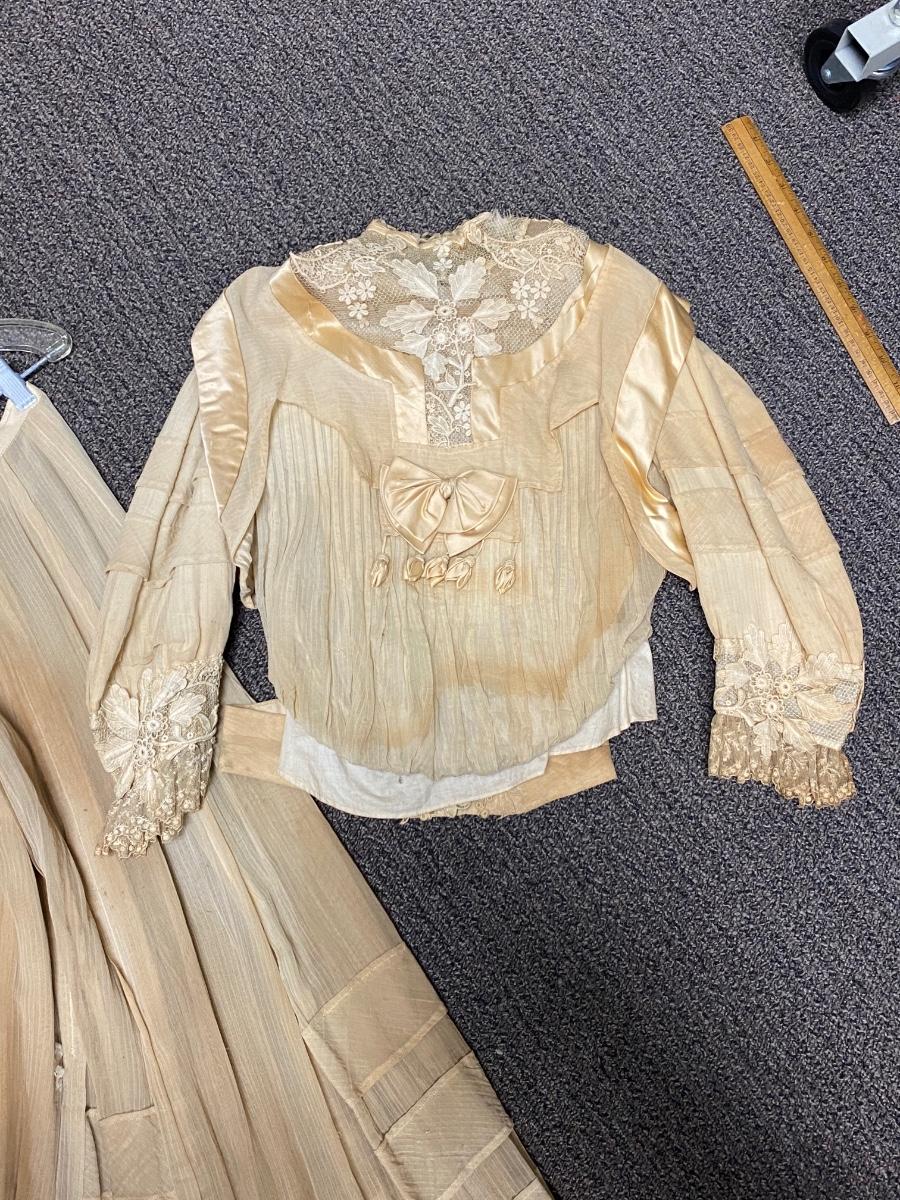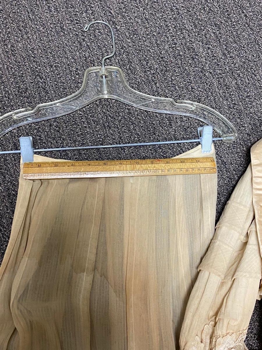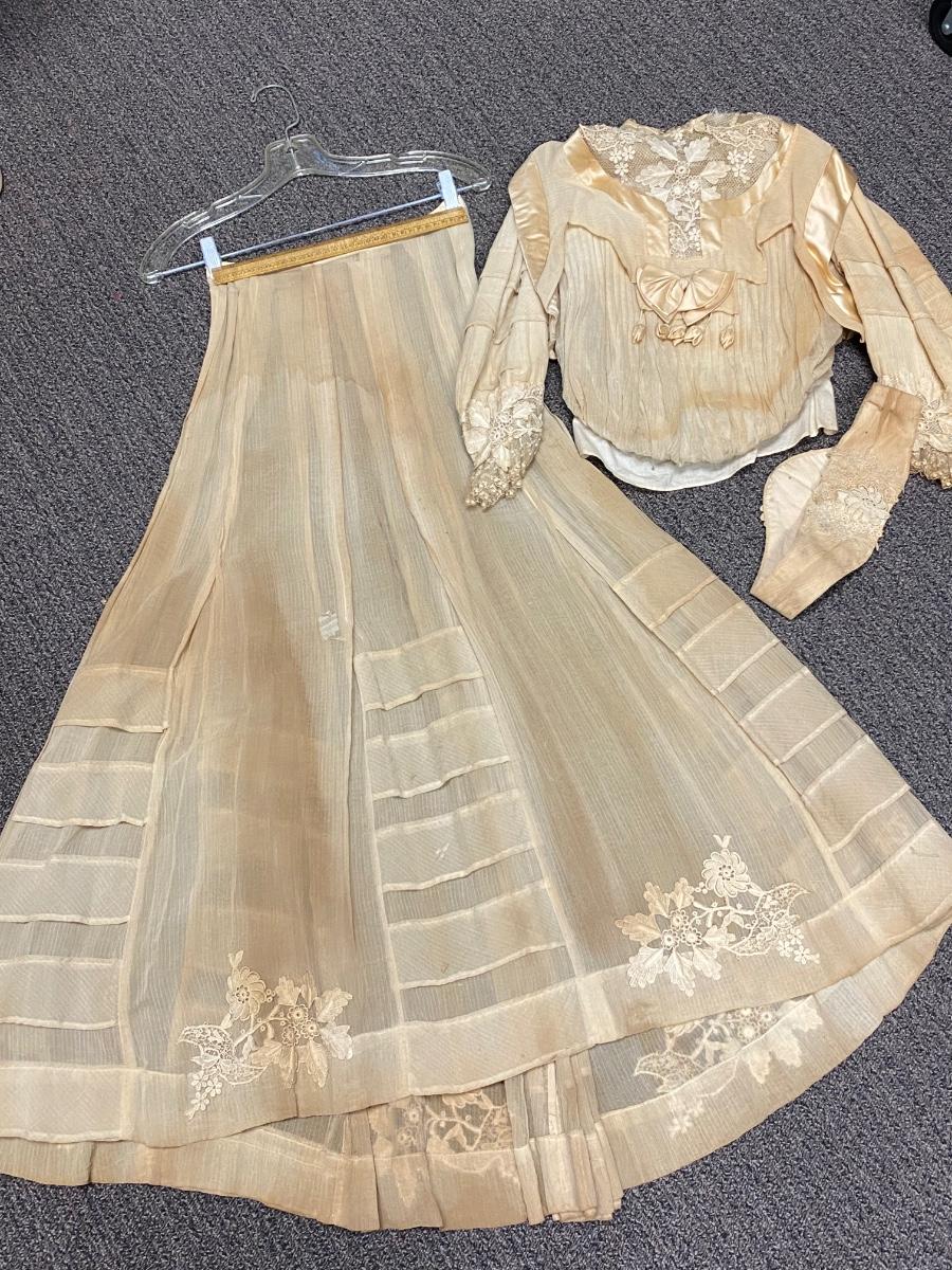 Victorian Vintage Two Piece White Cotton Gibson Girl Blouse & Skirt Set. Discolor from age. Small size, about 12" across the waist of both pieces.
