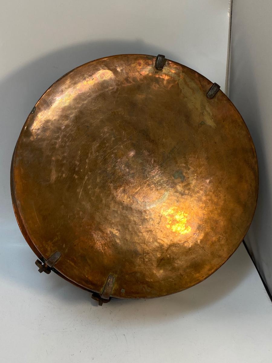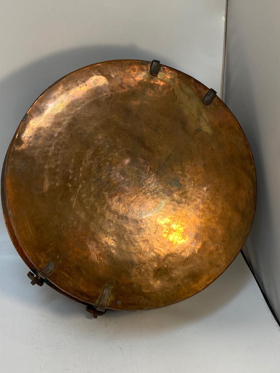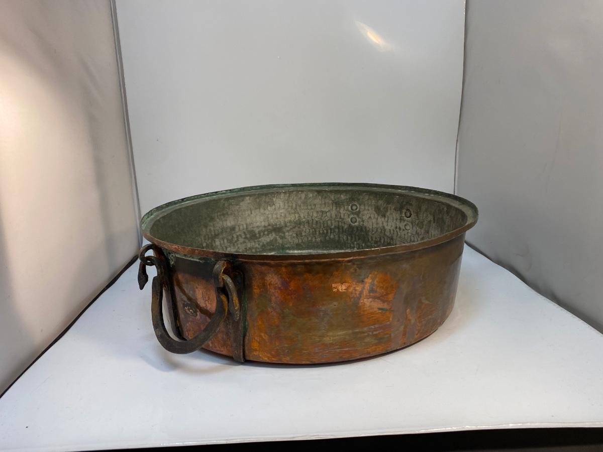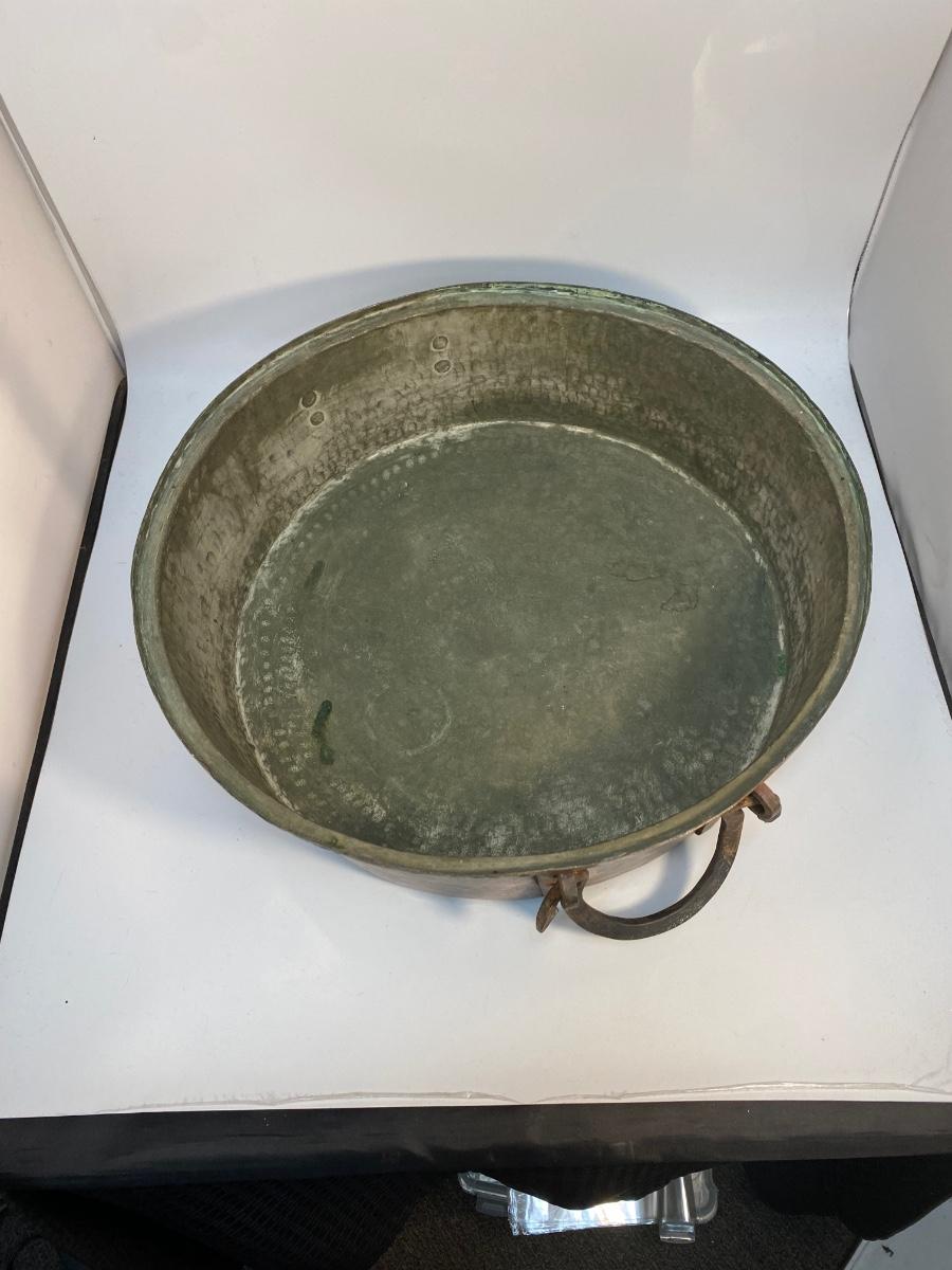 Vintage Large Shallow Hammered Copper Bucket Pail Pan with Handles. In good, aged condition. Displays great. Almost 18" diameter but only 5" deep. Iron handles on sides