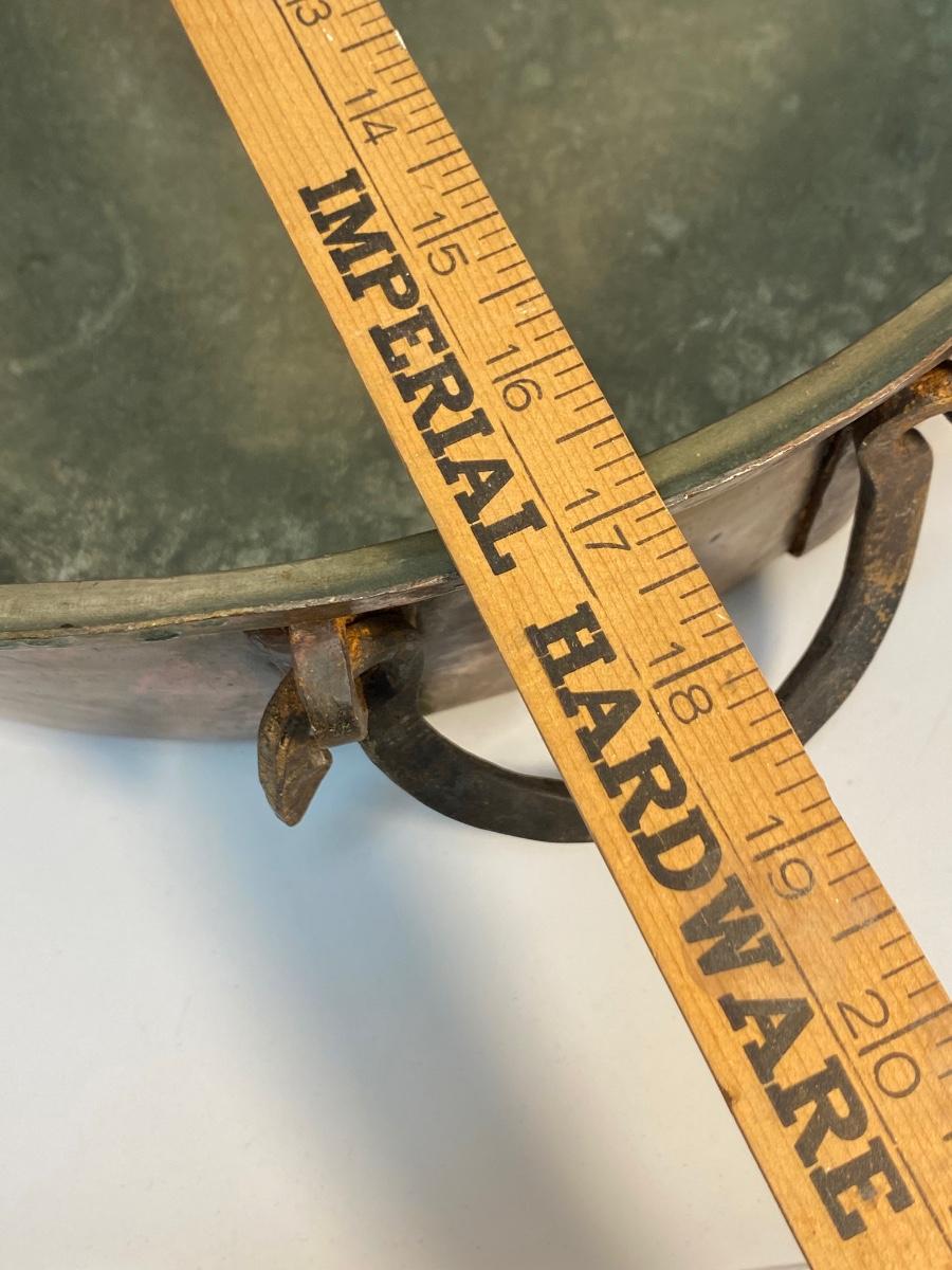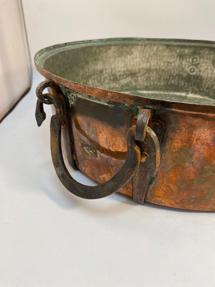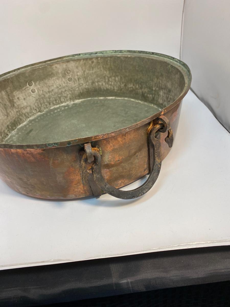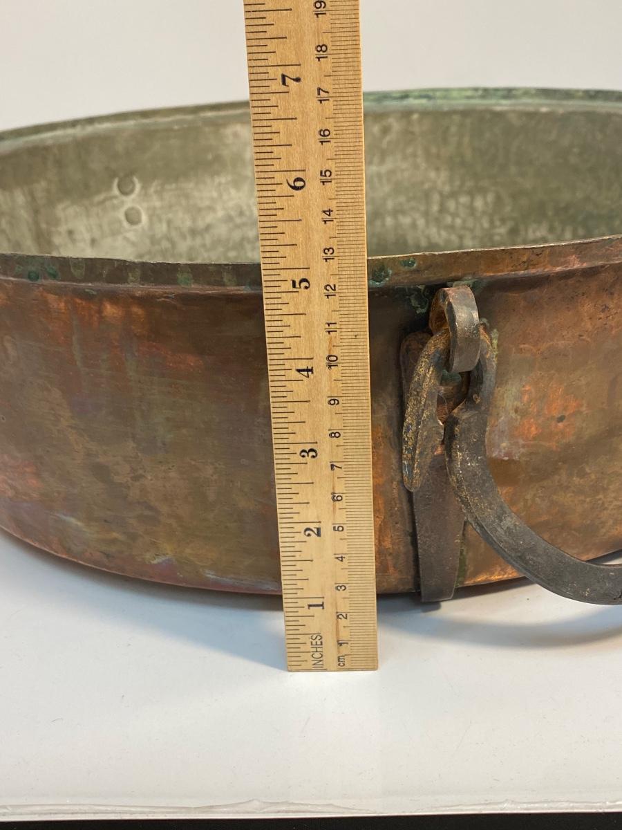 Vintage Large Shallow Hammered Copper Bucket Pail Pan with Handles. In good, aged condition. Displays great. Almost 18" diameter but only 5" deep. Iron handles on sides