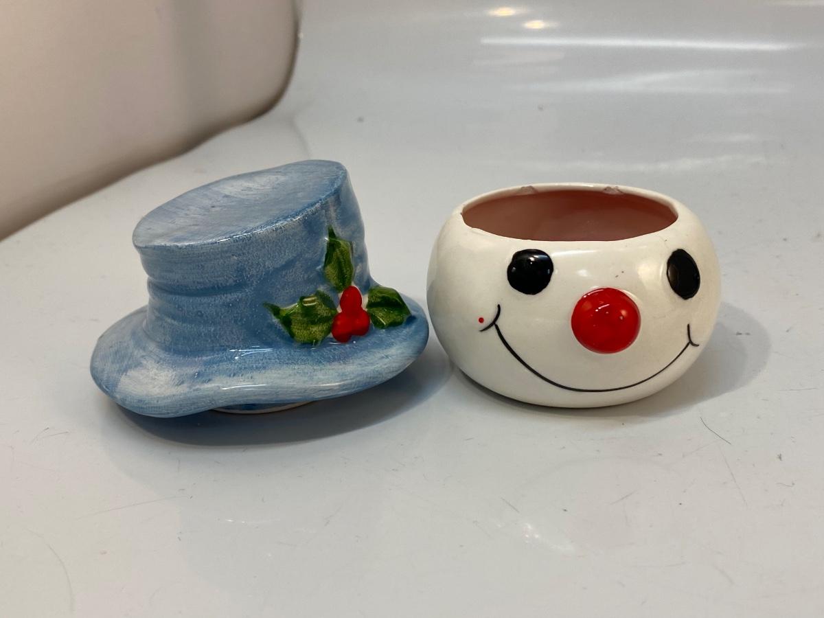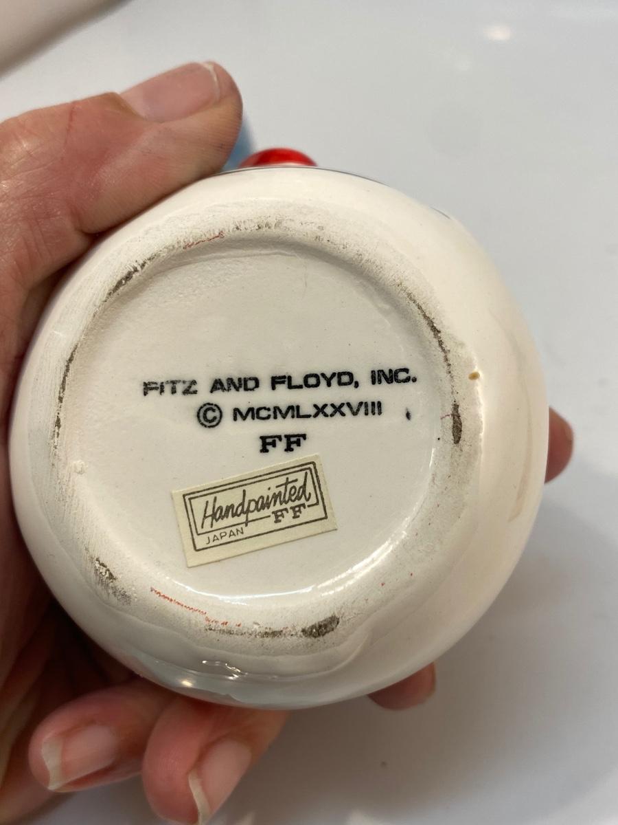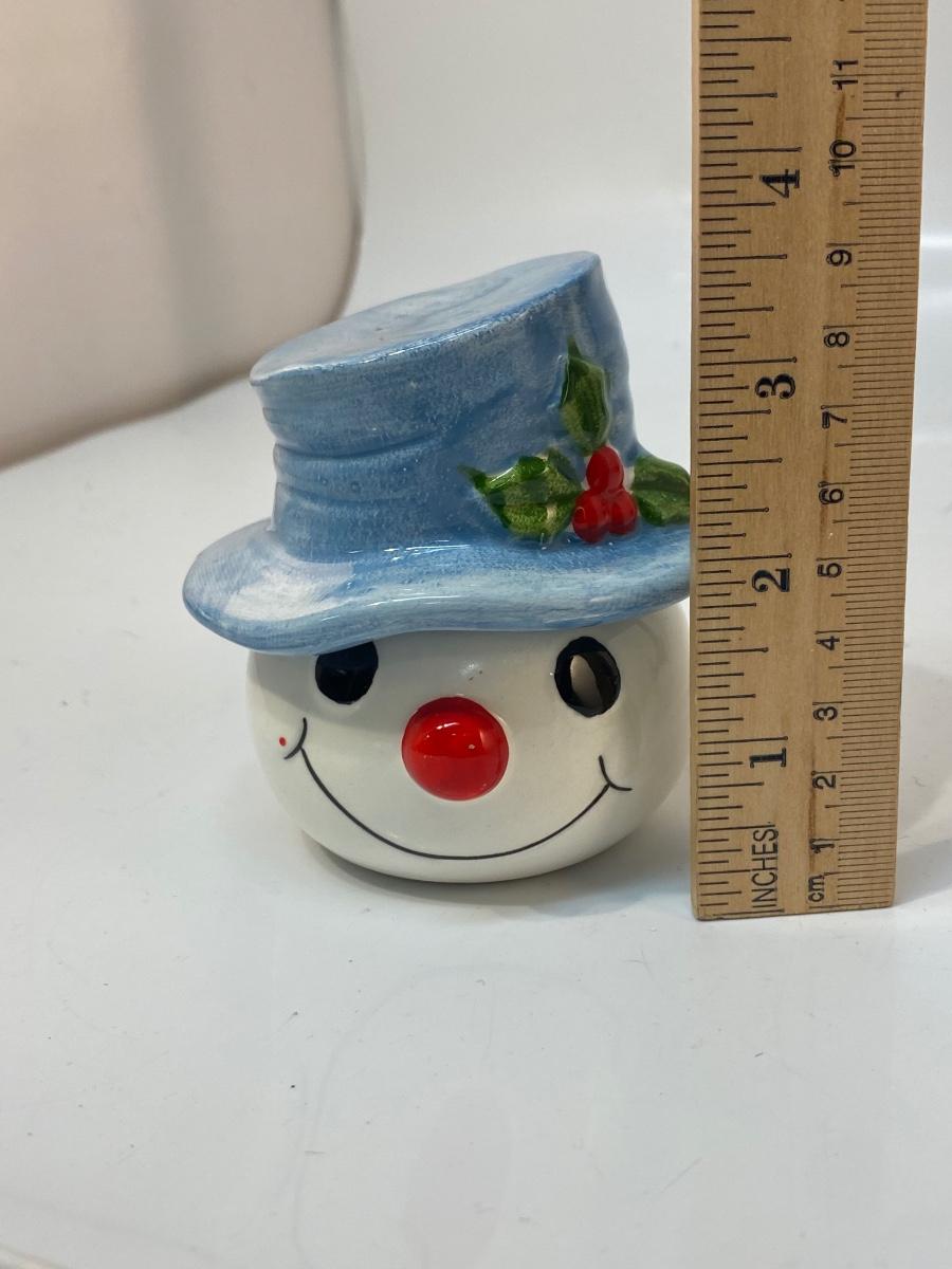 Vintage Fitz & Floyd 1978 Frosty the Snowman Hand Painted Candle Holder. Displays nicely. There are a couple of small chips along the edge around candle but if the hat is on Frosty's head they are unnoticeable. Original sticker attached to bottom