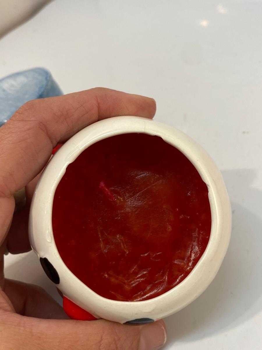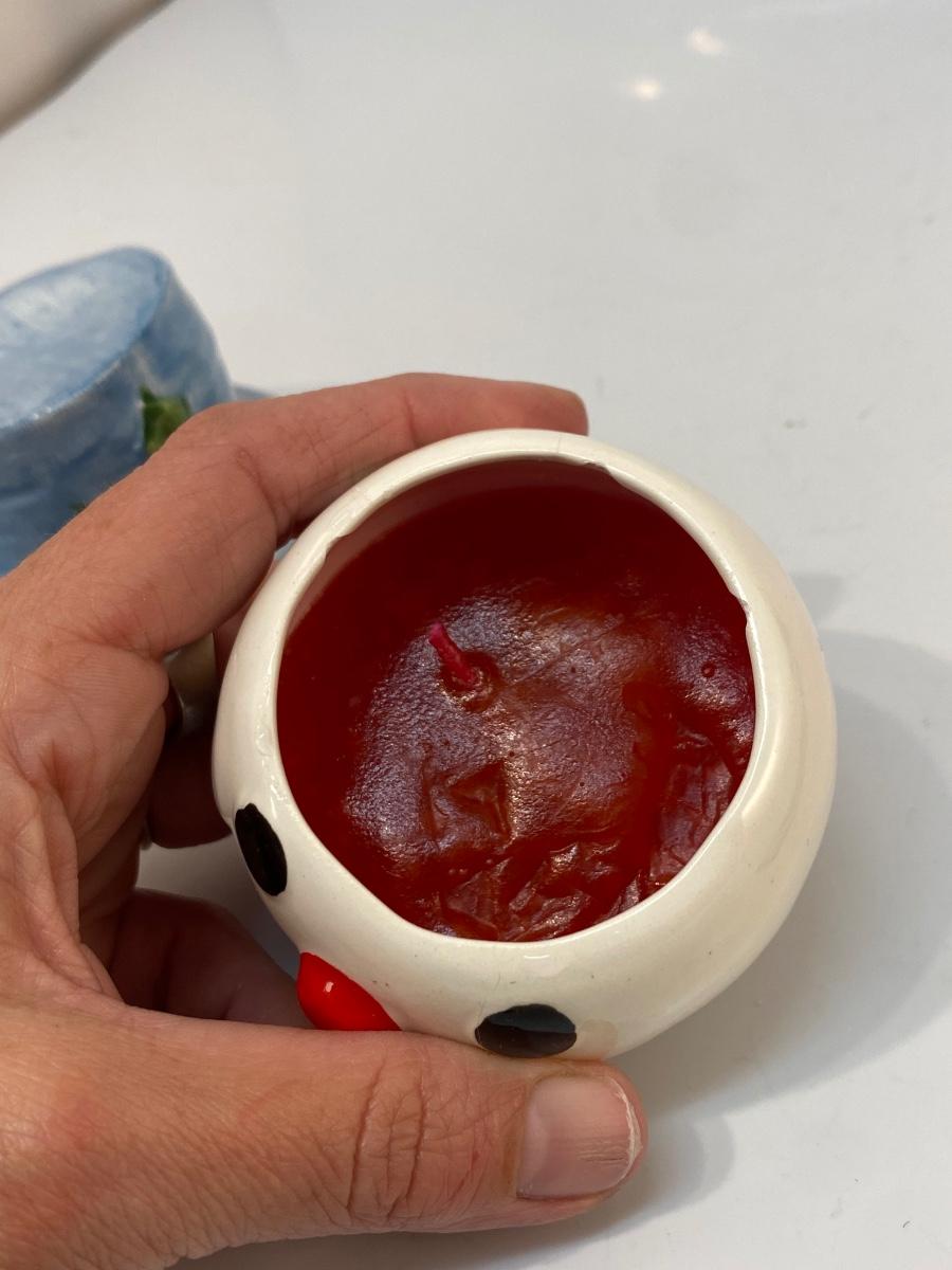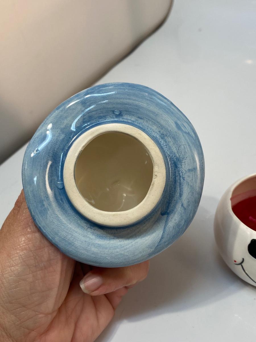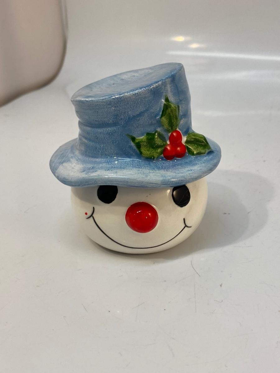 Vintage Fitz & Floyd 1978 Frosty the Snowman Hand Painted Candle Holder. Displays nicely. There are a couple of small chips along the edge around candle but if the hat is on Frosty's head they are unnoticeable. Original sticker attached to bottom