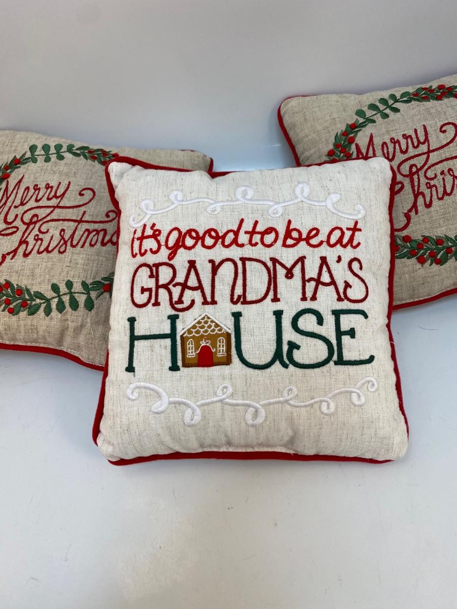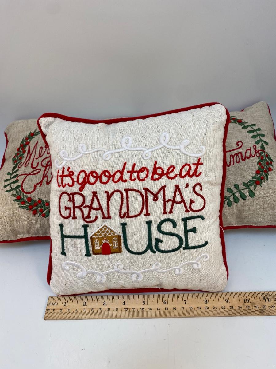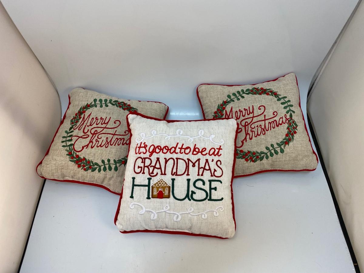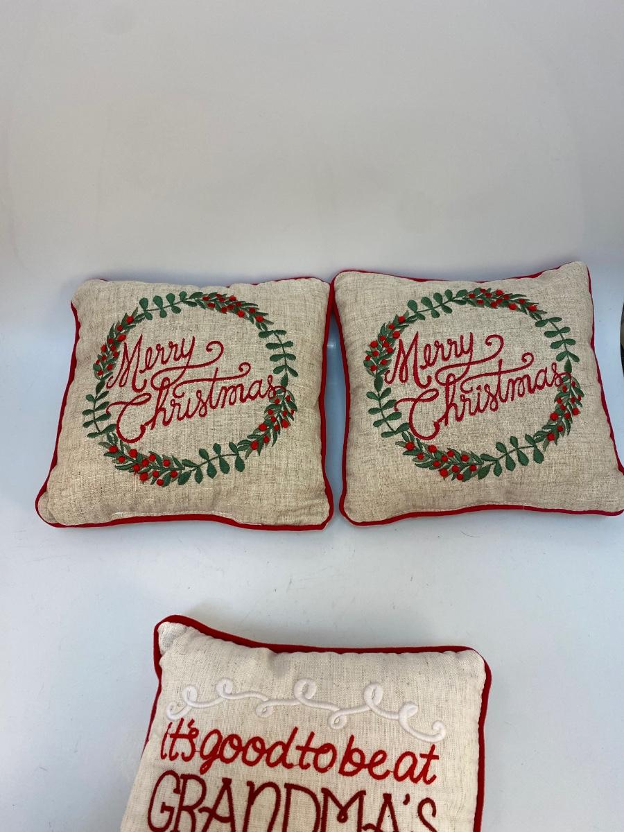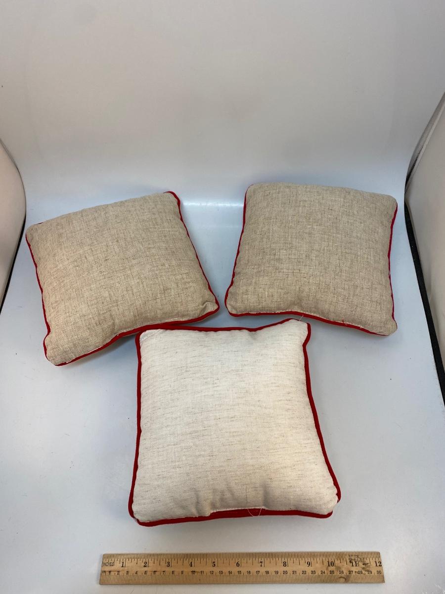 Set of 3 Small Christmas Holiday Rustic Cottage Style Throw Pillows. In good condition. About 9" square.