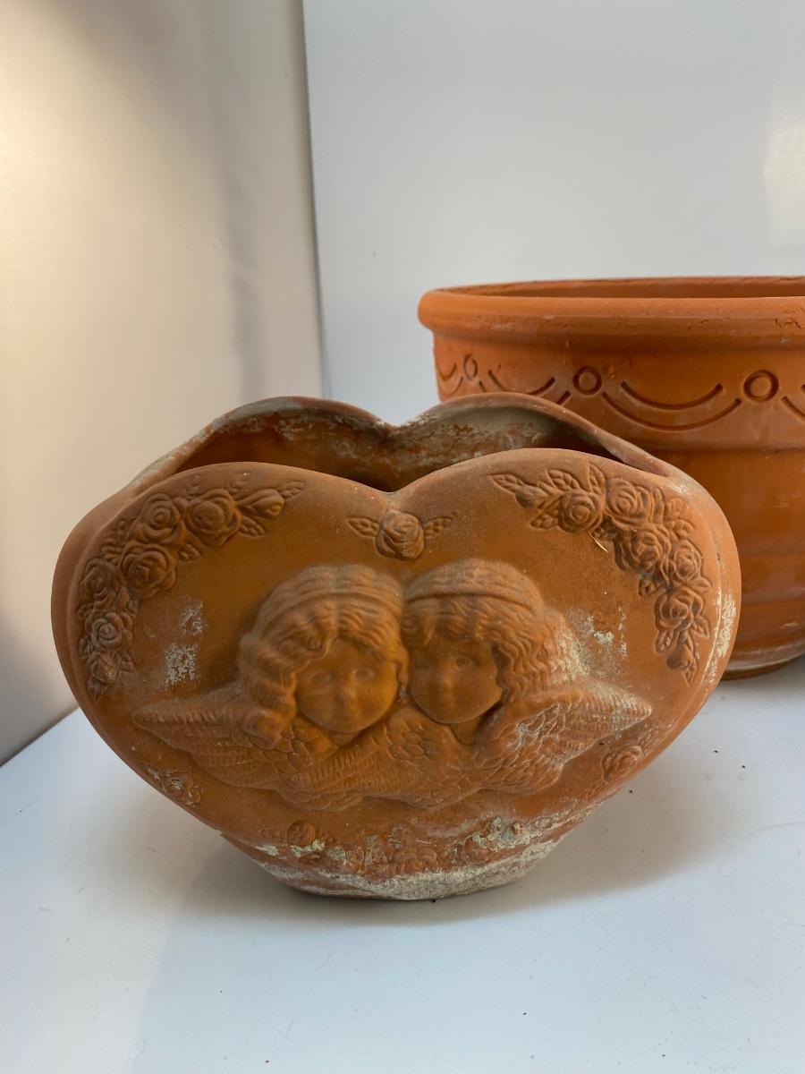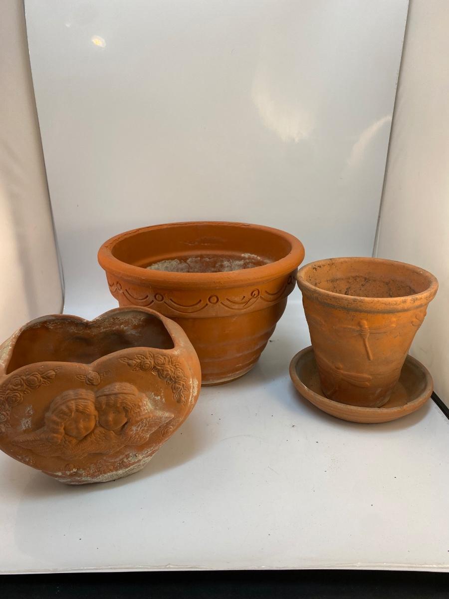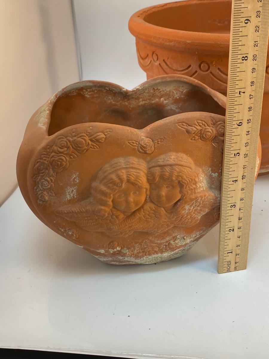 Lot of Terracotta Garden Yard Art Pottery Planters Cherub Angels, Dragon Fly Pattern, & More
