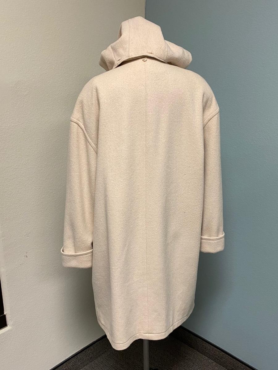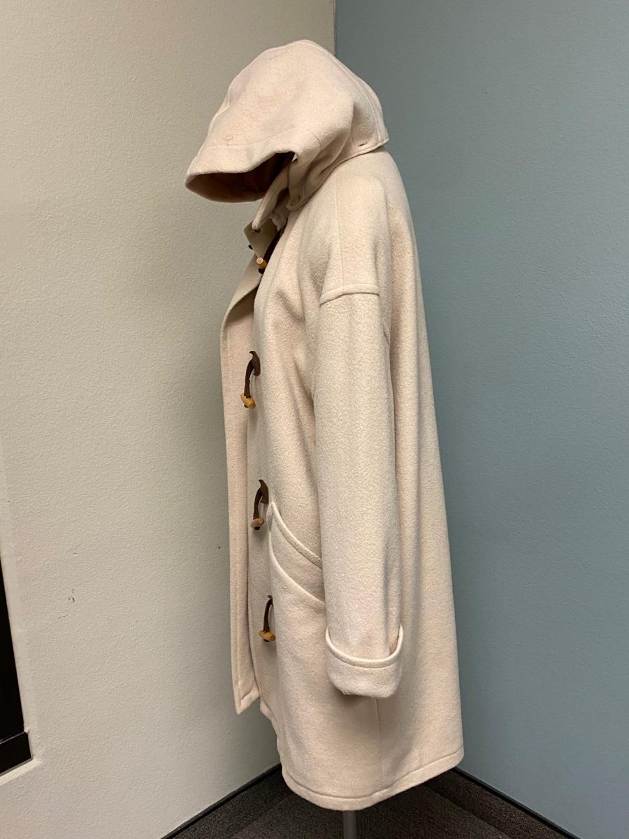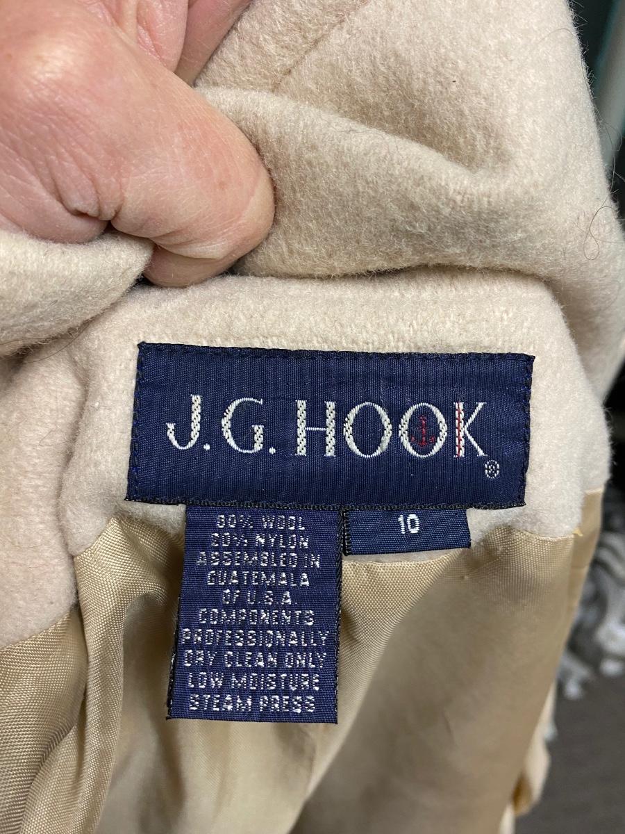 J.G. Hook Off White Wool Blend Knee Length Winter Trench Coat Jacket with Hood. Removeable hood. A couple of spots but they look surface, may just need to be cleaned. Size 10.