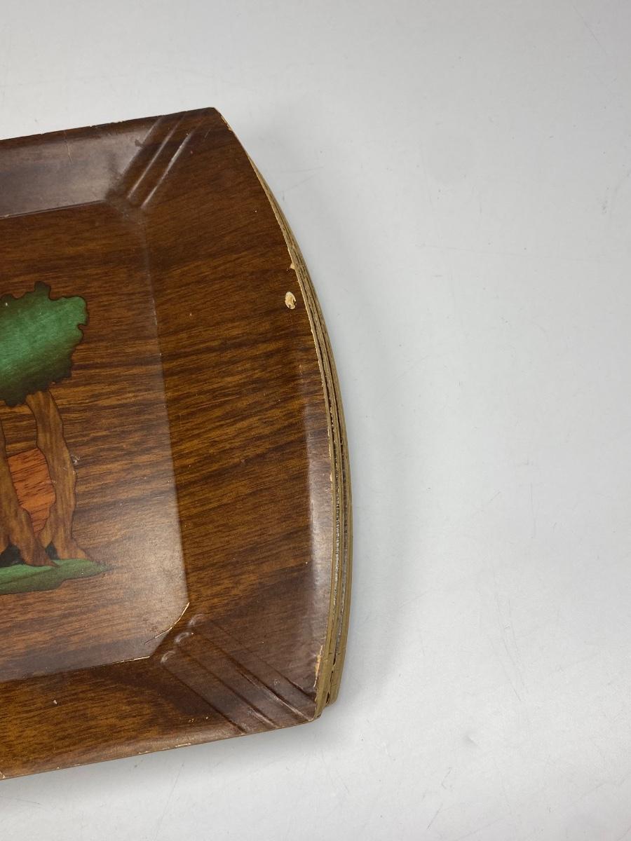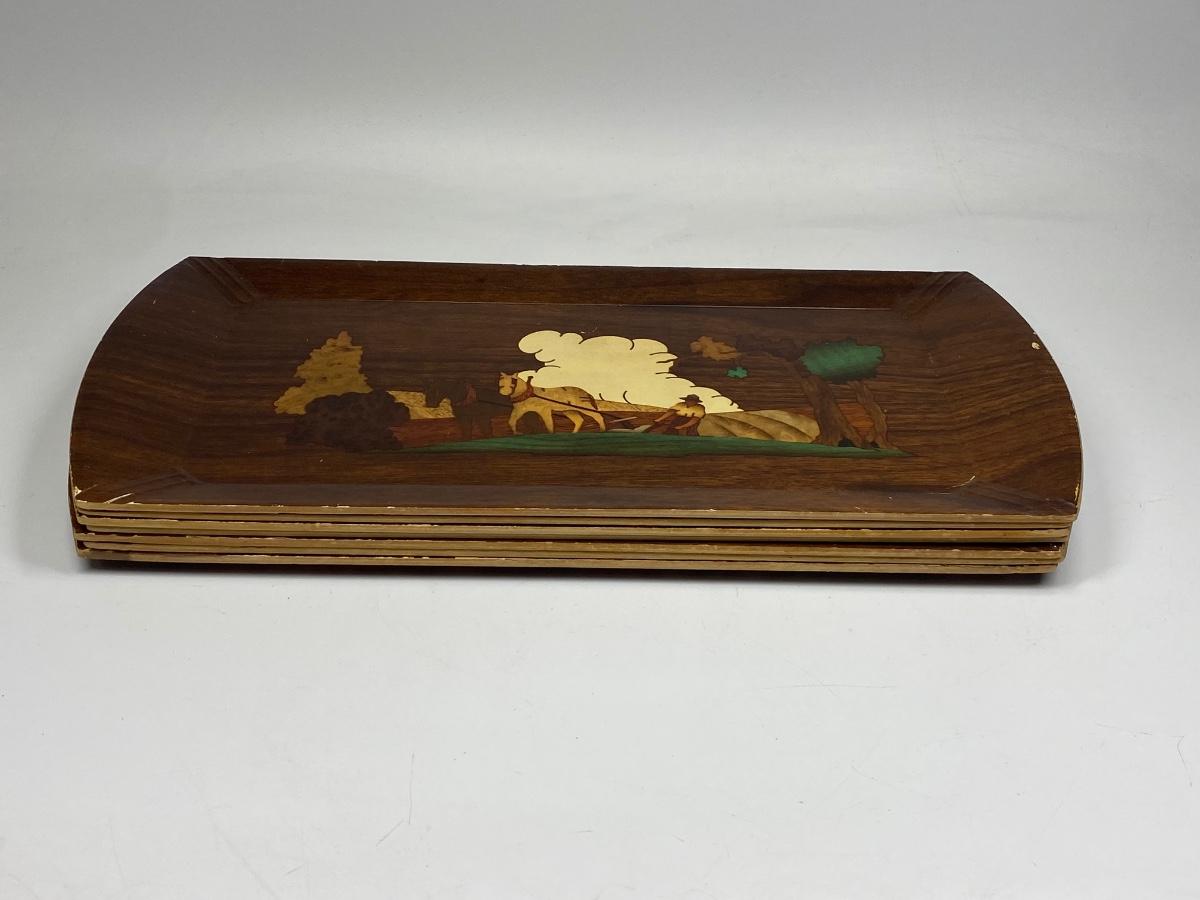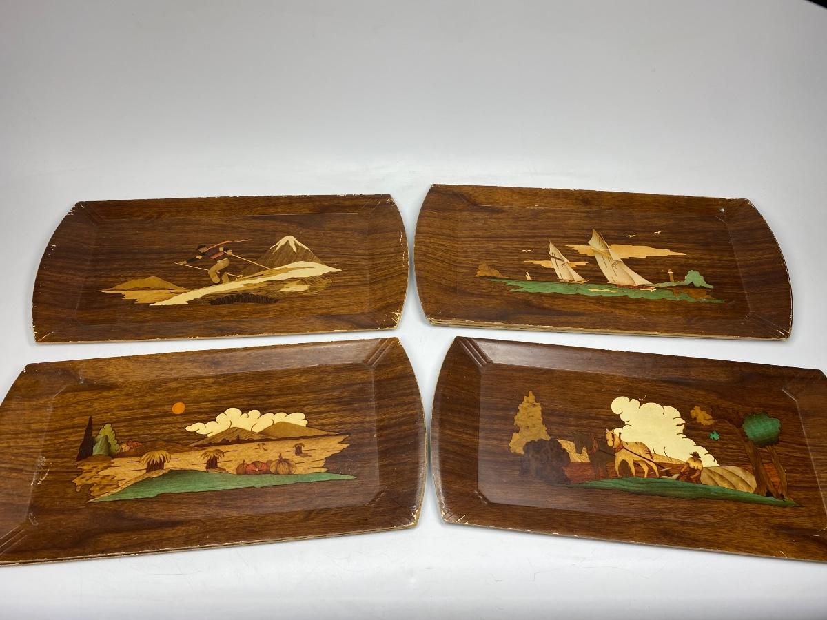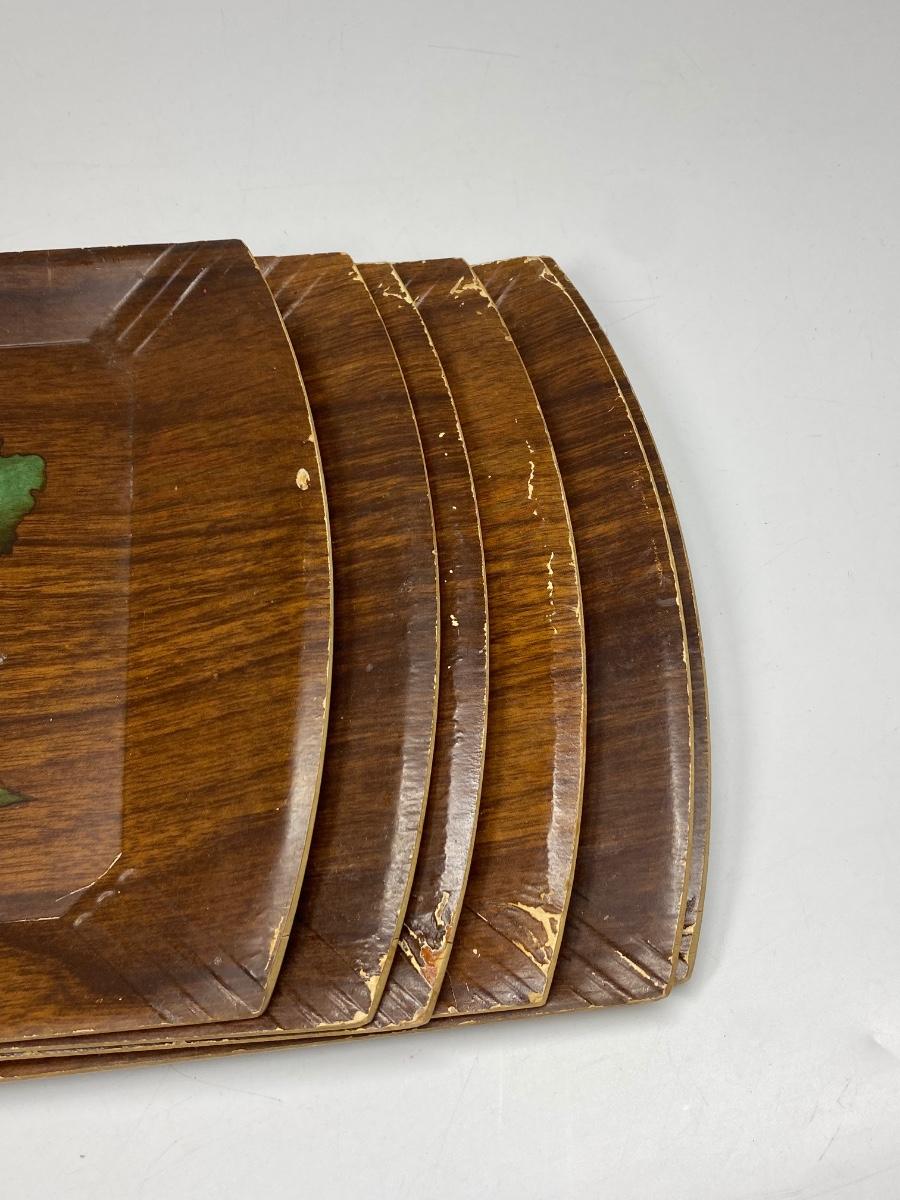 Set of 8 Vintage Hasko Wood Covered Lithographed Paper Serving Trays 4 Patterns