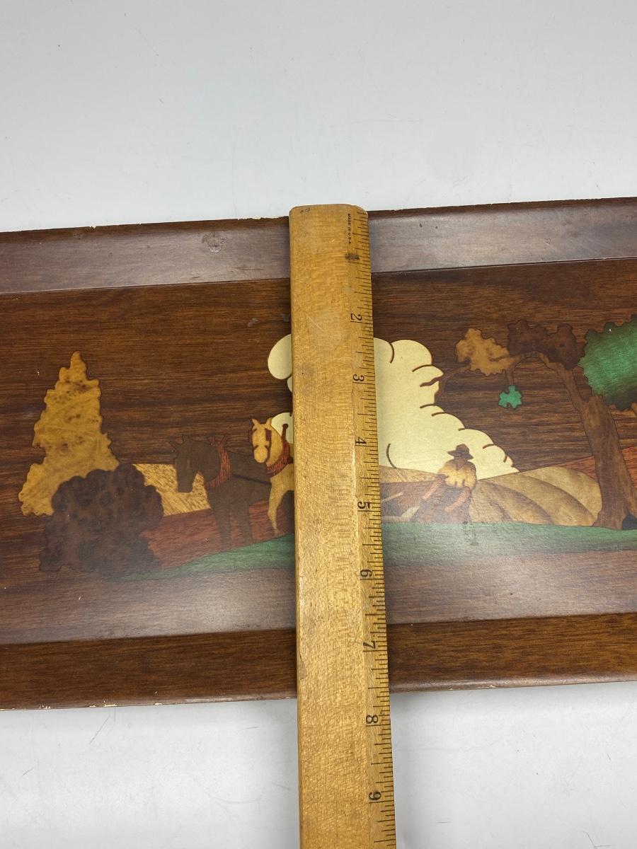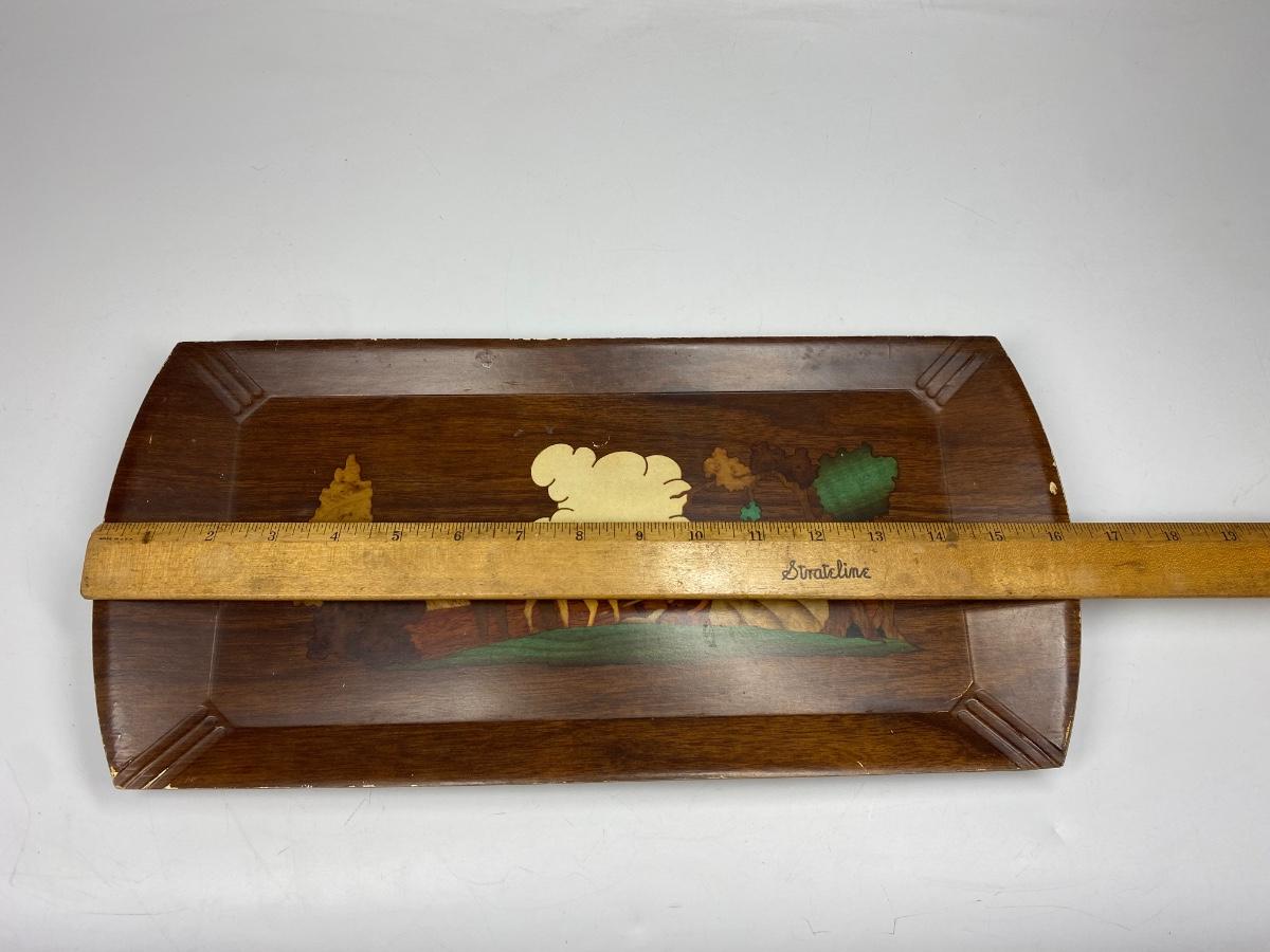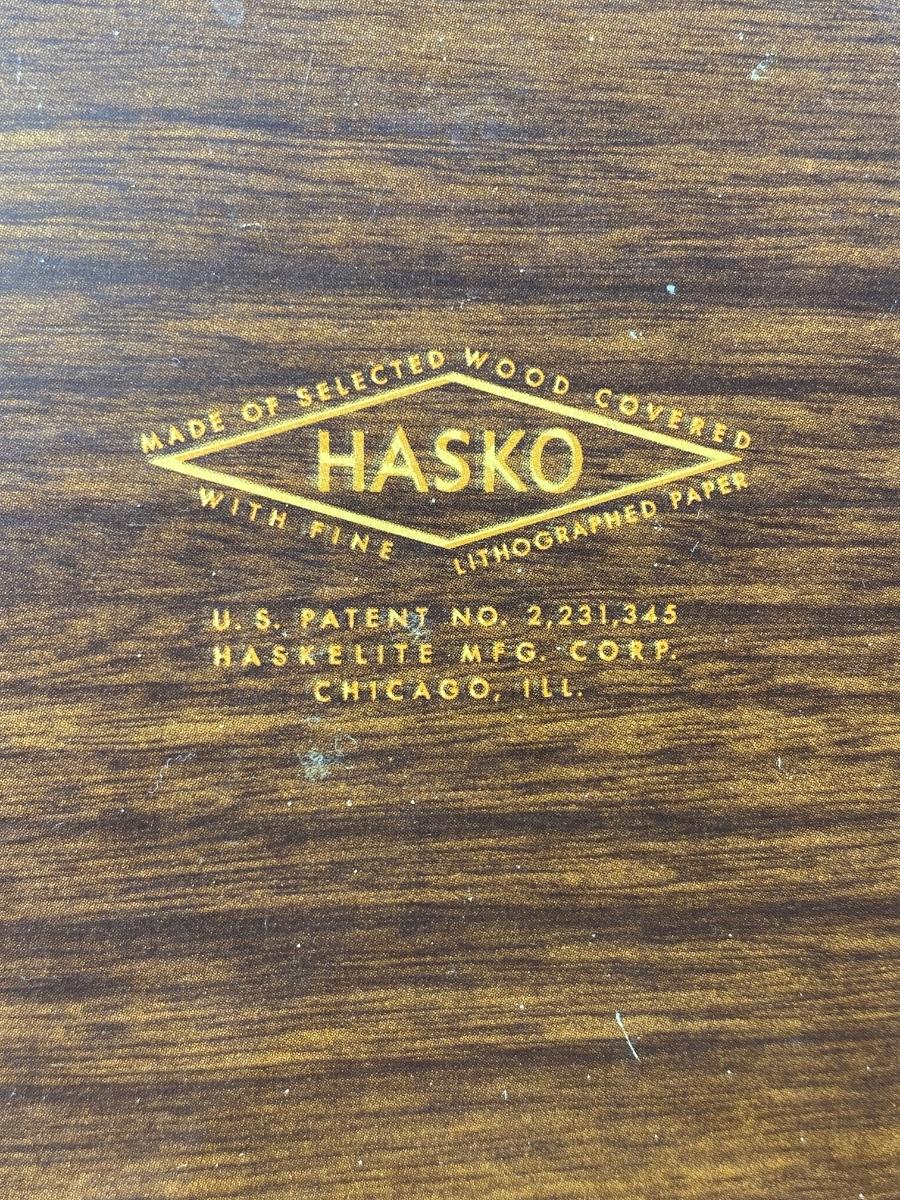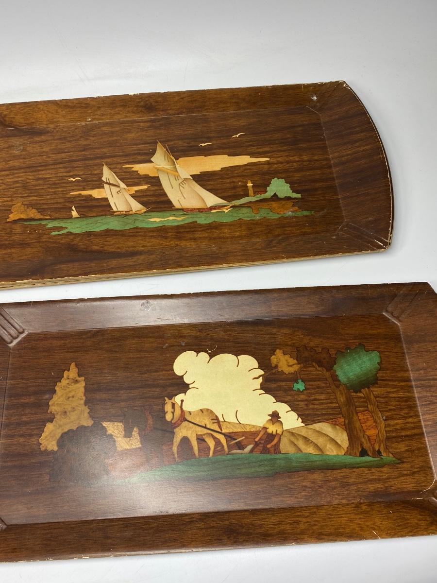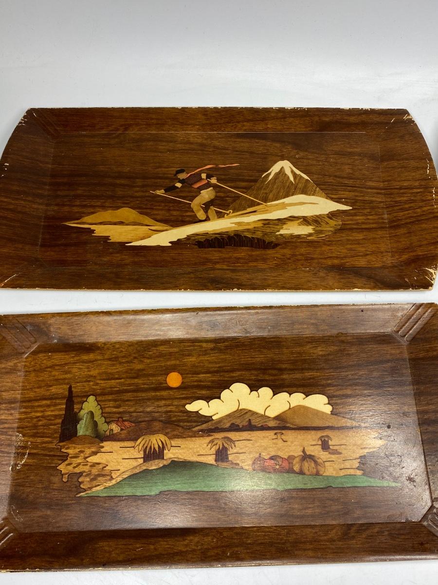 Set of 8 Vintage Hasko Wood Covered Lithographed Paper Serving Trays 4 Patterns. All have some signs of use and wear, mostly at edges. About 16"x8" size.