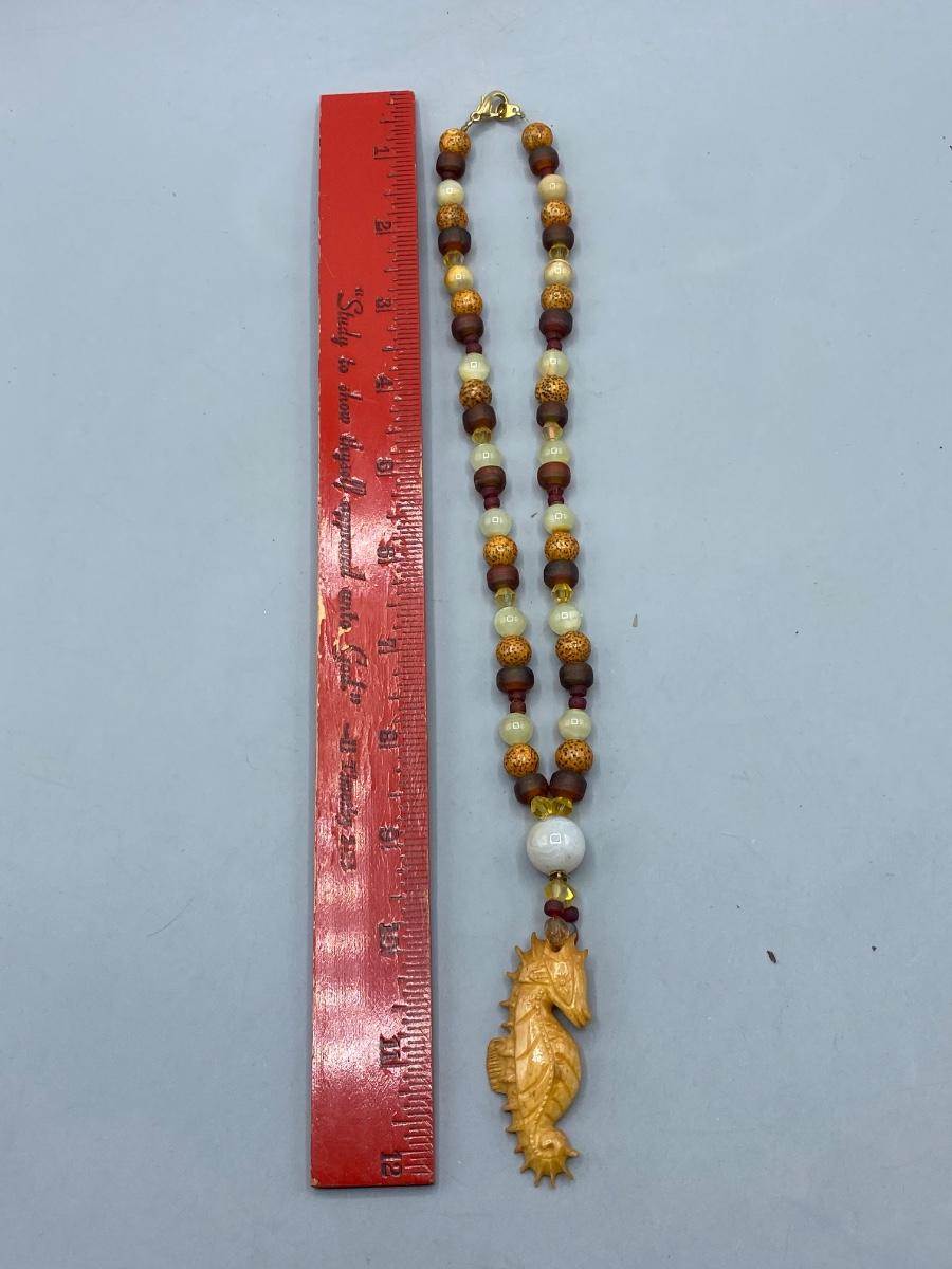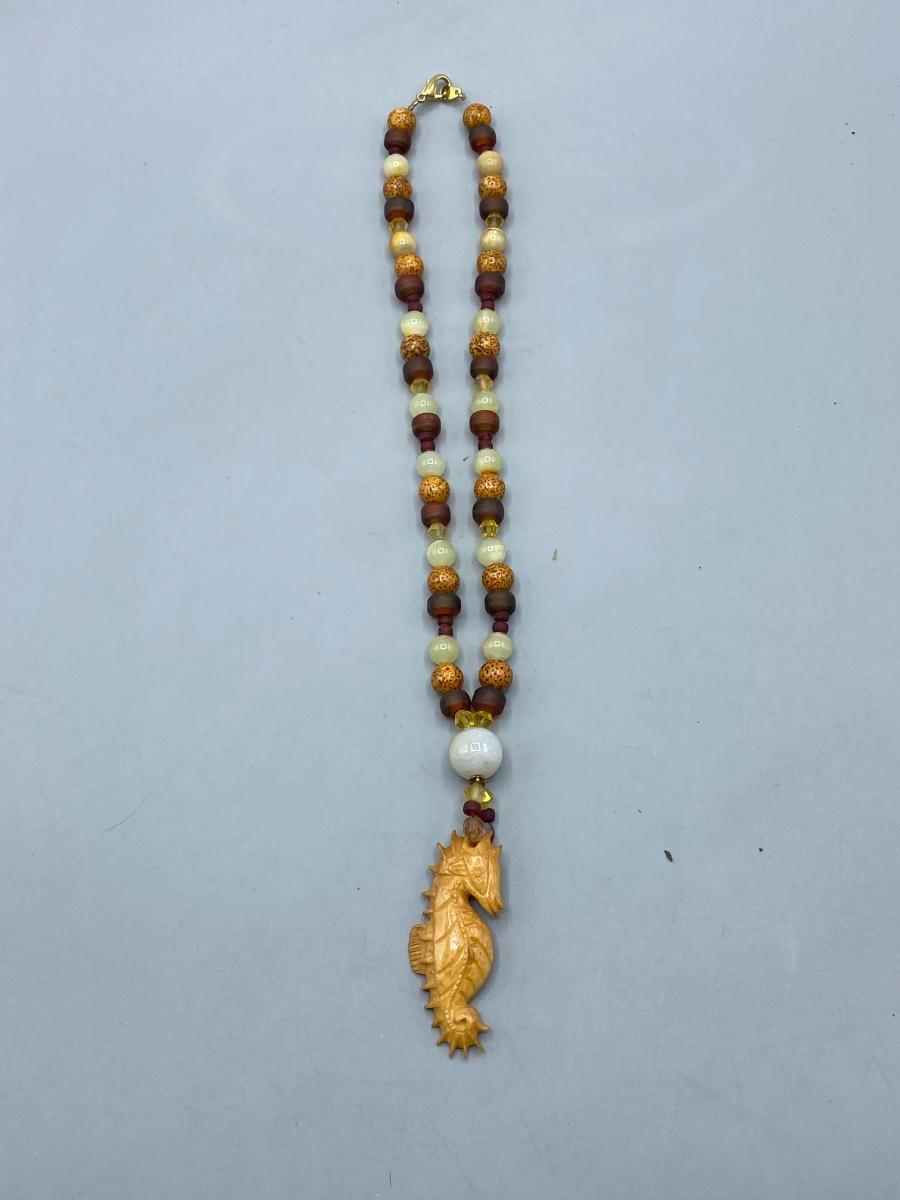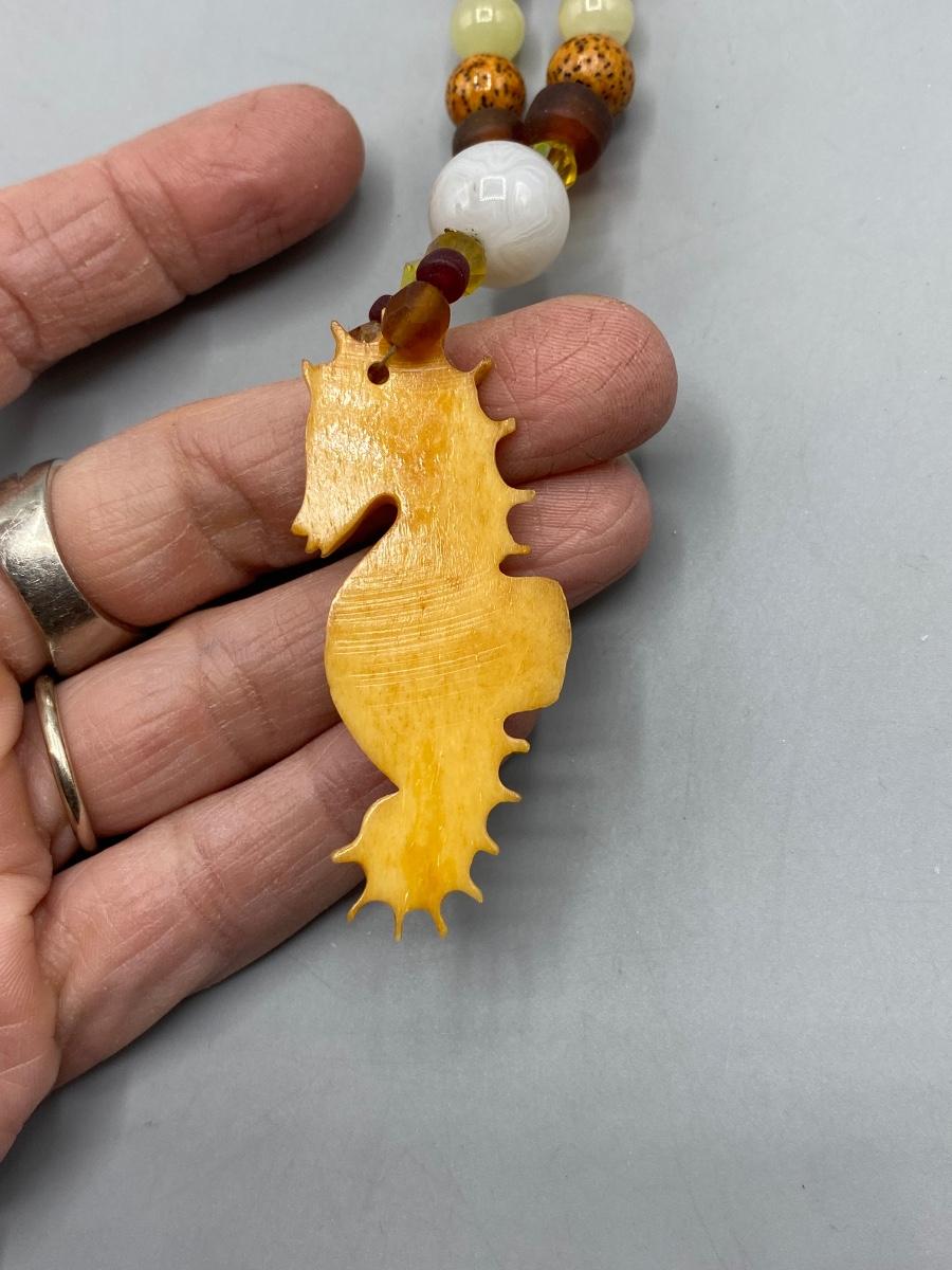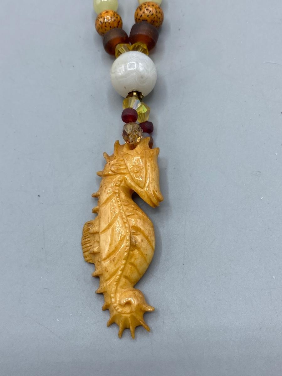 Beachy Nautical Carved Seahorse Beaded Pendant Necklace. Seahorse is either a lightweight resin or lacquered wood. Good condition.