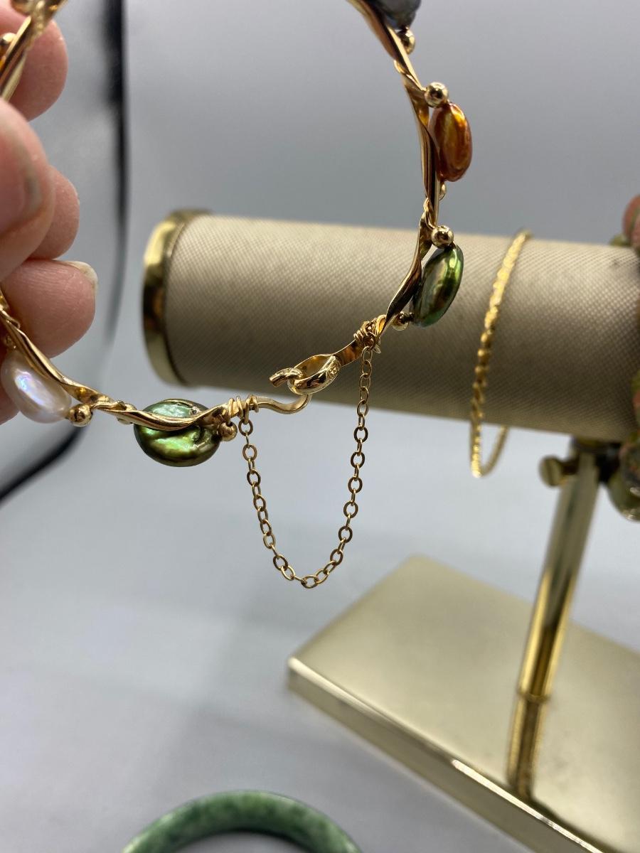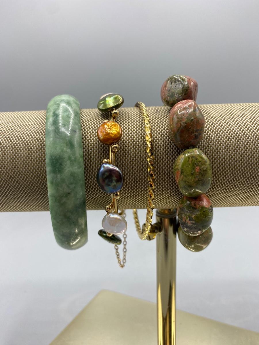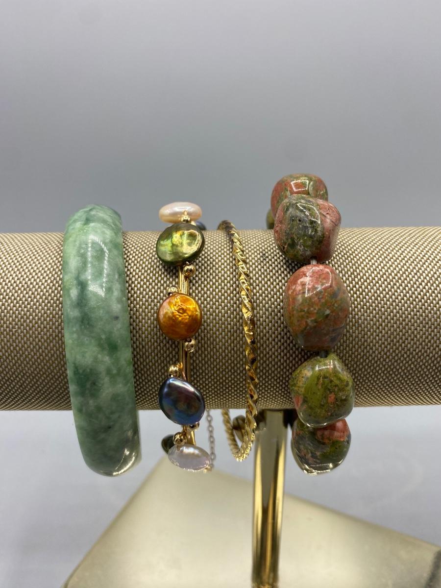 Gold Tone & Polished Stone Fashion Bracelets Bangle Stretch. Solid green jade like stone bangle, gold tone metal art bracelet with metallic beads, thin gold tone twisted metal bangle, and a pink and green polished stone stretch bracelet. Everything in good condition.