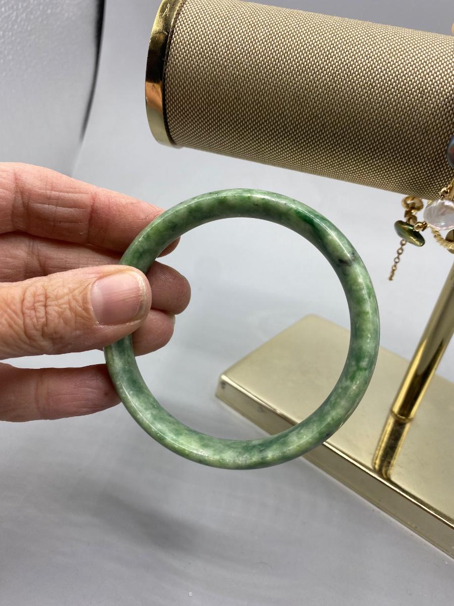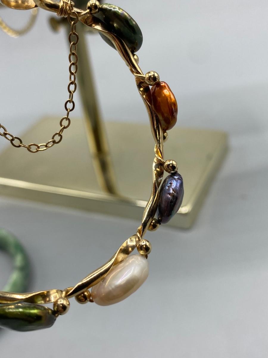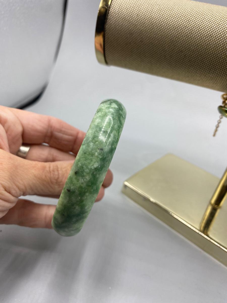 Gold Tone & Polished Stone Fashion Bracelets Bangle Stretch. Solid green jade like stone bangle, gold tone metal art bracelet with metallic beads, thin gold tone twisted metal bangle, and a pink and green polished stone stretch bracelet. Everything in good condition.