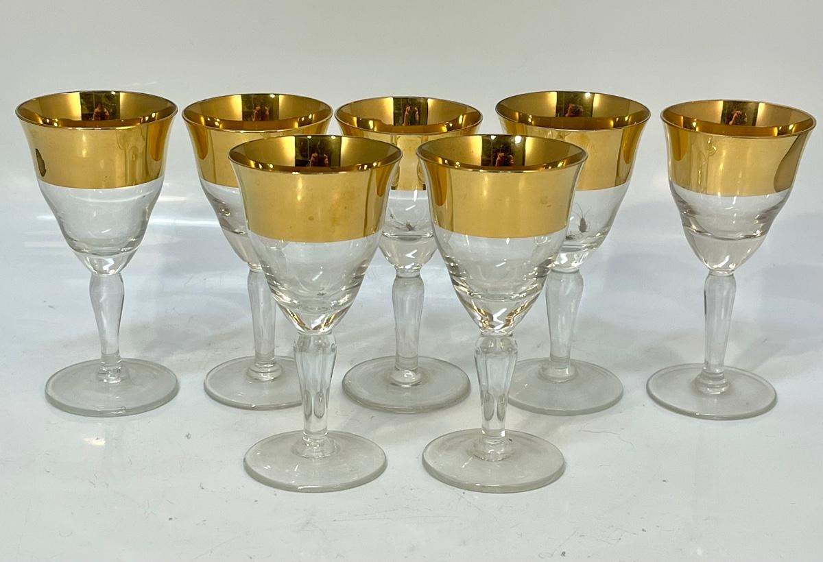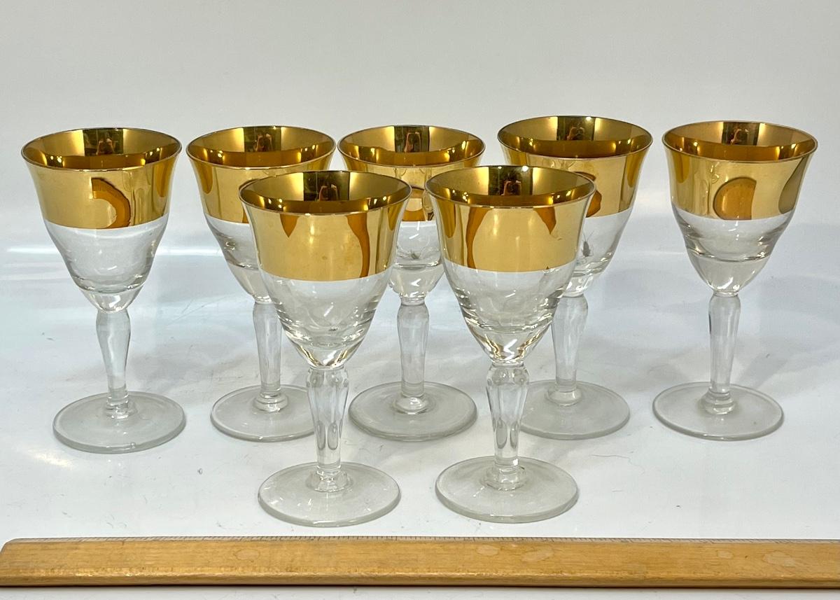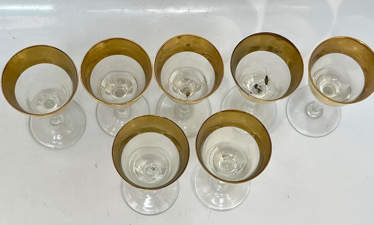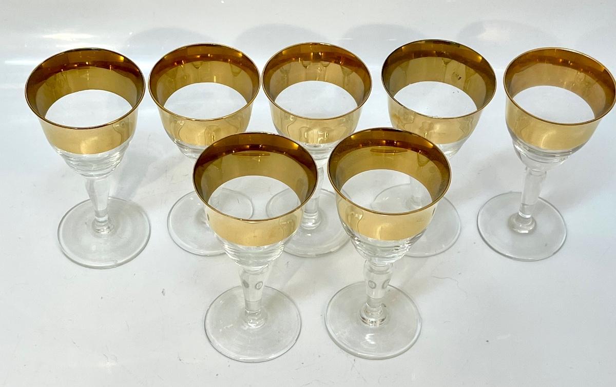 Vintage Wide Gold Rim Cordial Small Wine Drink Glasses Stemware. In good vintage condition. Little to no wear on the glasses. Set of 7.