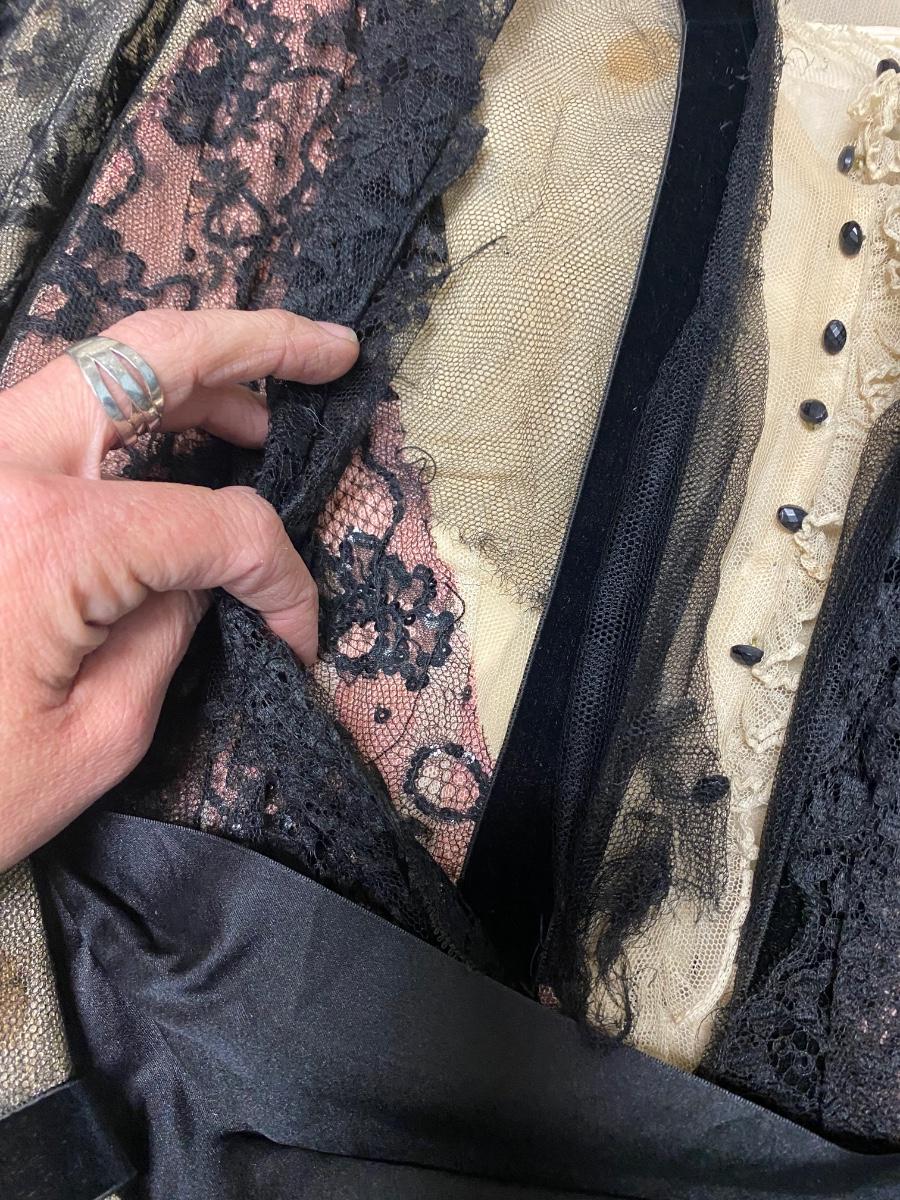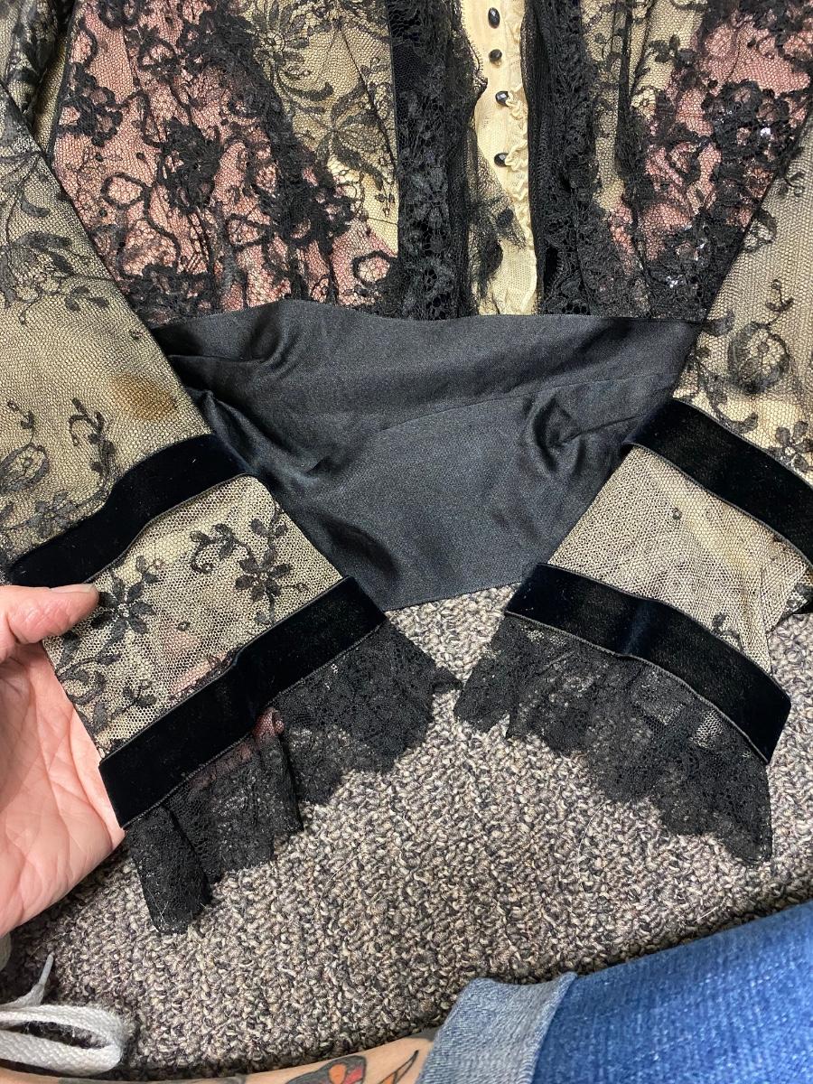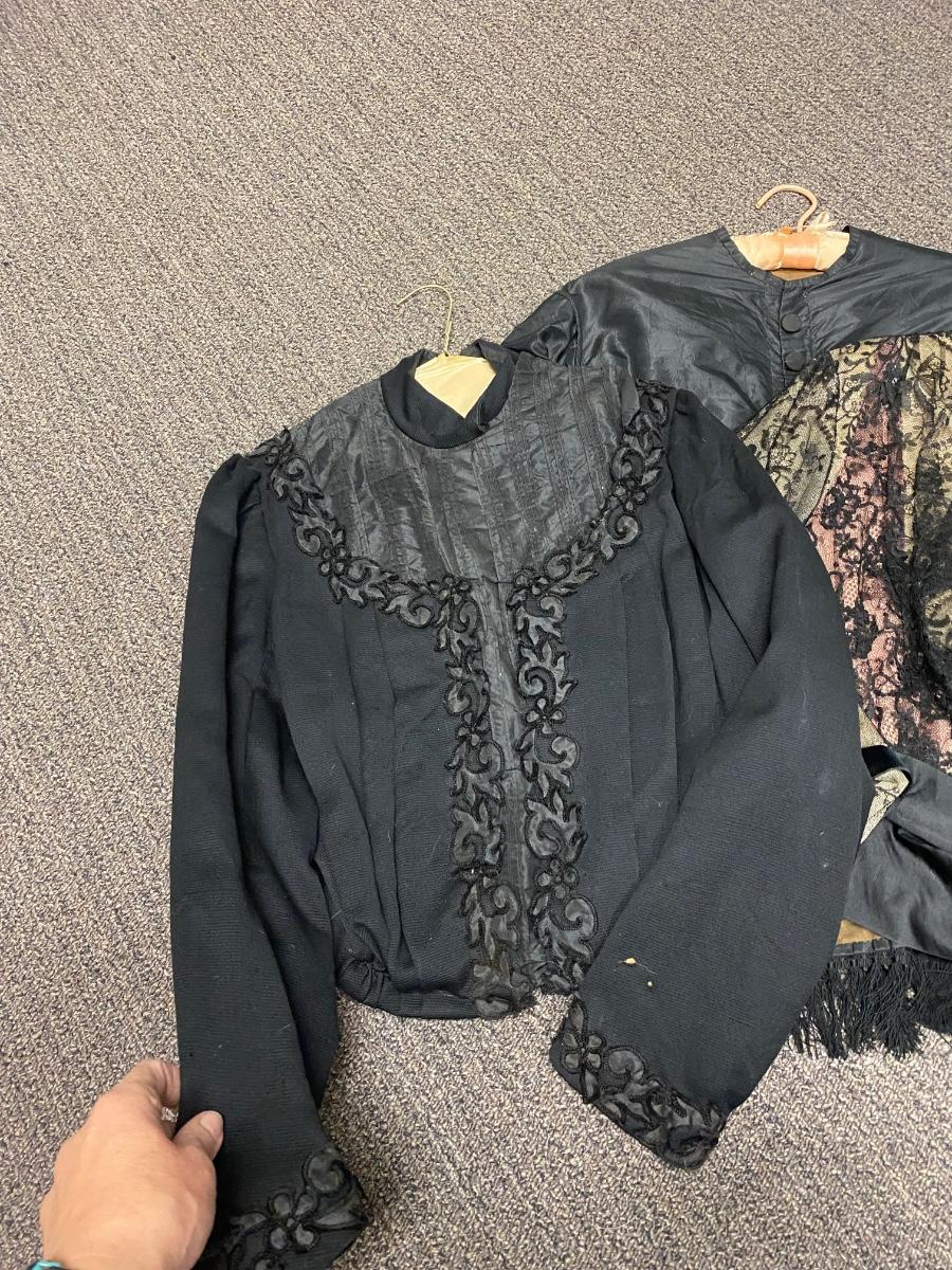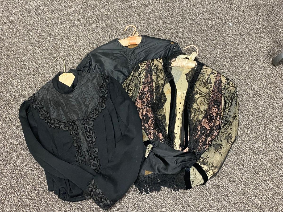 Set of 3 Black Gothic Mourning Lace Cotton Antique Vintage Victorian Blouses Tops. In vintage condition. There is some wear and a couple spots wear the material is ripping from age. Did find a couple of straight pins at seems so previous owner may have been repairing or altering at one time. Size medium/small.