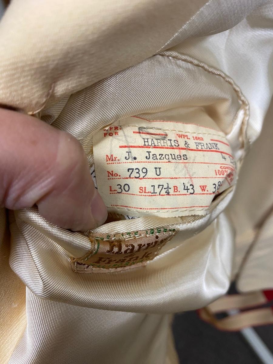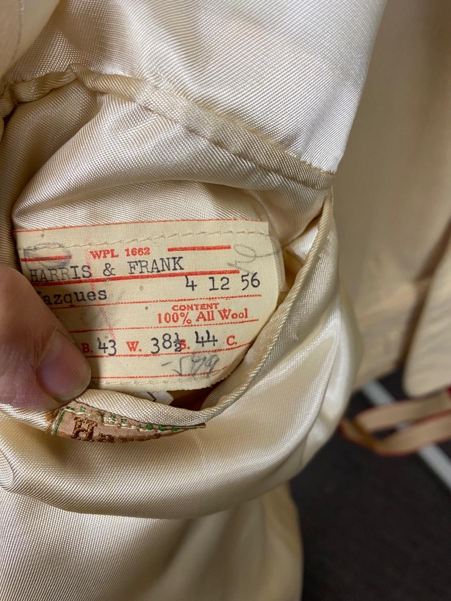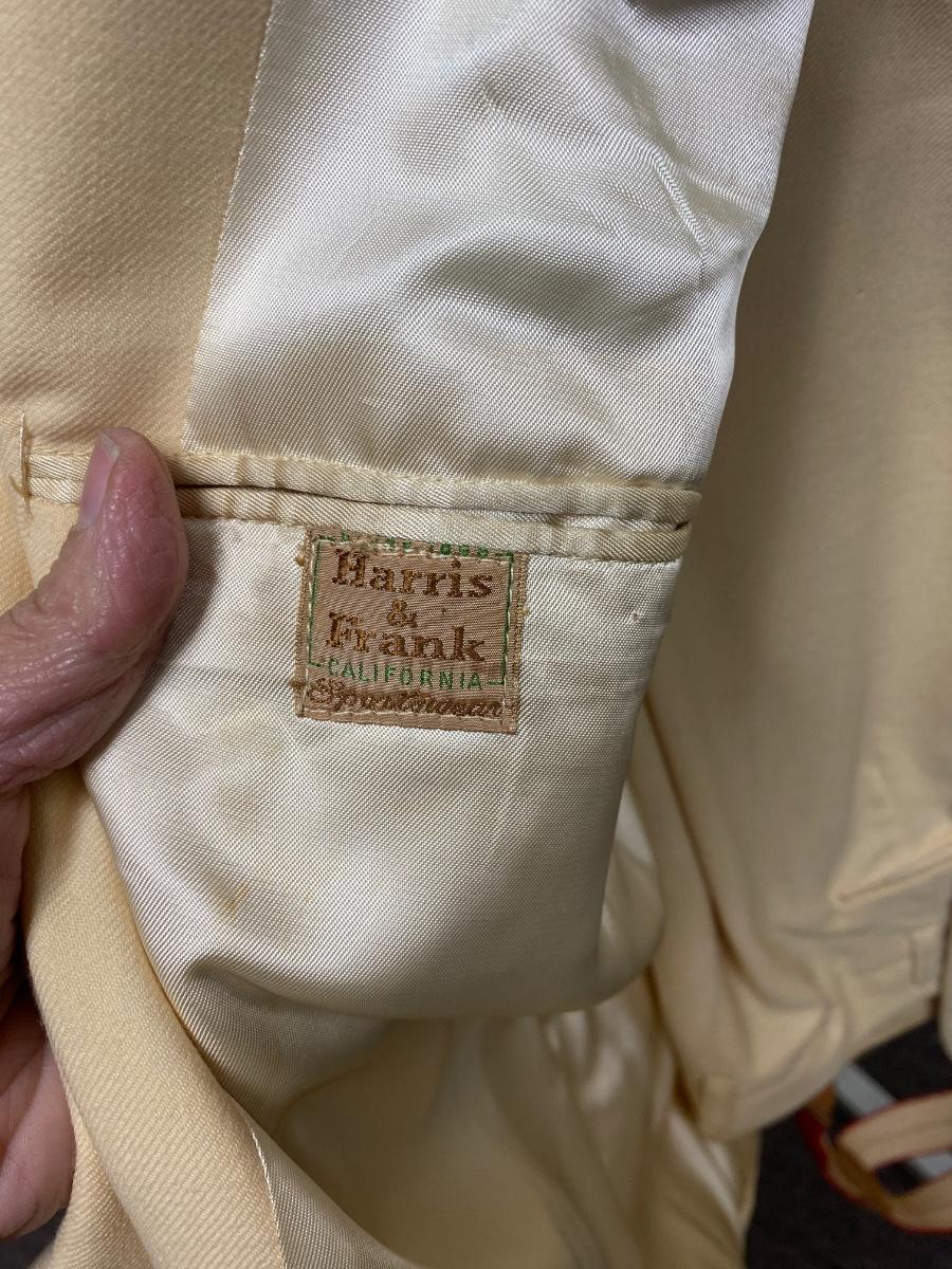 Vintage Harris & Frank Men's All Wool Off-White Sports Jacket and Pants Suit. In vintage condition. No major spots but did find a few tiny moth holes. Dated 1956 inside along with measurements. These measurements probably fit with the other men's suits on auction currently as they are from the same estate and most belong to the same person.