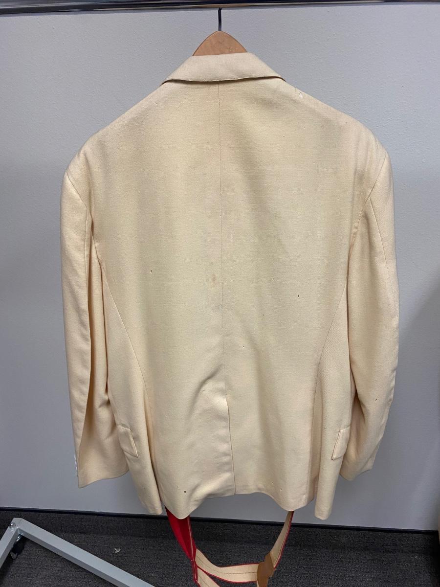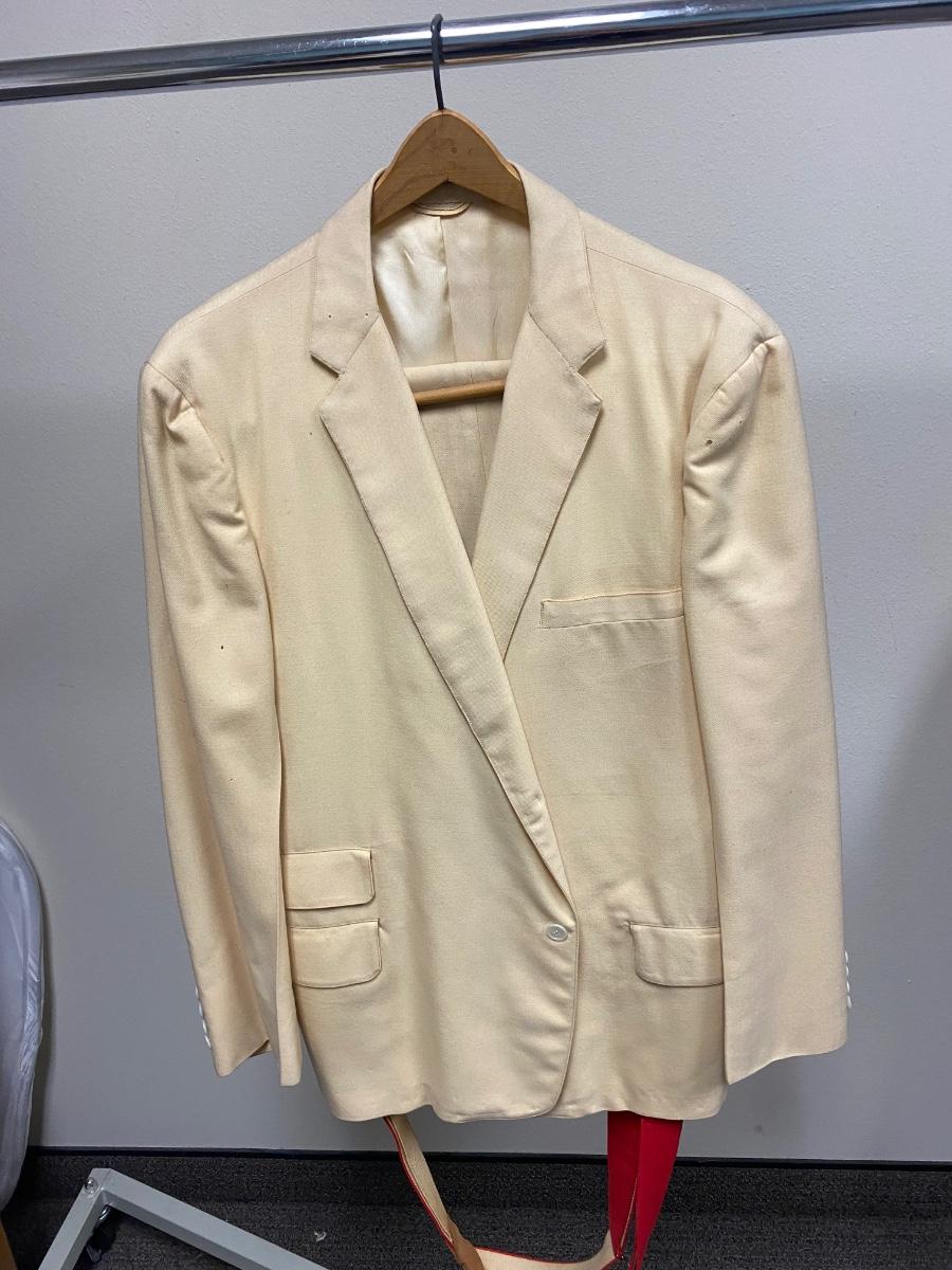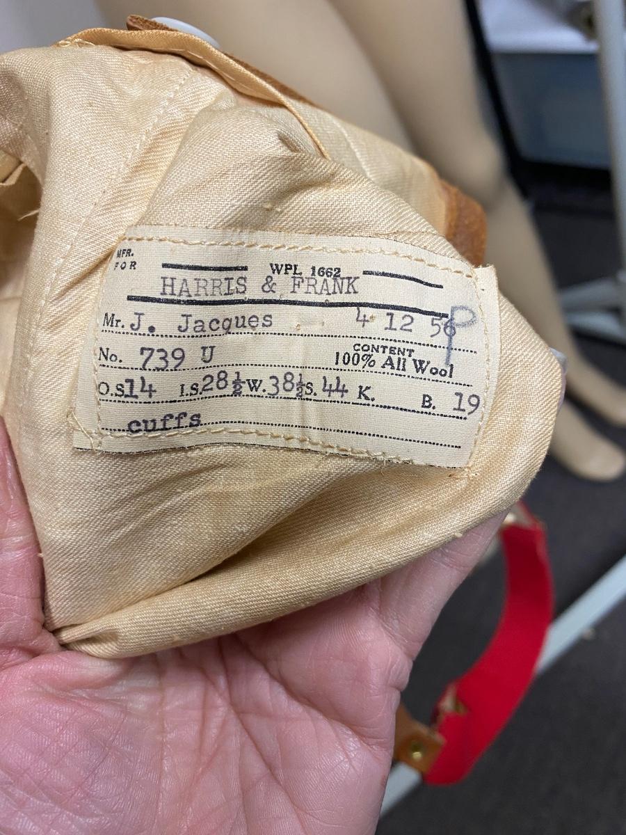 Vintage Harris & Frank Men's All Wool Off-White Sports Jacket and Pants Suit. In vintage condition. No major spots but did find a few tiny moth holes. Dated 1956 inside along with measurements. These measurements probably fit with the other men's suits on auction currently as they are from the same estate and most belong to the same person.