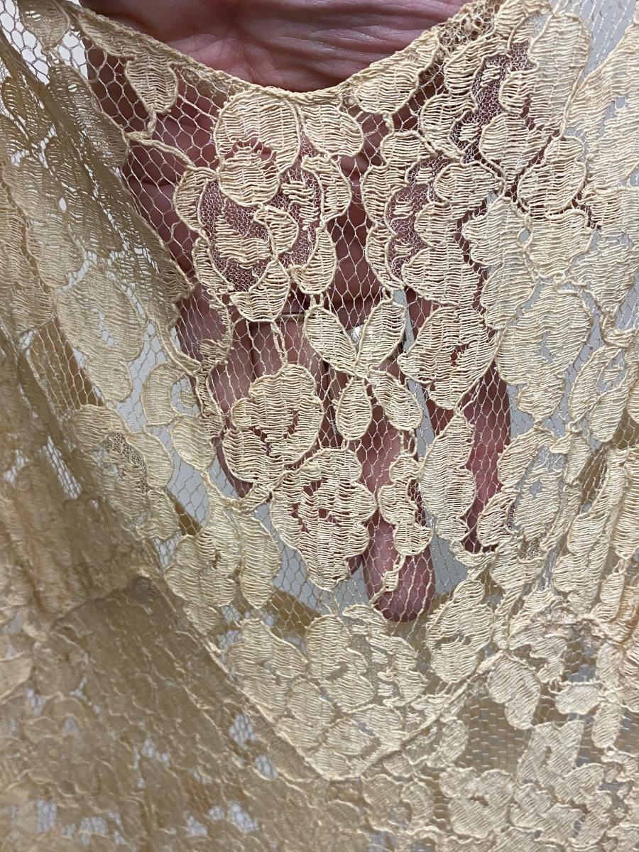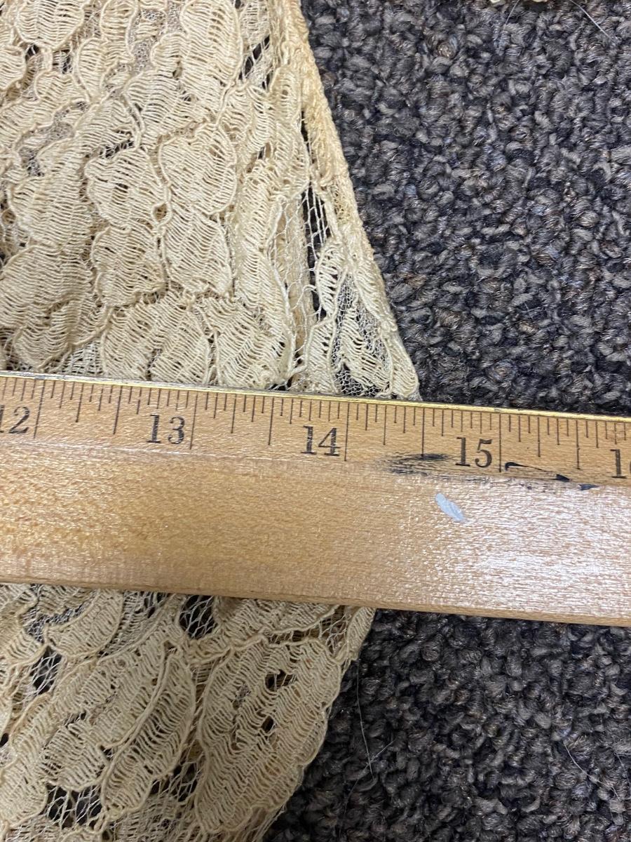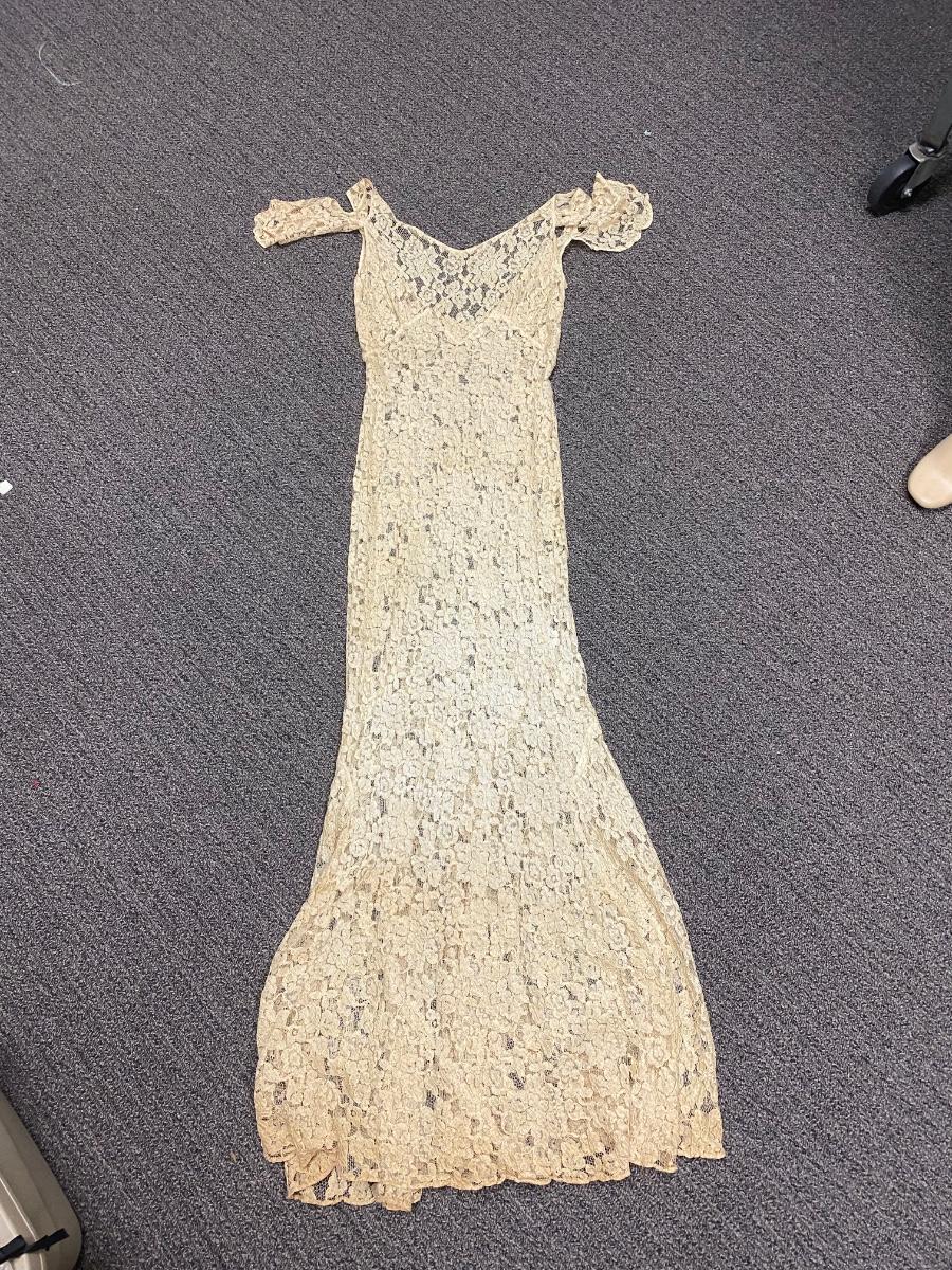 Antique Vintage Victorian Floor Length Floral Lace Dress Unlined. Fitted floor length dress. There is discoloration but no obvious stains, didn't notice any major holes either. Small body con style, About 14" at armpit, 12" at waist.